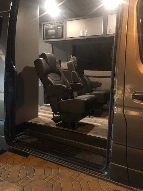 Seats 4 with DOT-approved seat belts (swivel front captain chairs + 2 swivel rear captain chairs)