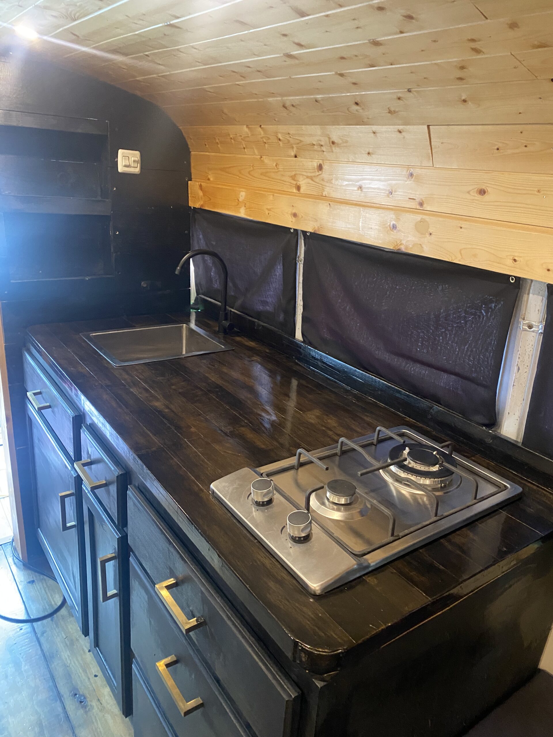 - 6 feet of counter space with Propane Stove, running water (with automatic water pump), and ample under counter storage with drawers.
