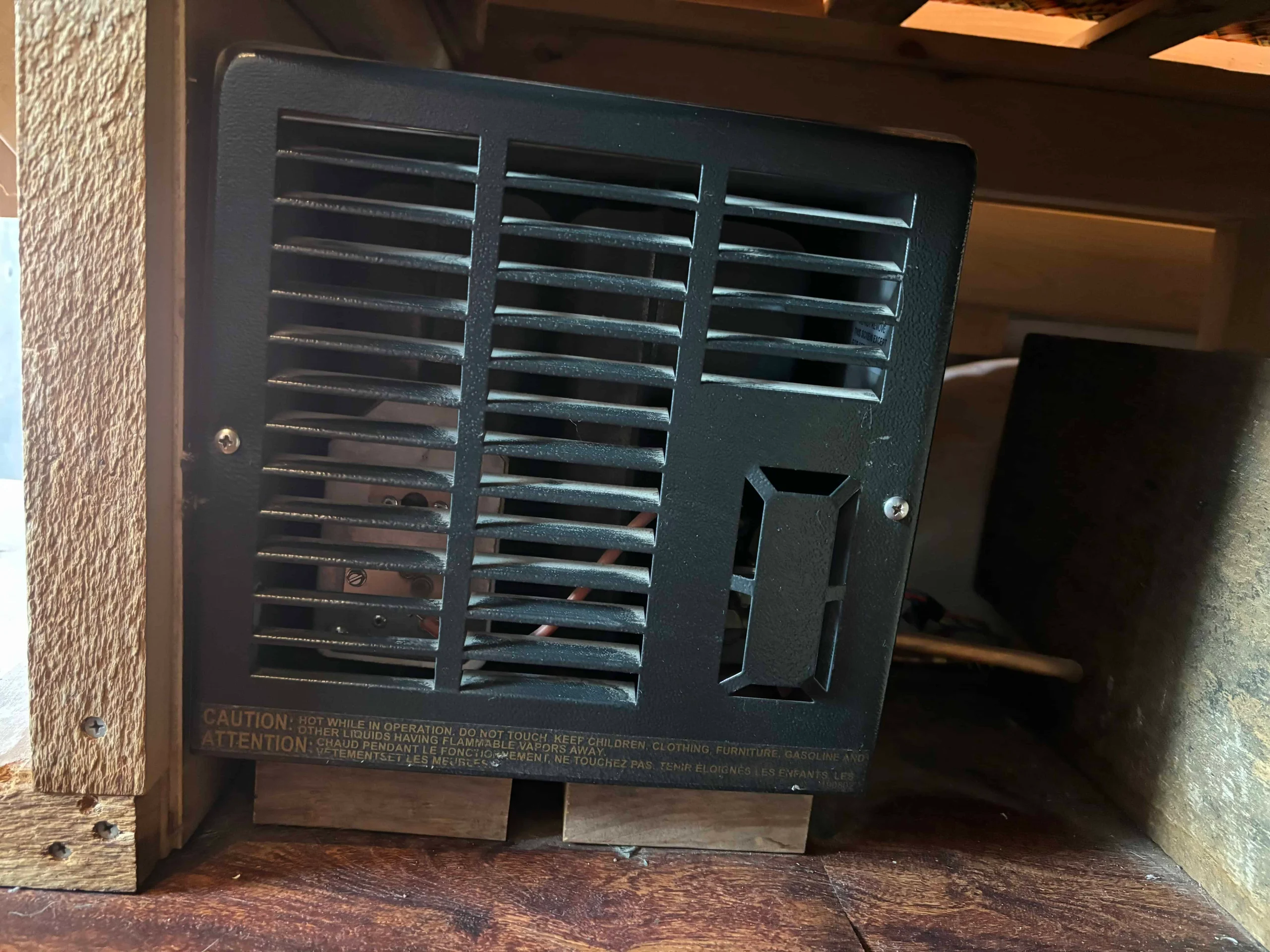 -18000 BTU propane furnace. Plenty warm even in below freezing situations.