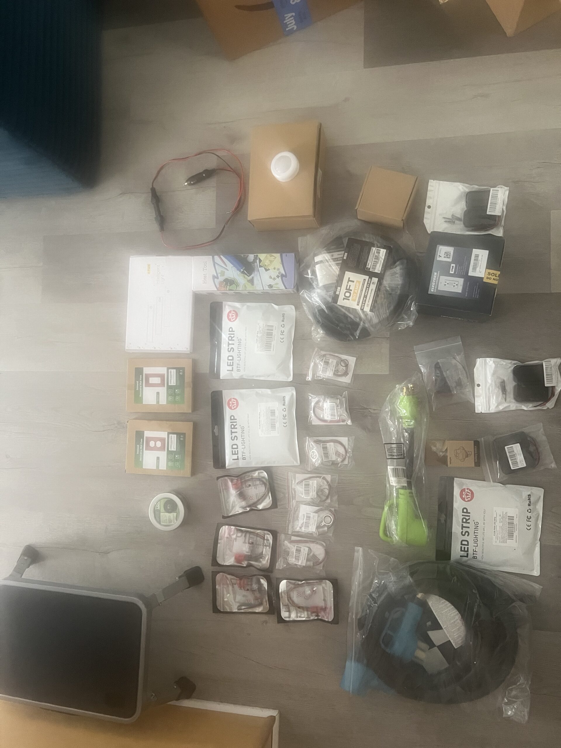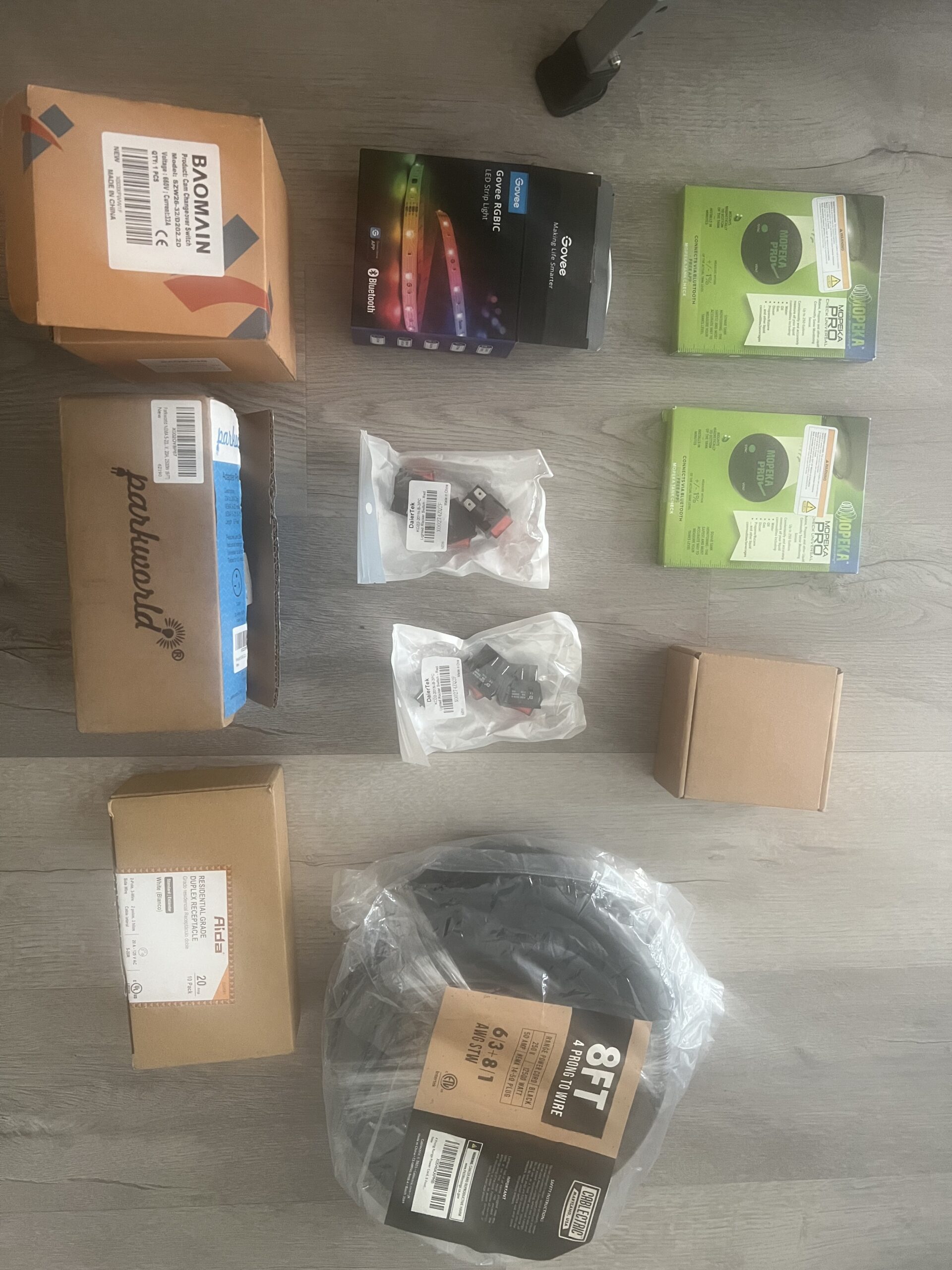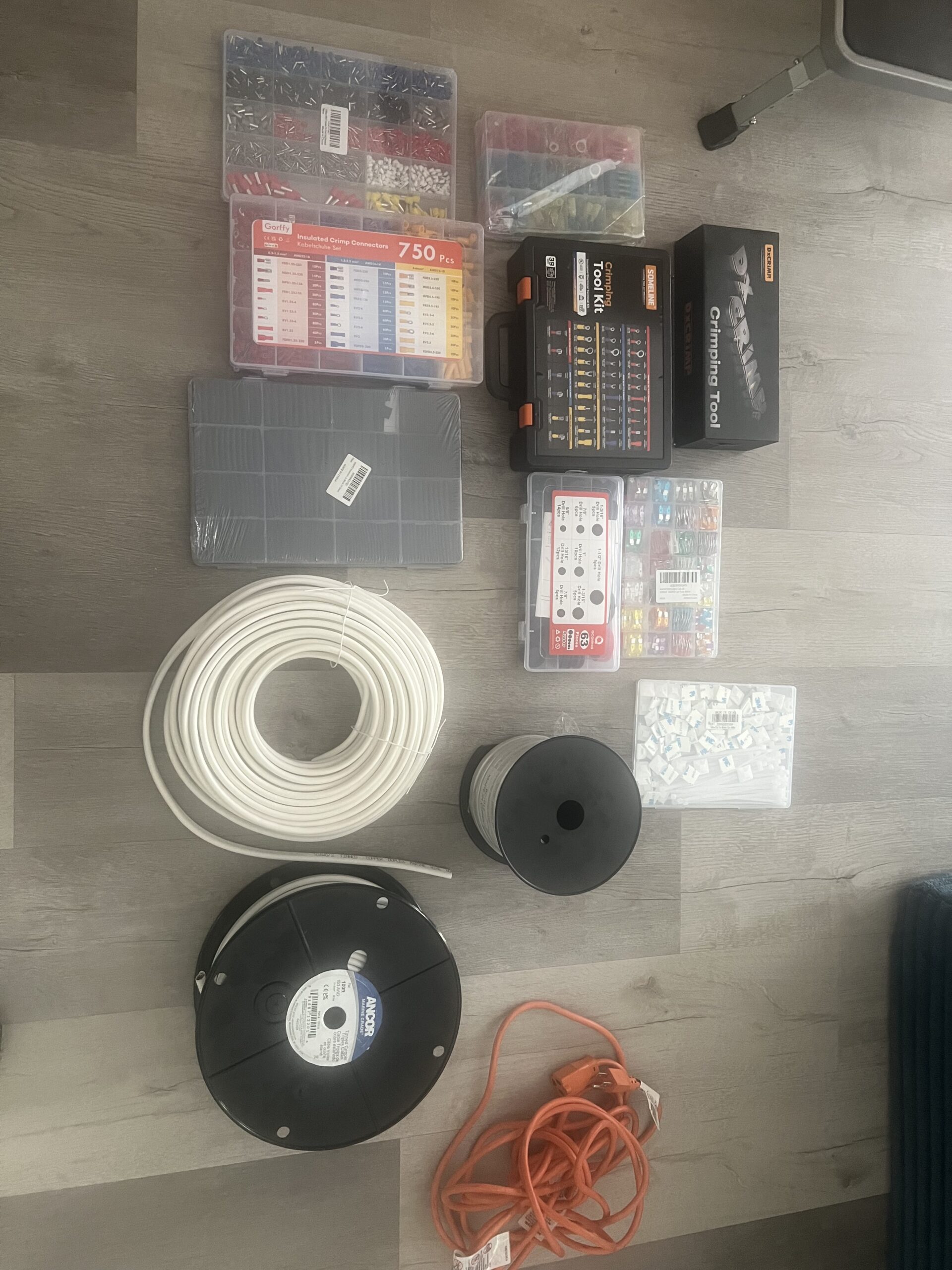 - A variety of lights, switches, outlets, outlet boxes, wires, connectors, safety gear, lever nuts, wire cutters, crimp sets/kits, and more