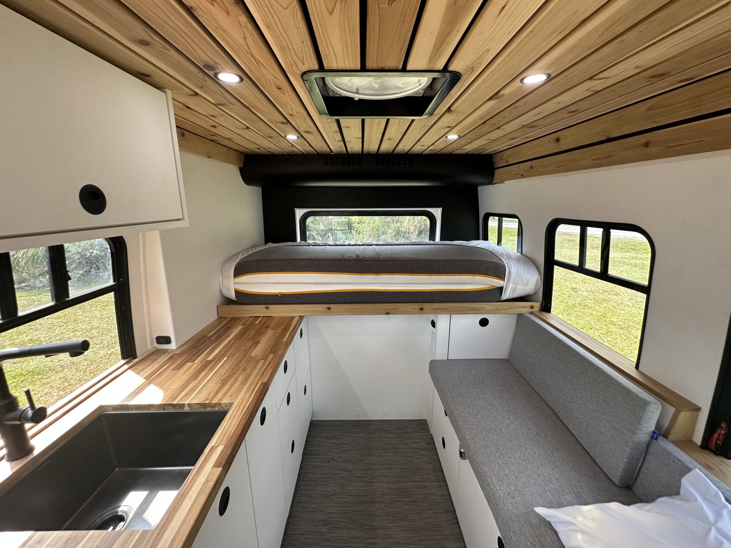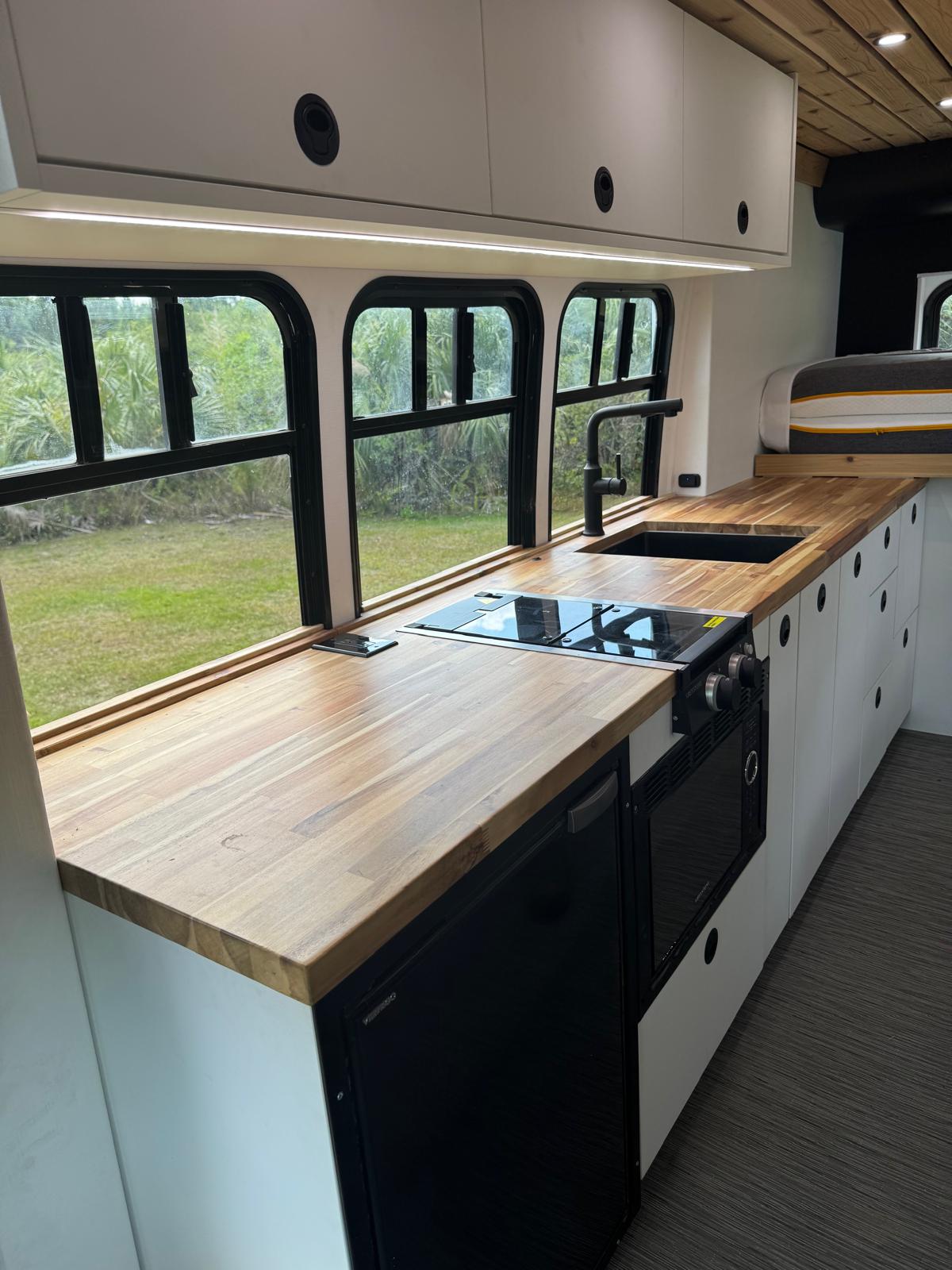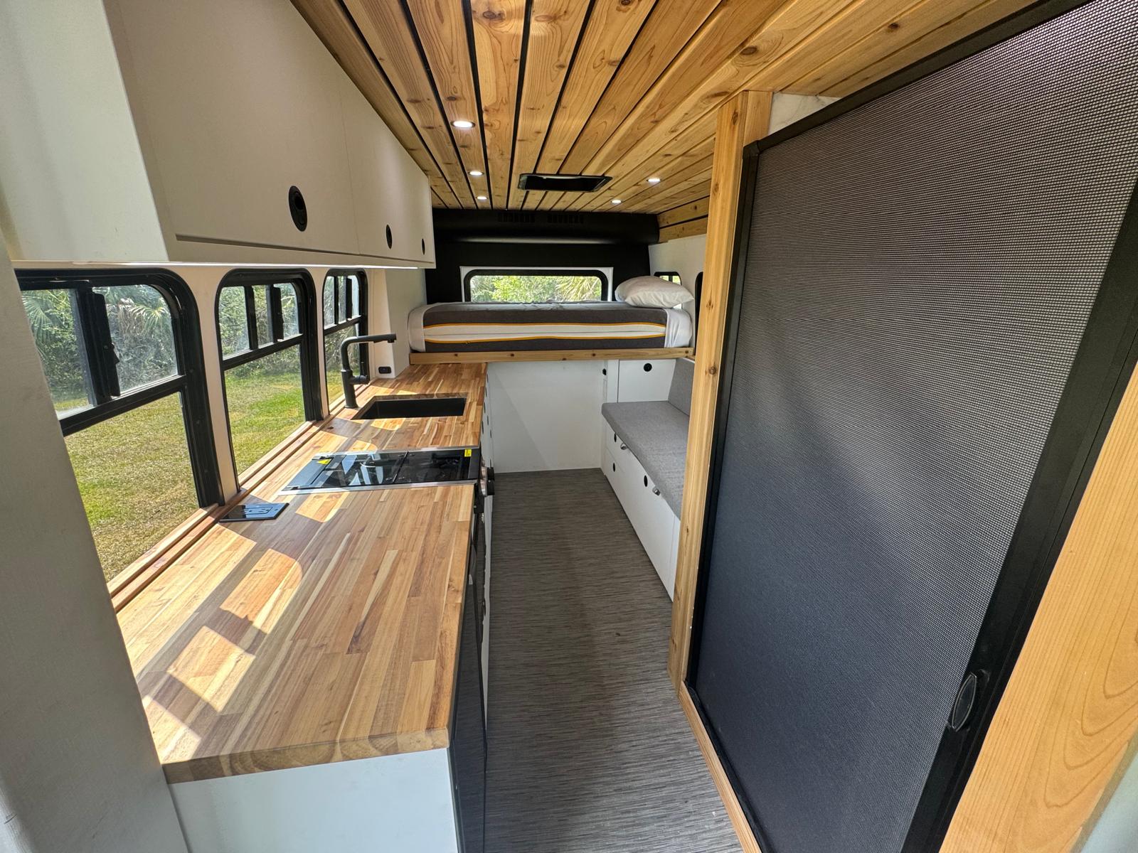 WaterProof Woven Vinyl Thatch flooring Full Carpentry Buildout (Vinyl or textile walls also available) Soft touch Vinyl Wrapped walls, panels Natural Cedar ceiling Custom Built Plywood Cabinetry Matte Lacquered Solid colors cabinet doors Prefinished Plywood Drawers Butcher Block Countertops Softclose hinges Slam Latch handles (Locking) Insulation: Under Floor Solid Foam Insulation Van Walls are Built from 1+ Inch solid foam insulation Ceiling Solid Foam Insulation