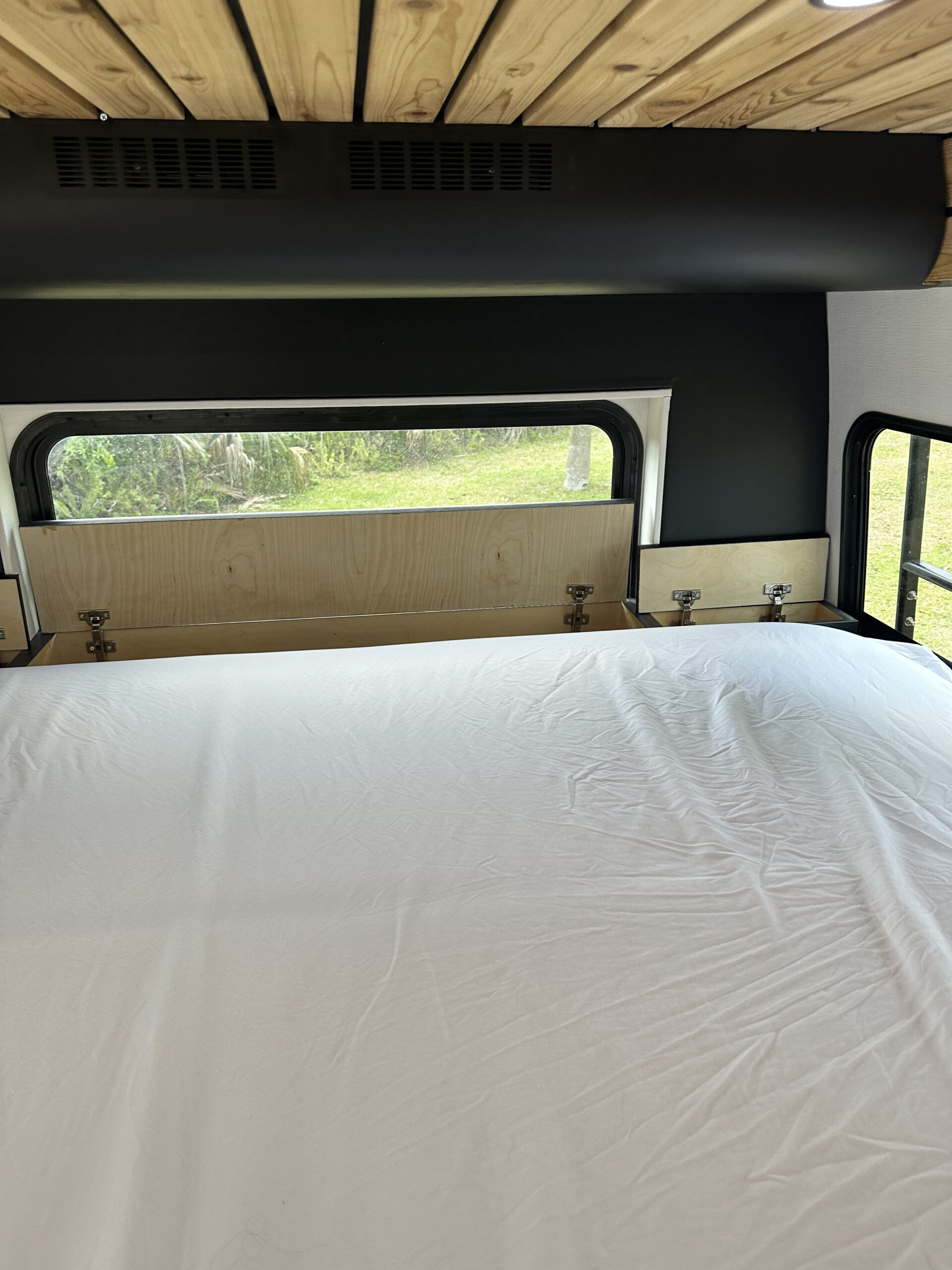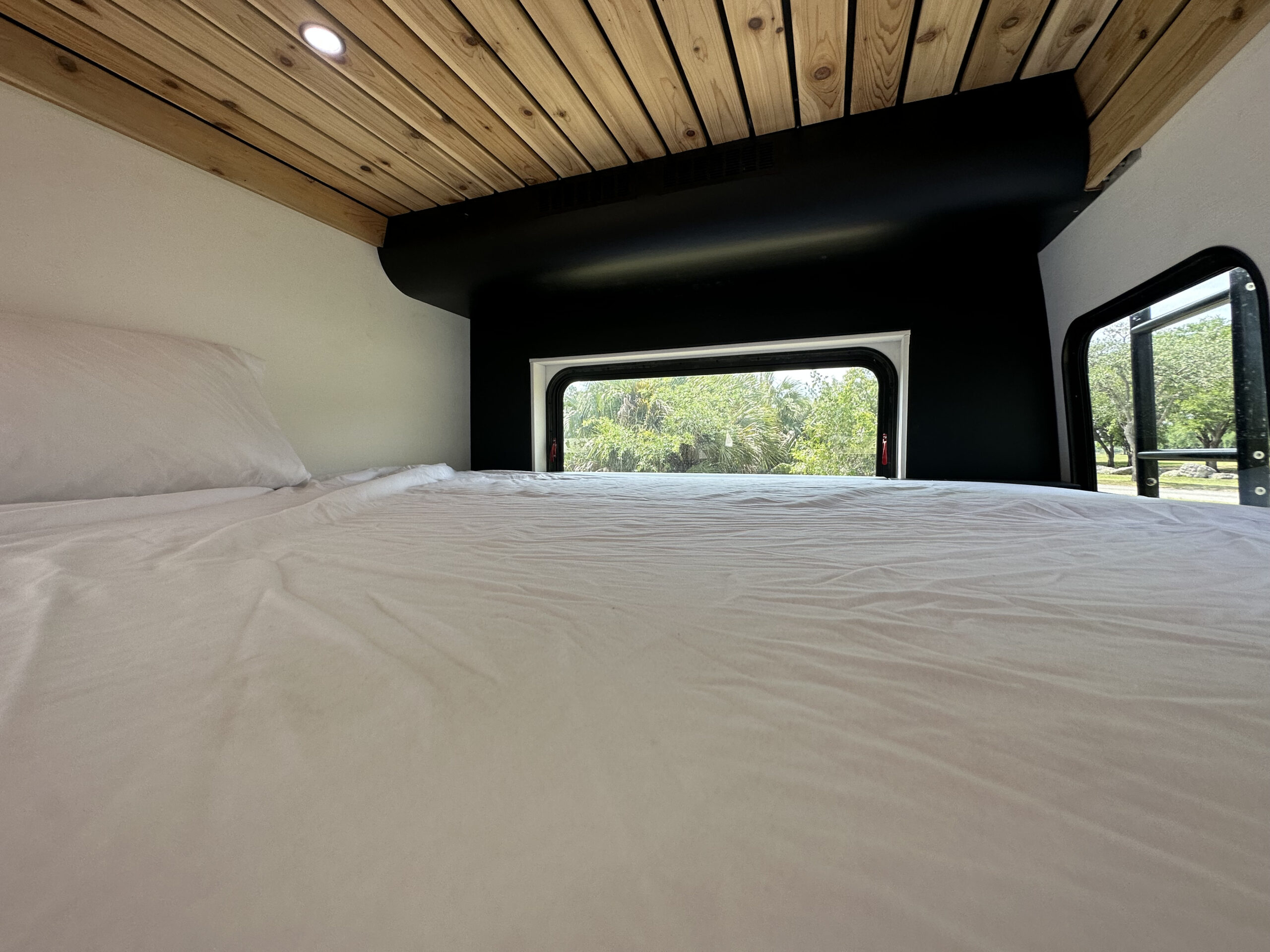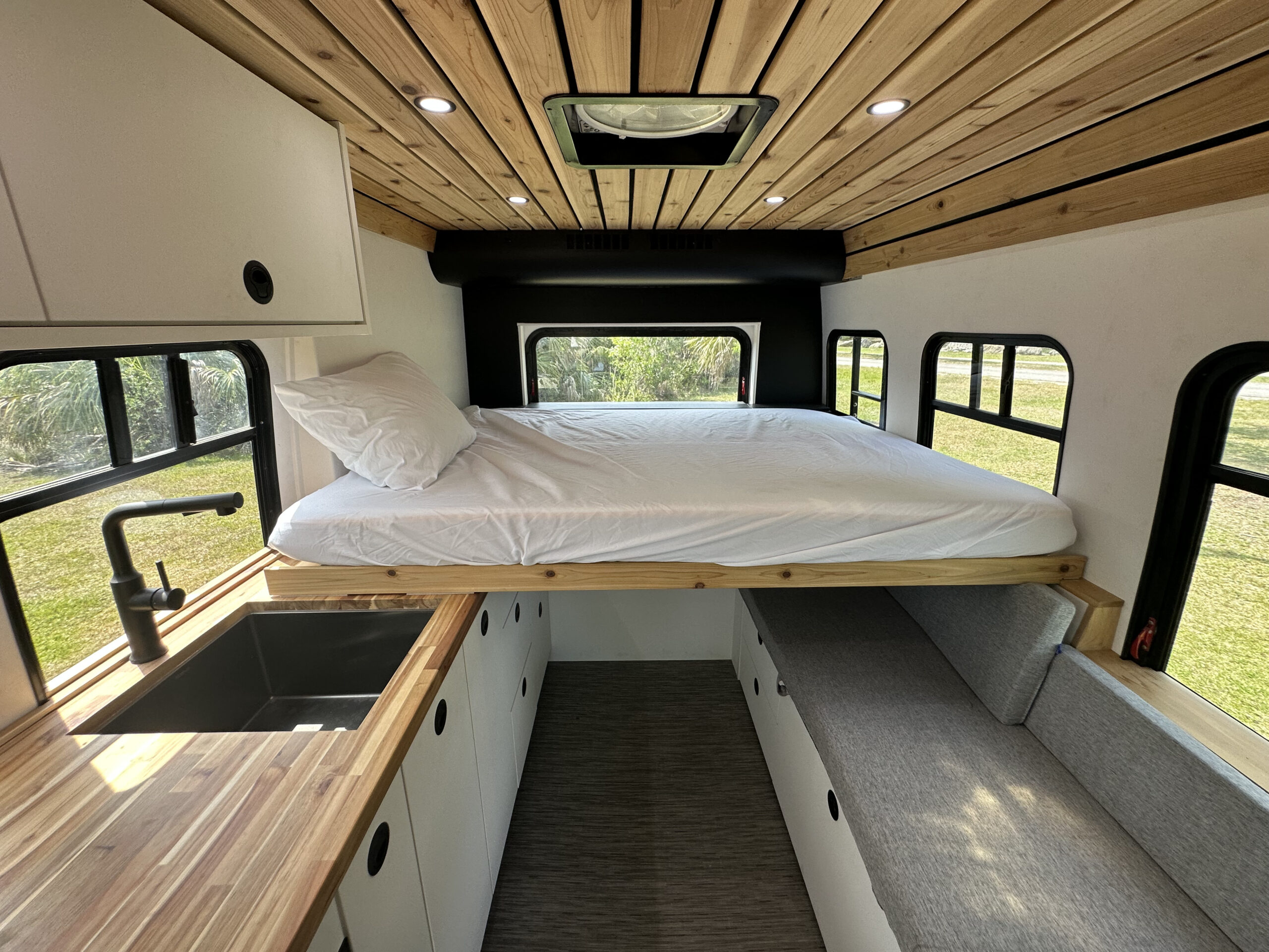 WaterProof Woven Vinyl Thatch flooring Full Carpentry Buildout (Vinyl or textile walls also available) Soft touch Vinyl Wrapped walls, panels Natural Cedar ceiling Custom Built Plywood Cabinetry Matte Lacquered Solid colors cabinet doors Prefinished Plywood Drawers Butcher Block Countertops Softclose hinges Slam Latch handles (Locking) Insulation: Under Floor Solid Foam Insulation Van Walls are Built from 1+ Inch solid foam insulation Ceiling Solid Foam Insulation