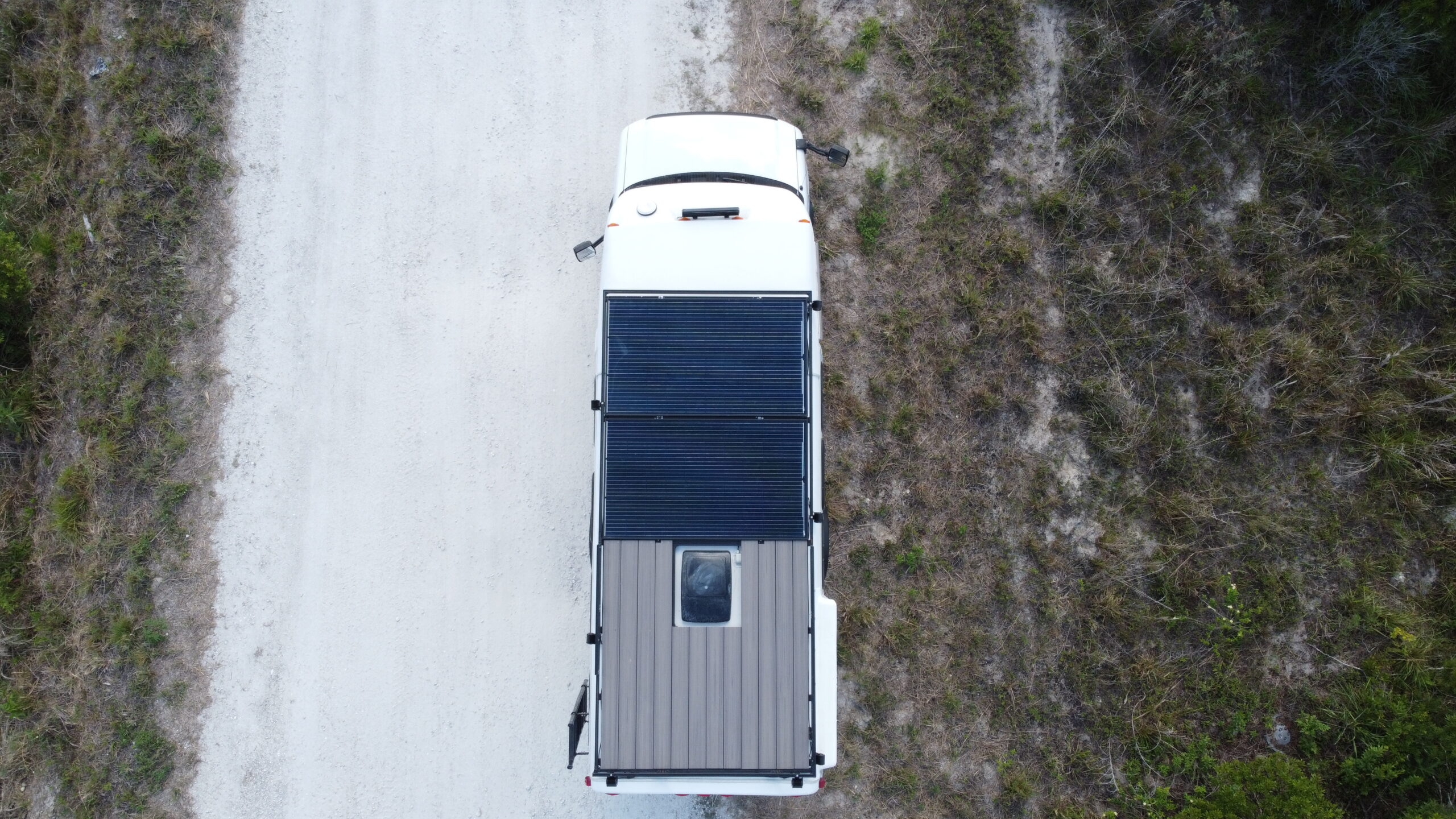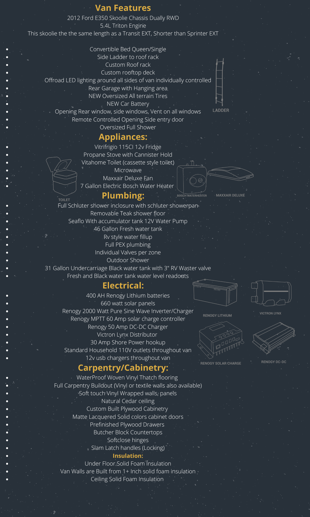 400 AH Renogy Lithium batteries 660 watt solar panels Renogy 2000 Watt Pure Sine Wave Inverter/Charger Renogy MPTT 60 Amp solar charge controller Renogy 50 Amp DC-DC Charger Victron Lynx Distributor 30 Amp Shore Power hookup Standard Household 110V outlets throughout van 12v usb chargers throughout van Carpentry/Cabinetry: