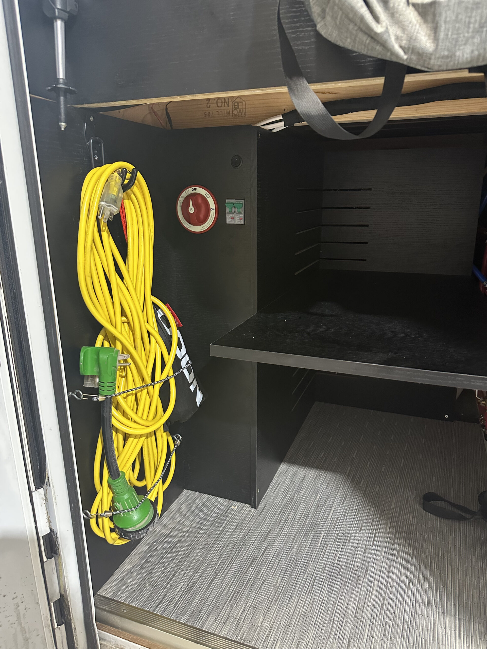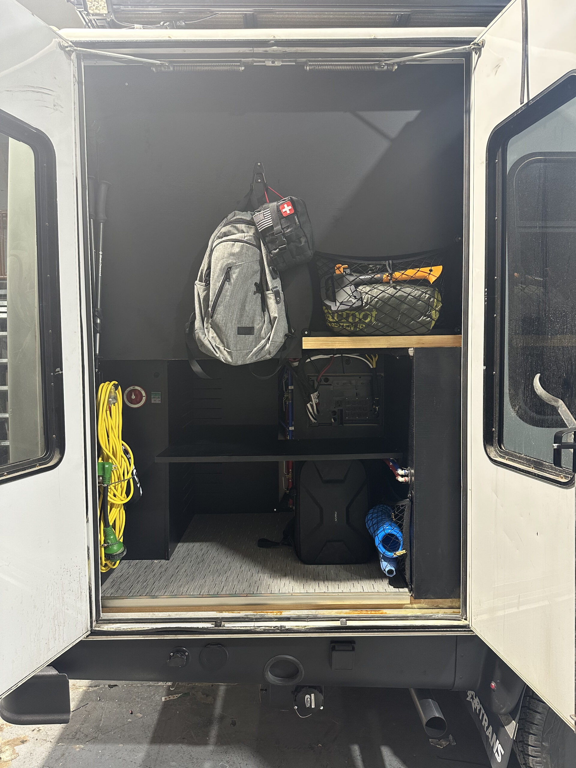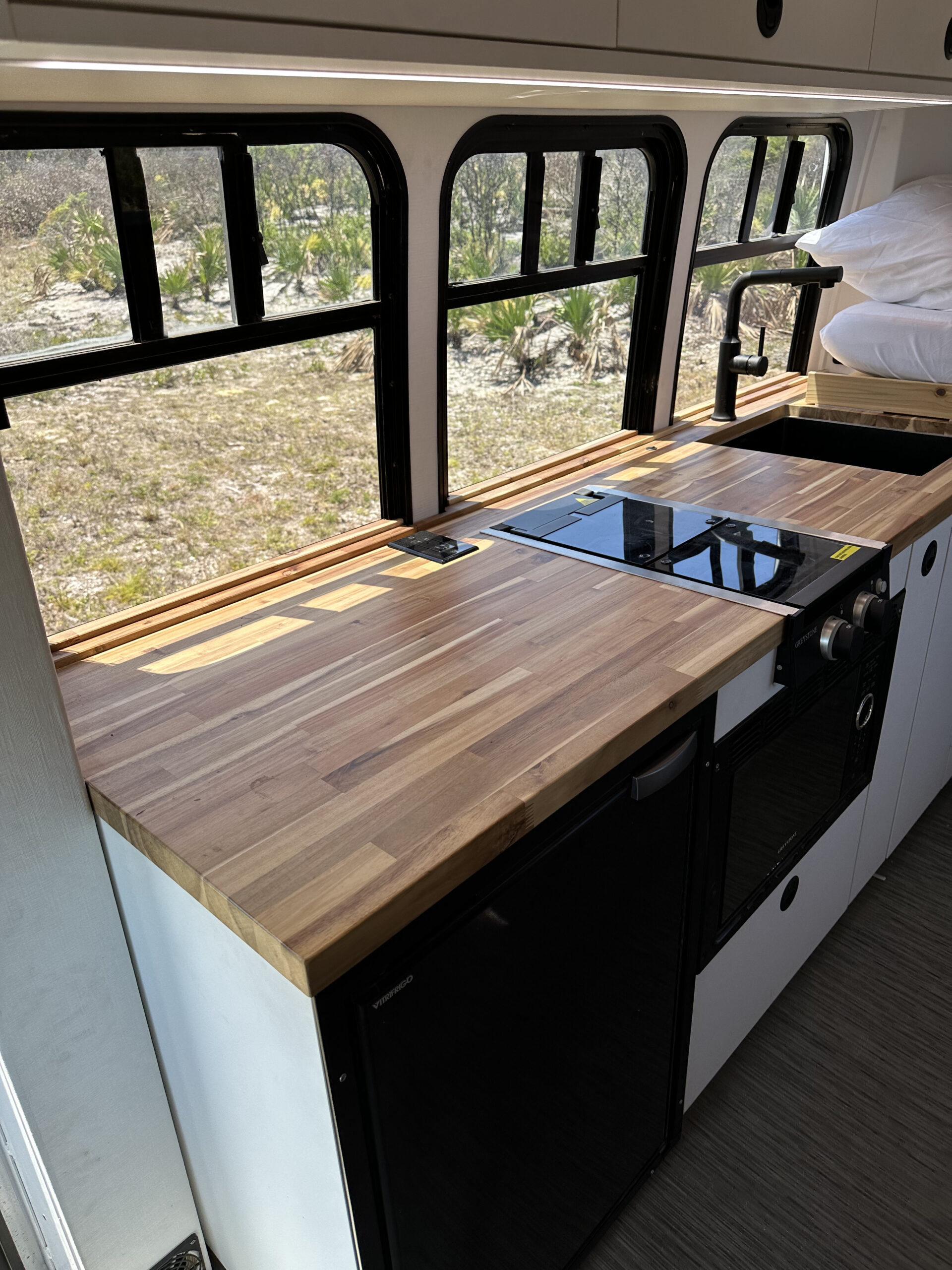 Full Schluter shower inclosure with schluter showerpan Removable Teak shower floor Seaflo With accumulator tank 12V Water Pump 46 Gallon Fresh water tank Rv style water fillup Full PEX plumbing Individual Valves per zone Outdoor Shower 31 Gallon Undercarriage Black water tank with 3″ RV Waster valve Fresh and Black water tank water level readouts Electrical: