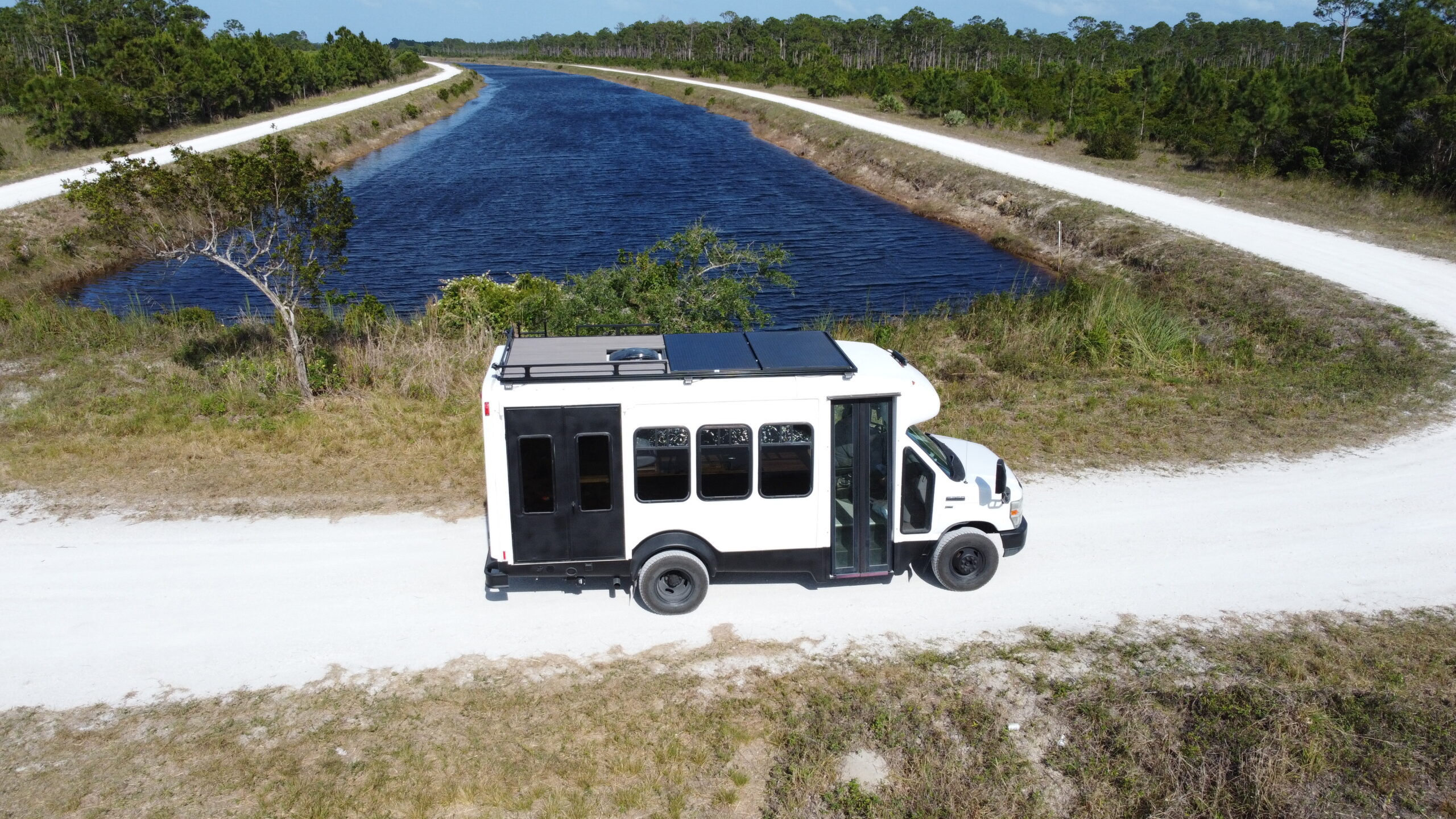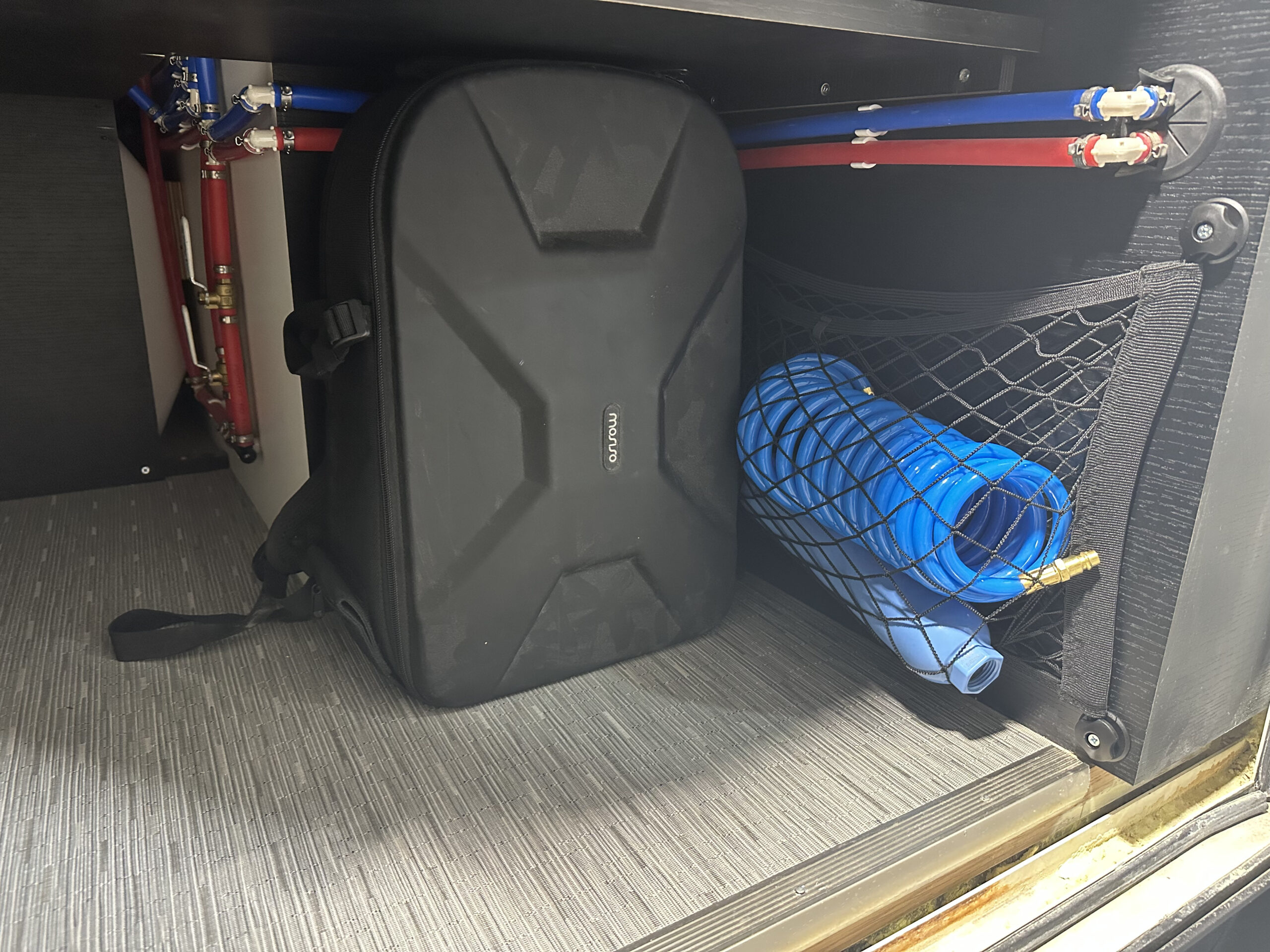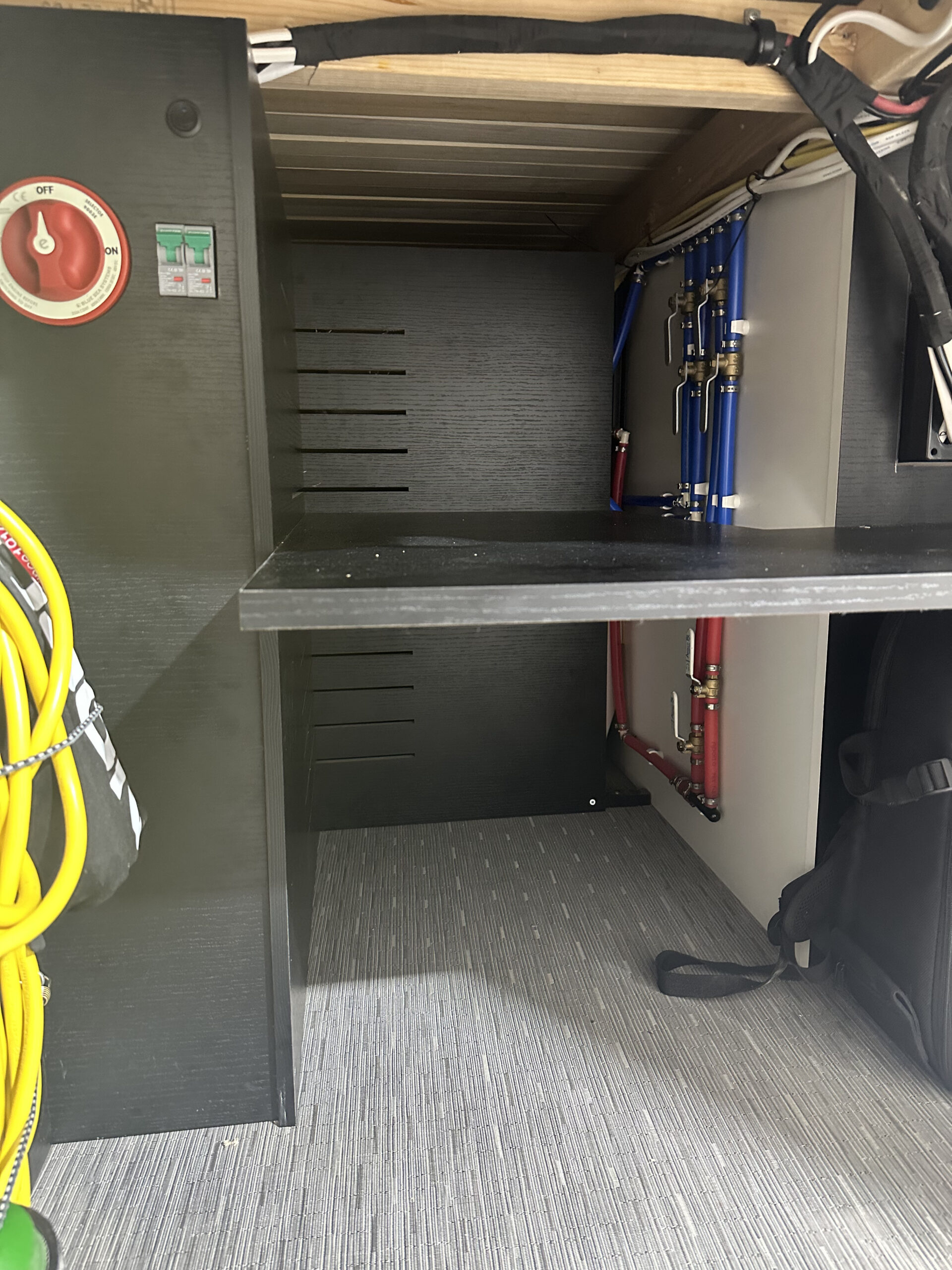 Full Schluter shower inclosure with schluter showerpan Removable Teak shower floor Seaflo With accumulator tank 12V Water Pump 46 Gallon Fresh water tank Rv style water fillup Full PEX plumbing Individual Valves per zone Outdoor Shower 31 Gallon Undercarriage Black water tank with 3″ RV Waster valve Fresh and Black water tank water level readouts Electrical: