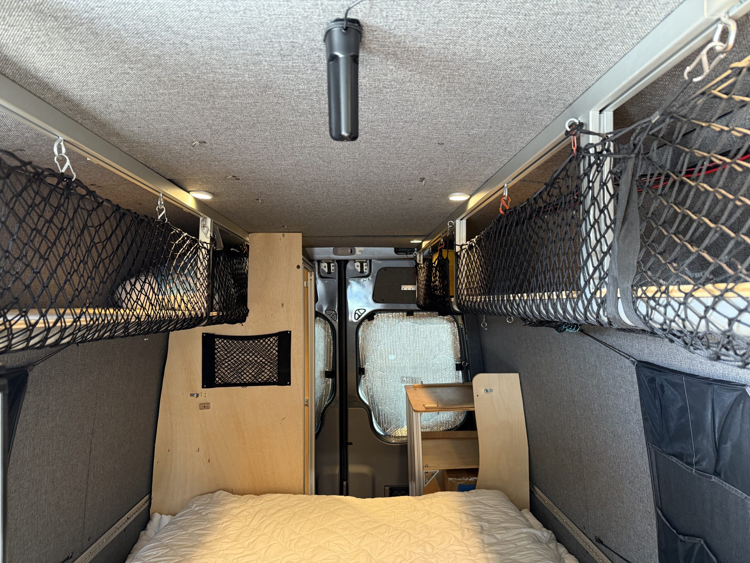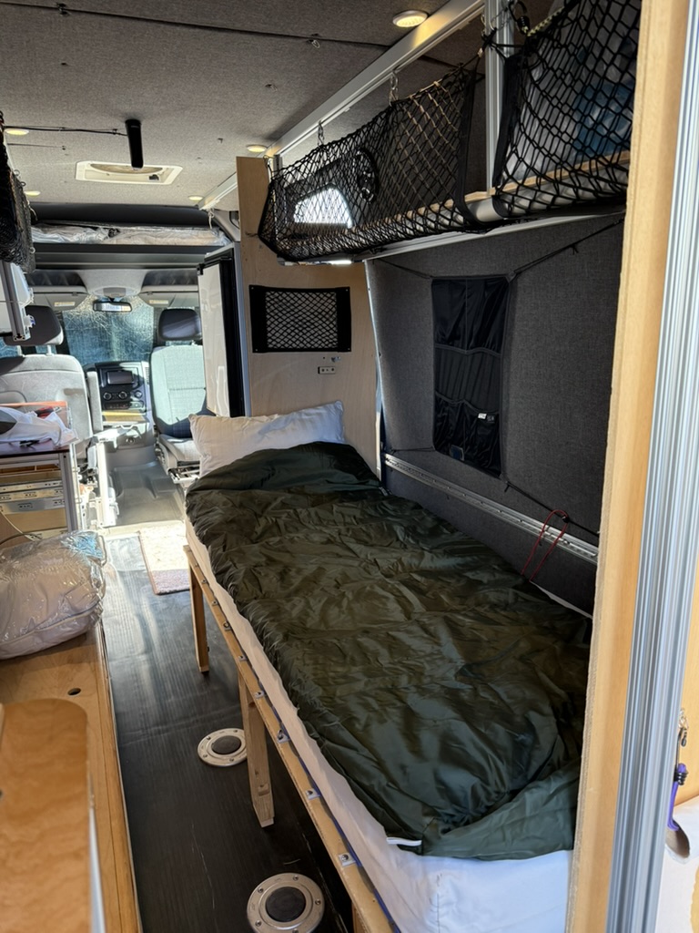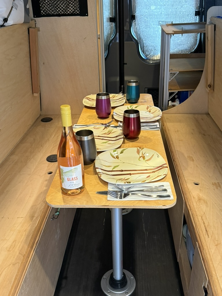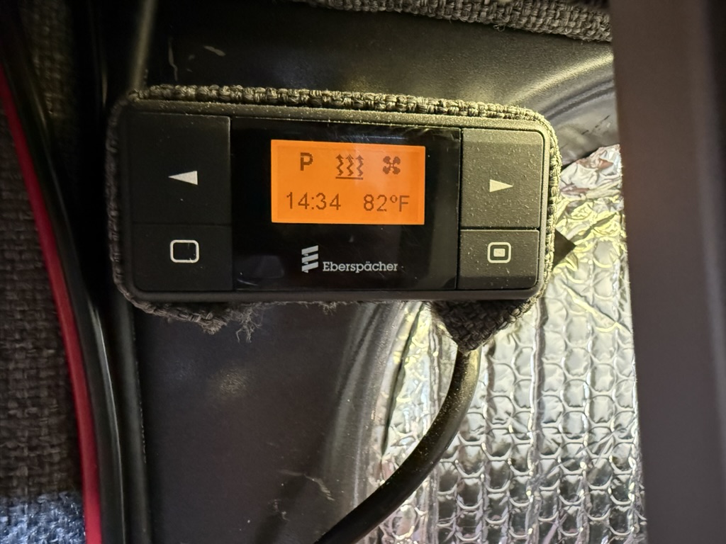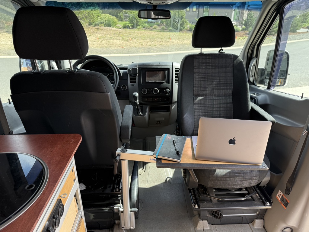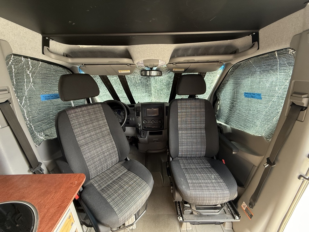 - Comfort & Utility: Factory heated front seats swivel to provide a forward lounging area. Woven textured fabric covered paneling provides visually appealing and quiet and sound deadening interior. A Lagun swivel table mounted to the driver’s seat pedestal provides both driver and passenger extra space while driving or a mobile work surface from the passenger’s seat when swiveled to the rear. A remote controlled MAXXFAN ventilation fan, and an Eberspracher D2 diesel furnace with the high altitude kit and muffler will ensure that you are comfortable wherever Lucy takes you; from the sunny beach to the snow covered mountains. Full length wall mounted cargo tracks are used to secure the removable modules and provide additional mounting points as needed. 12V LED general lighting in the center aisle ceiling is augmented by 12V LED task lighting over the kitchen counter. The center aisle lighting can be powered by either the house battery or the vehicle battery (tying it to the rest of the vehicle’s door lighting). 12V USB type A outlets, and 12V general purpose outlets (cigarette lighter style) are available in the kitchen and on both sides of the bed. Abundant storage is provided by shelving that runs along both sides of the van. Cargo nets provide an easy method of securing items while allowing the shelves to be slightly overstuffed. A GoalZero solar generator provides house DC (12V) as well as AC (110V) power; the AC powers the WeBoost Drive Reach cellphone booster. The solar generator is continuously recharged by 300W of solar panels on the roof and is augmented by a Victron 700W inverter connected to the Van’s