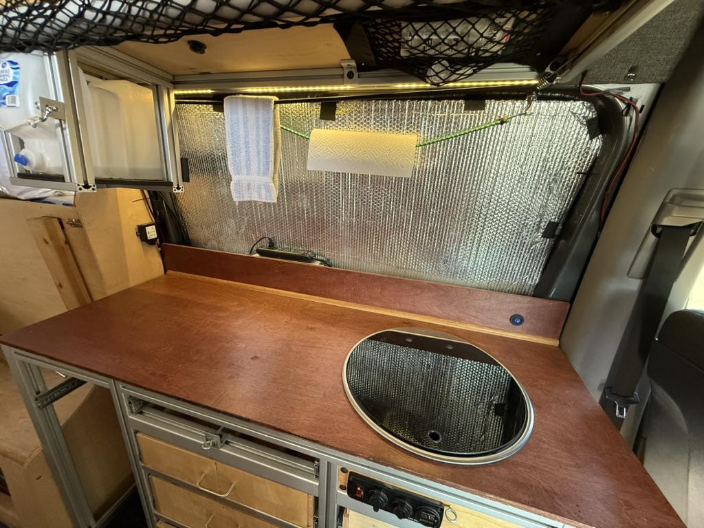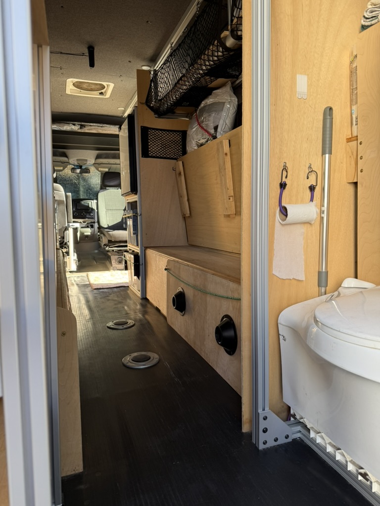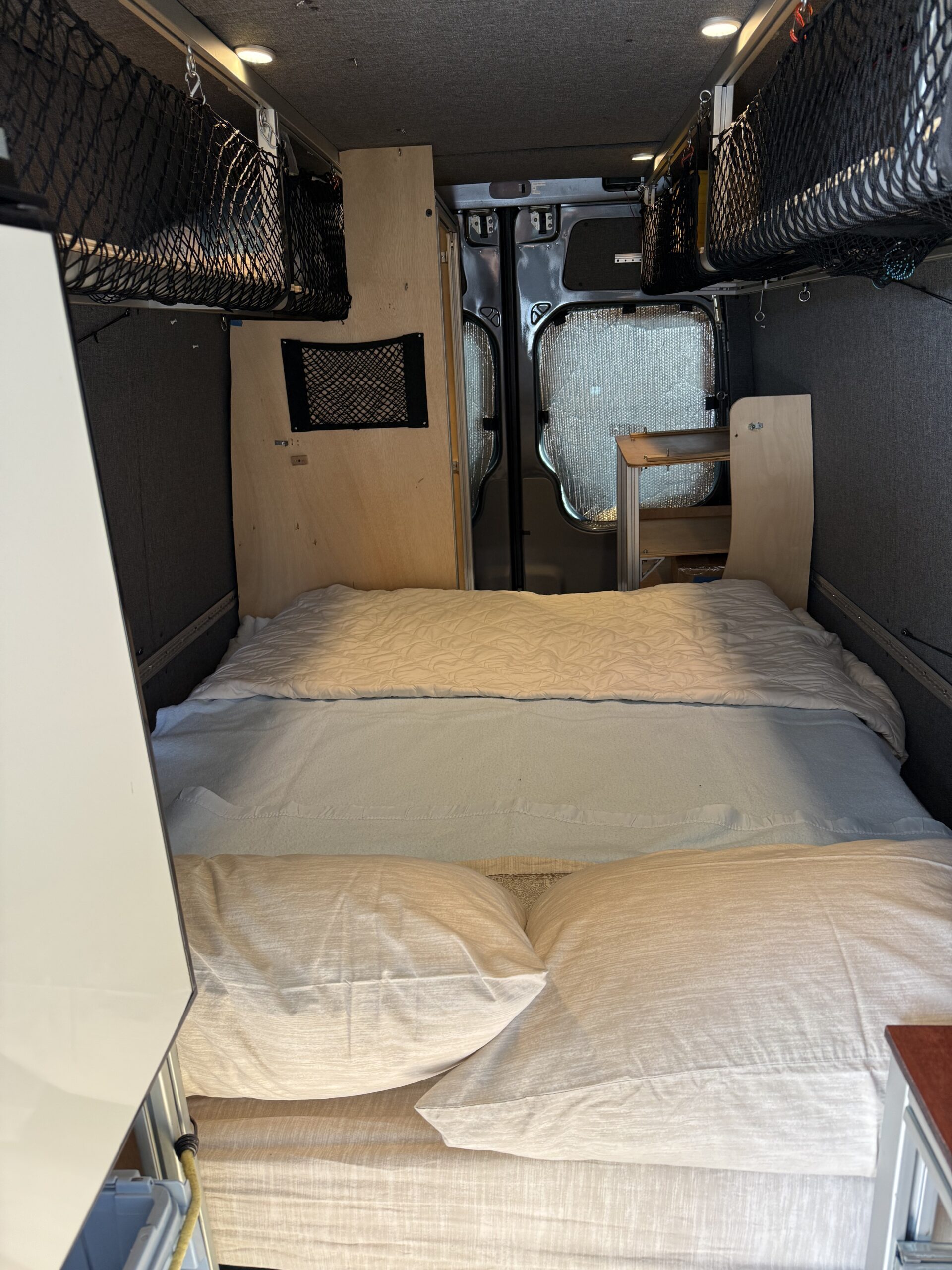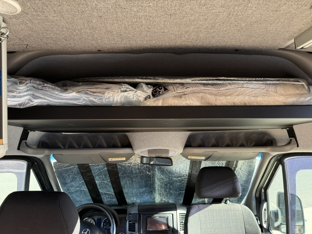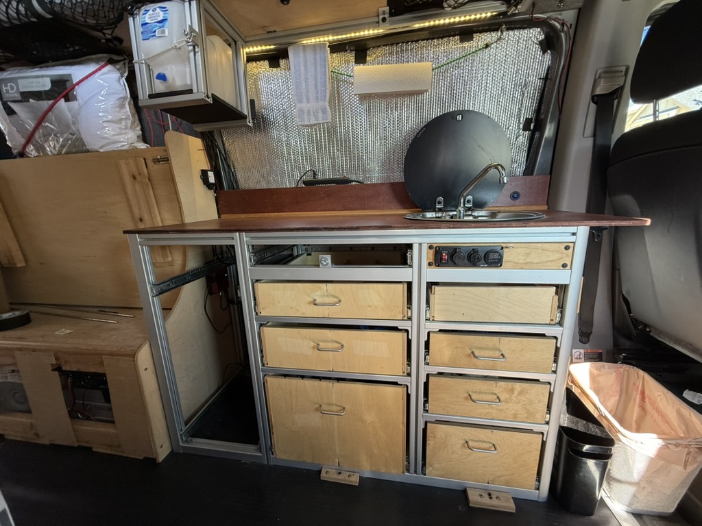 - Comfort & Utility: Factory heated front seats swivel to provide a forward lounging area. Woven textured fabric covered paneling provides visually appealing and quiet and sound deadening interior. A Lagun swivel table mounted to the driver’s seat pedestal provides both driver and passenger extra space while driving or a mobile work surface from the passenger’s seat when swiveled to the rear. A remote controlled MAXXFAN ventilation fan, and an Eberspracher D2 diesel furnace with the high altitude kit and muffler will ensure that you are comfortable wherever Lucy takes you; from the sunny beach to the snow covered mountains. Full length wall mounted cargo tracks are used to secure the removable modules and provide additional mounting points as needed. 12V LED general lighting in the center aisle ceiling is augmented by 12V LED task lighting over the kitchen counter. The center aisle lighting can be powered by either the house battery or the vehicle battery (tying it to the rest of the vehicle’s door lighting). 12V USB type A outlets, and 12V general purpose outlets (cigarette lighter style) are available in the kitchen and on both sides of the bed. Abundant storage is provided by shelving that runs along both sides of the van. Cargo nets provide an easy method of securing items while allowing the shelves to be slightly overstuffed. A GoalZero solar generator provides house DC (12V) as well as AC (110V) power; the AC powers the WeBoost Drive Reach cellphone booster. The solar generator is continuously recharged by 300W of solar panels on the roof and is augmented by a Victron 700W inverter connected to the Van’s