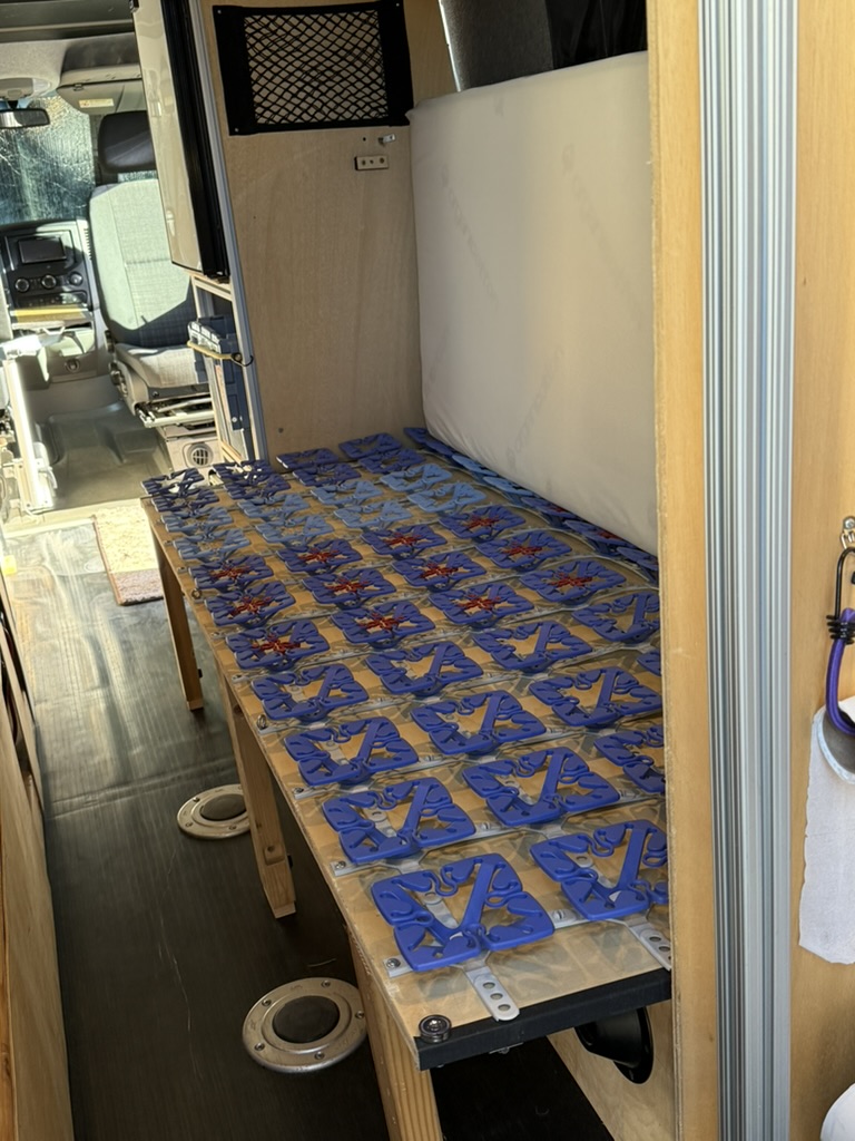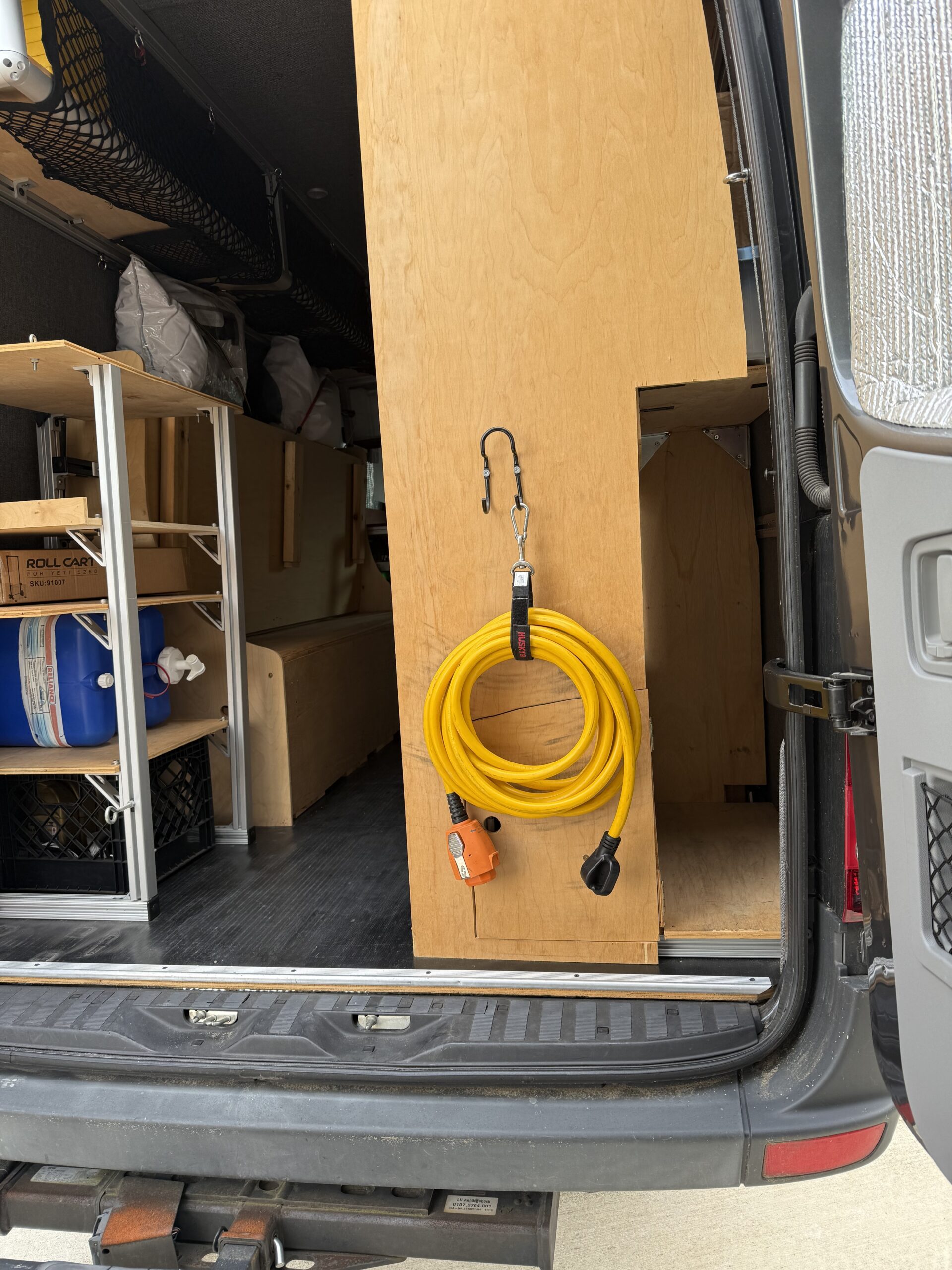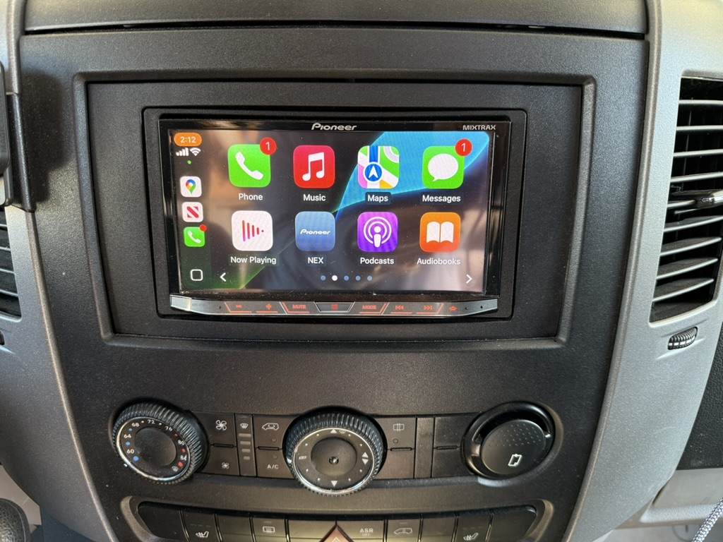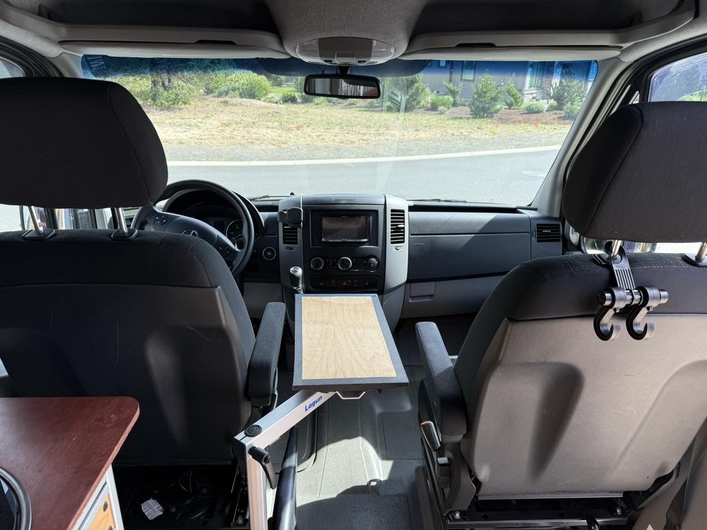 Lucy is a 2015 170″ MB Sprinter 3500 heavy duty, high payload dually, custom ordered from the factory as a 4×4 crew cab with factory heated MB swivel captains chairs and the towing package. The original owner insulated (using thinsulate) and paneled the van with Duramax fabric adding a MaxxAir MAXXFAN ventilation fan, an Eberspracher D2 diesel-fired heater, and an AndroidAuto/CarPlay capable Pioneer AVH-X5600BHS head unit with Rockford Fosgate amps for entertainment. The current owners took this well built foundation and created a purpose built vehicle to support adventure travel and mobile work, but left the design flexible enough to accommodate trips to the lumber yard to bring home 16′ dimensional lumber, full sheets of plywood or other project/garden supplies or recreational items like kayaks, snow skis or snow boards.