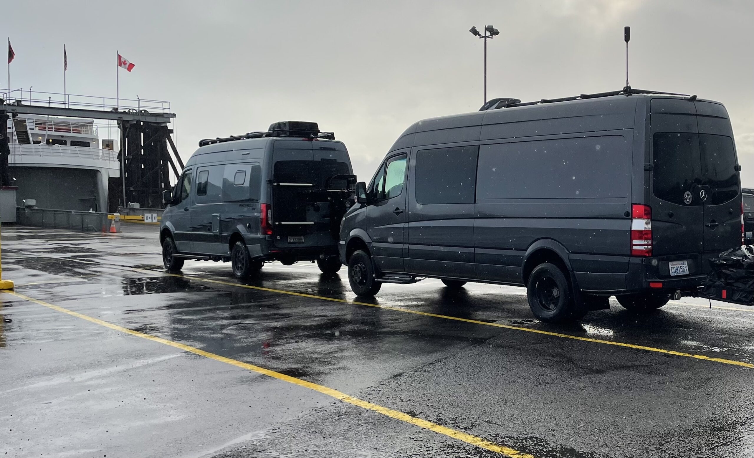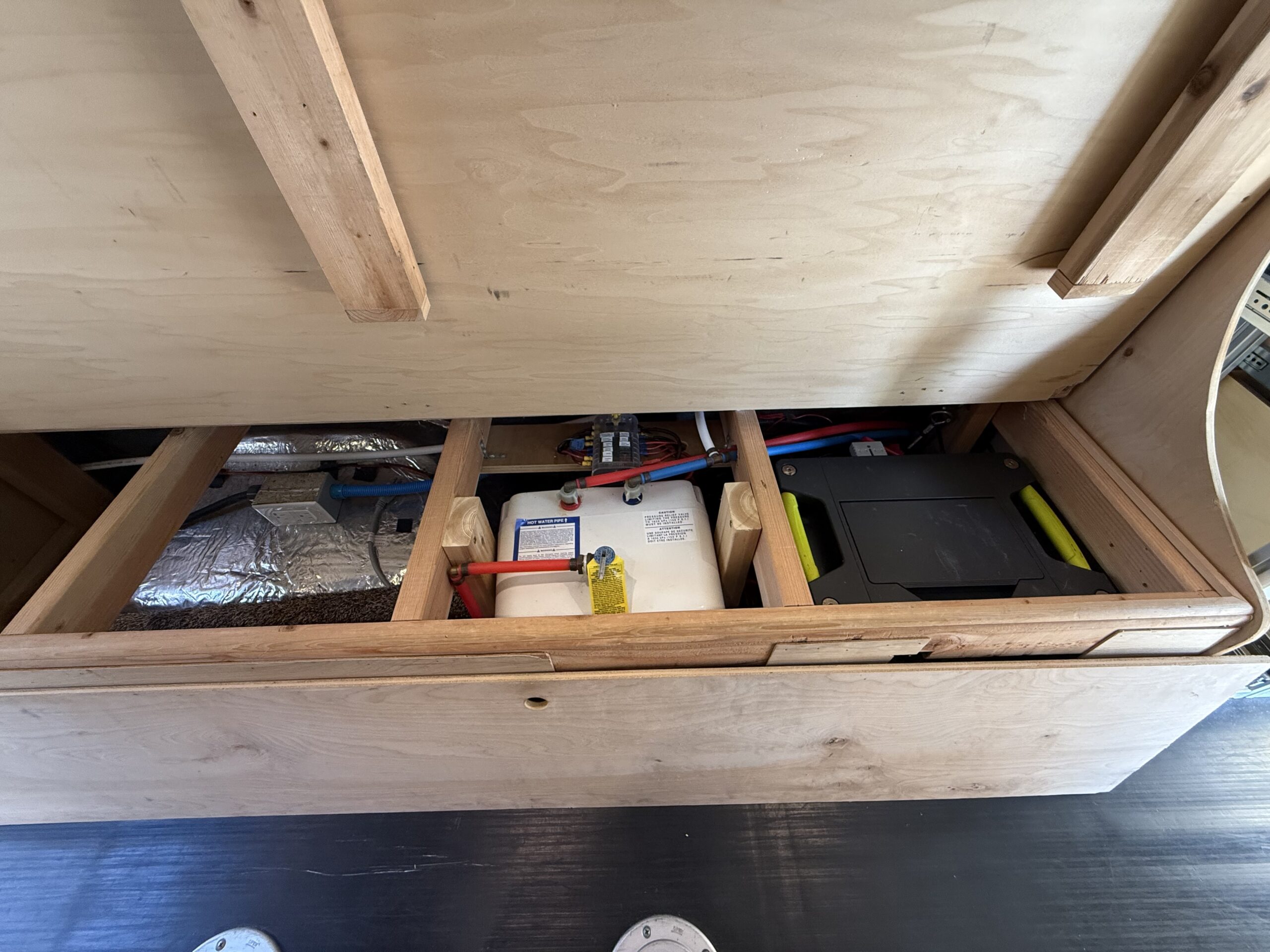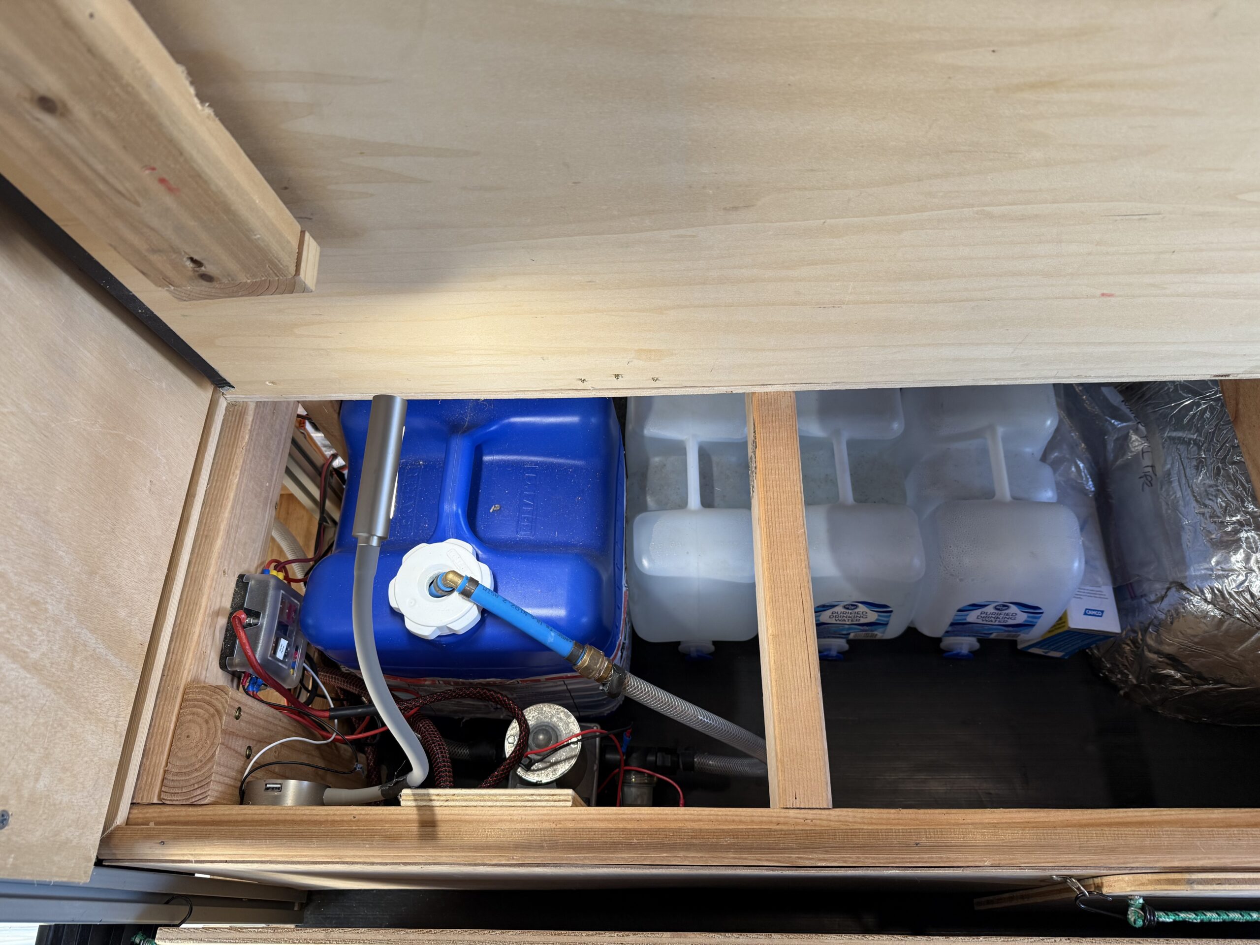 Lucy is a 2015 170″ MB Sprinter 3500 heavy duty, high payload dually, custom ordered from the factory as a 4×4 crew cab with factory heated MB swivel captains chairs and the towing package. The original owner insulated (using thinsulate) and paneled the van with Duramax fabric adding a MaxxAir MAXXFAN ventilation fan, an Eberspracher D2 diesel-fired heater, and an AndroidAuto/CarPlay capable Pioneer AVH-X5600BHS head unit with Rockford Fosgate amps for entertainment. The current owners took this well built foundation and created a purpose built vehicle to support adventure travel and mobile work, but left the design flexible enough to accommodate trips to the lumber yard to bring home 16′ dimensional lumber, full sheets of plywood or other project/garden supplies or recreational items like kayaks, snow skis or snow boards.
