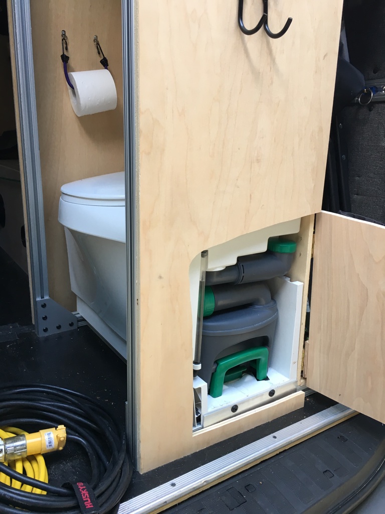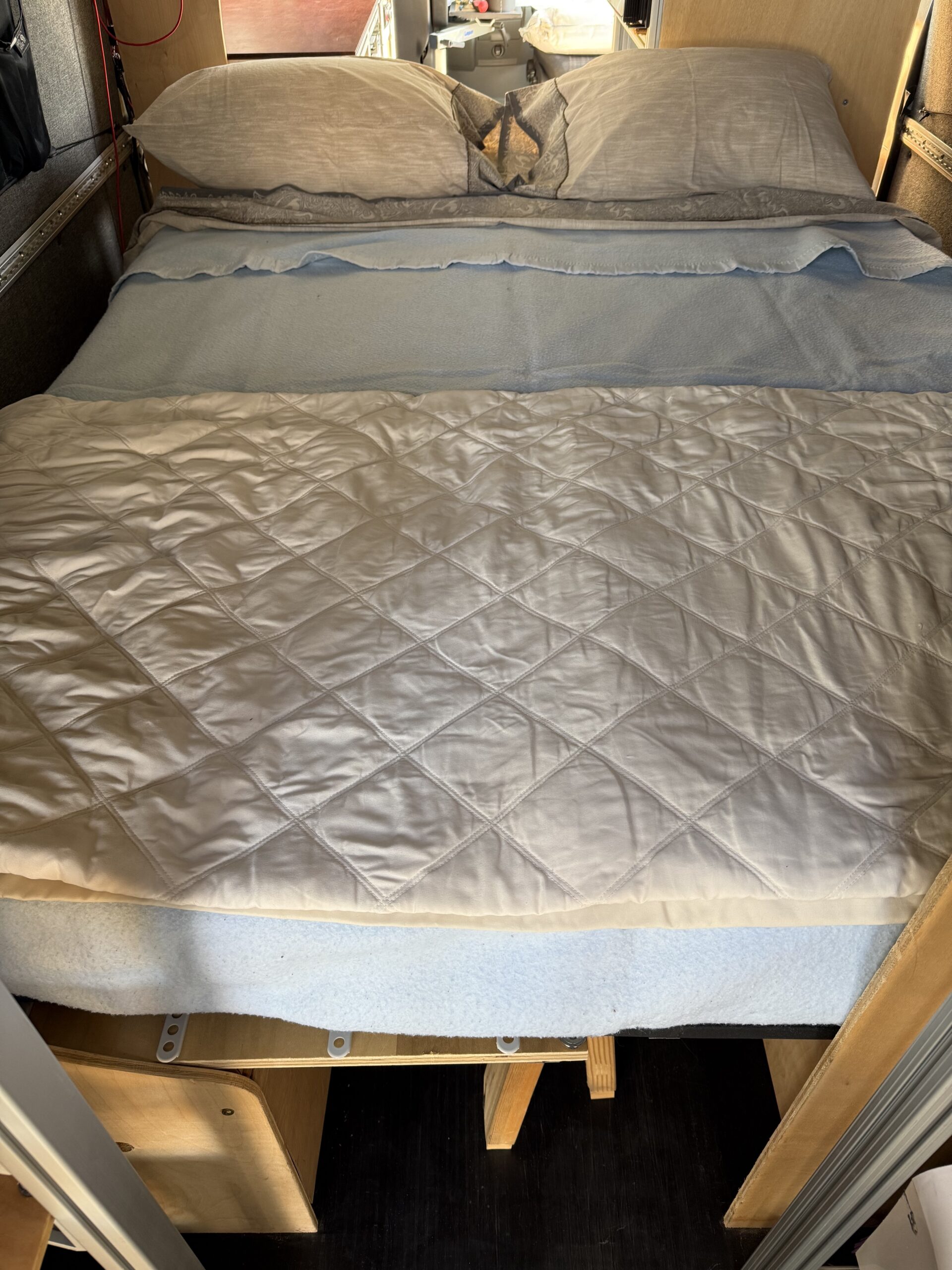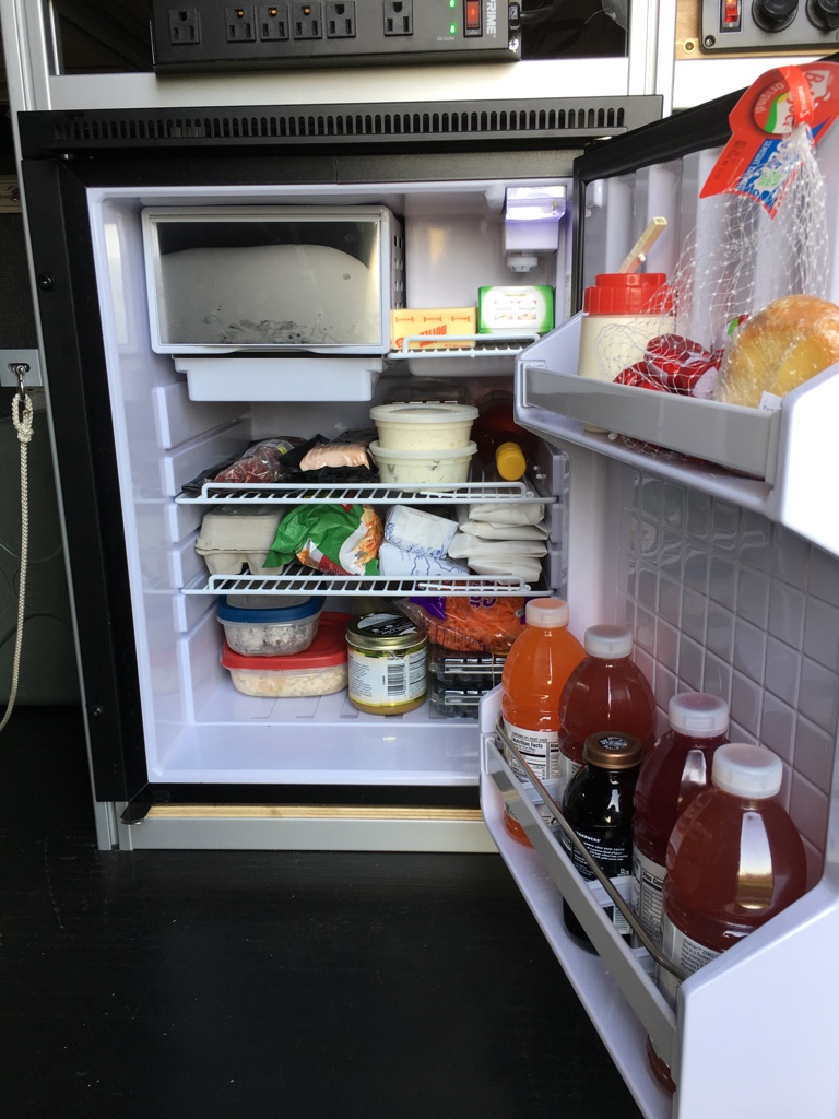 - Camping Essentials: a partial kitchen (no stove or oven) with hot/cold running water and a marine grade Isotherm CR-85 refrigerator make meals on the road or at campsite just a little easier. Upright fridge design and mounting provides easy access to food without bending over or pulling out half of the items to get to the one you want in the bottom. Lucy currently has 6 gal fresh and grey water tanks but carries an additional 10gal of drinking water in 2.5gal dispensers. A larger stainless steel grey water tank is included but not yet installed. A split section convertible bed using Froli RV mattress springs and twin mattresses provides two sleeping options. Either side can be lowered for individual use with a sleeping bag, or both sides can be lowered and fitted double bed sized sheets hold the two mattresses together making a very comfortable double bed. Pillows store above the bed sides when closed and the bed linens store in an RB Components shelf above the cockpit area. When not in use, the beds fold away providing additional seating space. A stow-able center aisle table provides room for 4 to socialize and eat; a small utility table attaches to the kitchen module to provide additional space for food prep. Pocket stowage in the rear provides storage space for your fireside chairs. A hitch mountable cargo basket with waterproof cover is included to carry bulky items that you wouldn’t want to carry inside the van (like propane tanks).