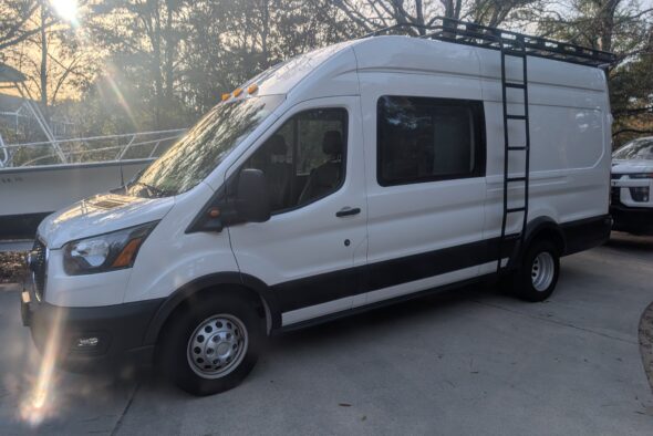 This van is ready for winter adventures! We added a powerful furnace and insulated the van well for year-round comfort. It has kept us warm in extremely cold temps (-20°F). We upgraded the tires to all-terrain BFGoodrich KO2s that are wider than stock for more traction. Tire chains included.