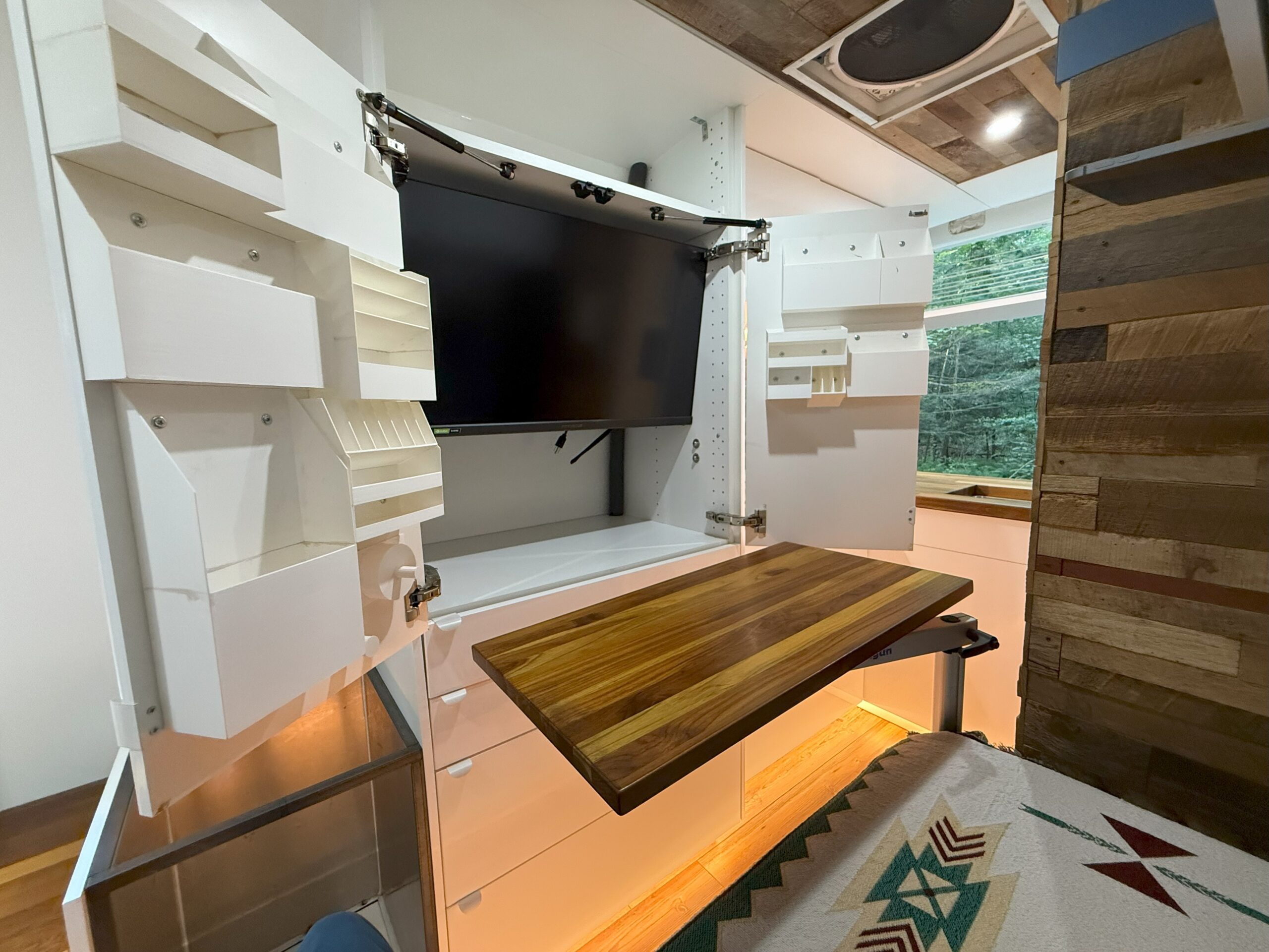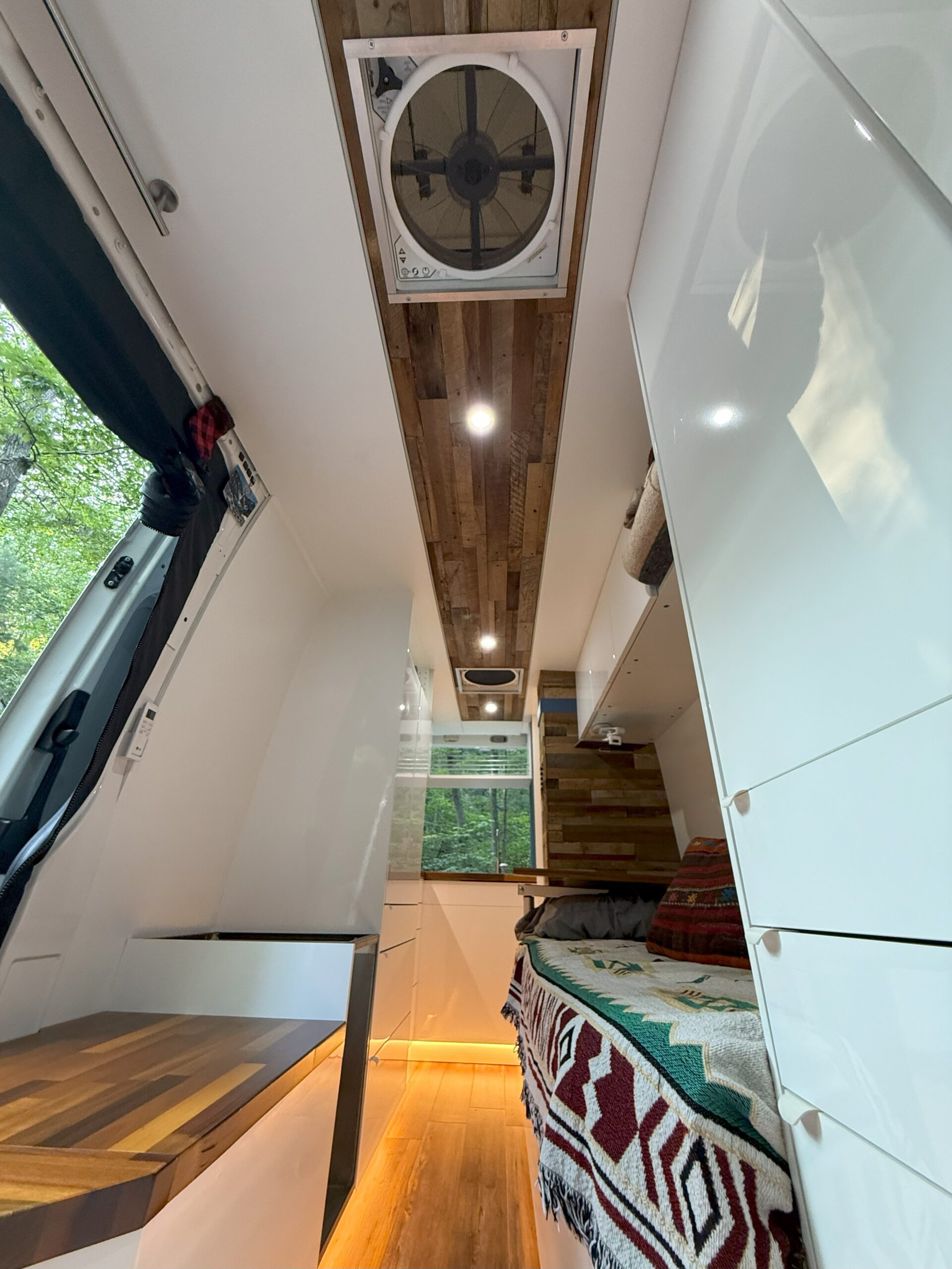 The conversion is designed to be used for full time living but is also a great option for those looking to use it as a vacation or weekend getaway vehicle. As full time living was the primary purpose the interior was built with plenty of storage, ease of access/maintenance, and a modern/rustic tiny home finished feel. The exterior was left unassuming for safety and discretion when necessary; while the interior design was meticulously thought out to allow space but also the ability to access everything from inside. Practicality, ease of access, and easy future expandability were key aspects built into the design. All kept in a self contained system that allows you to wander wherever the adventure takes you. It is a completed build that is ready for adventure.