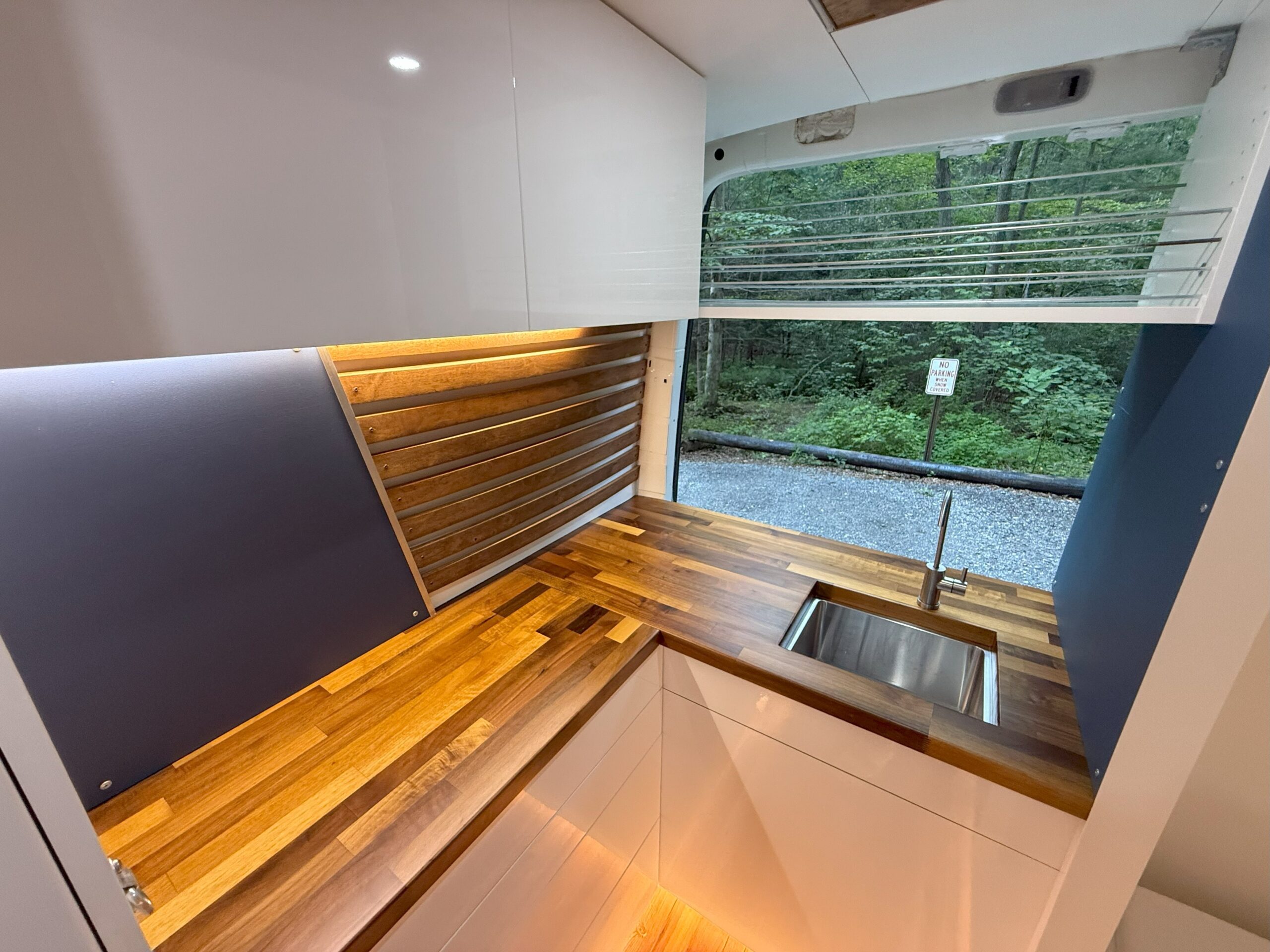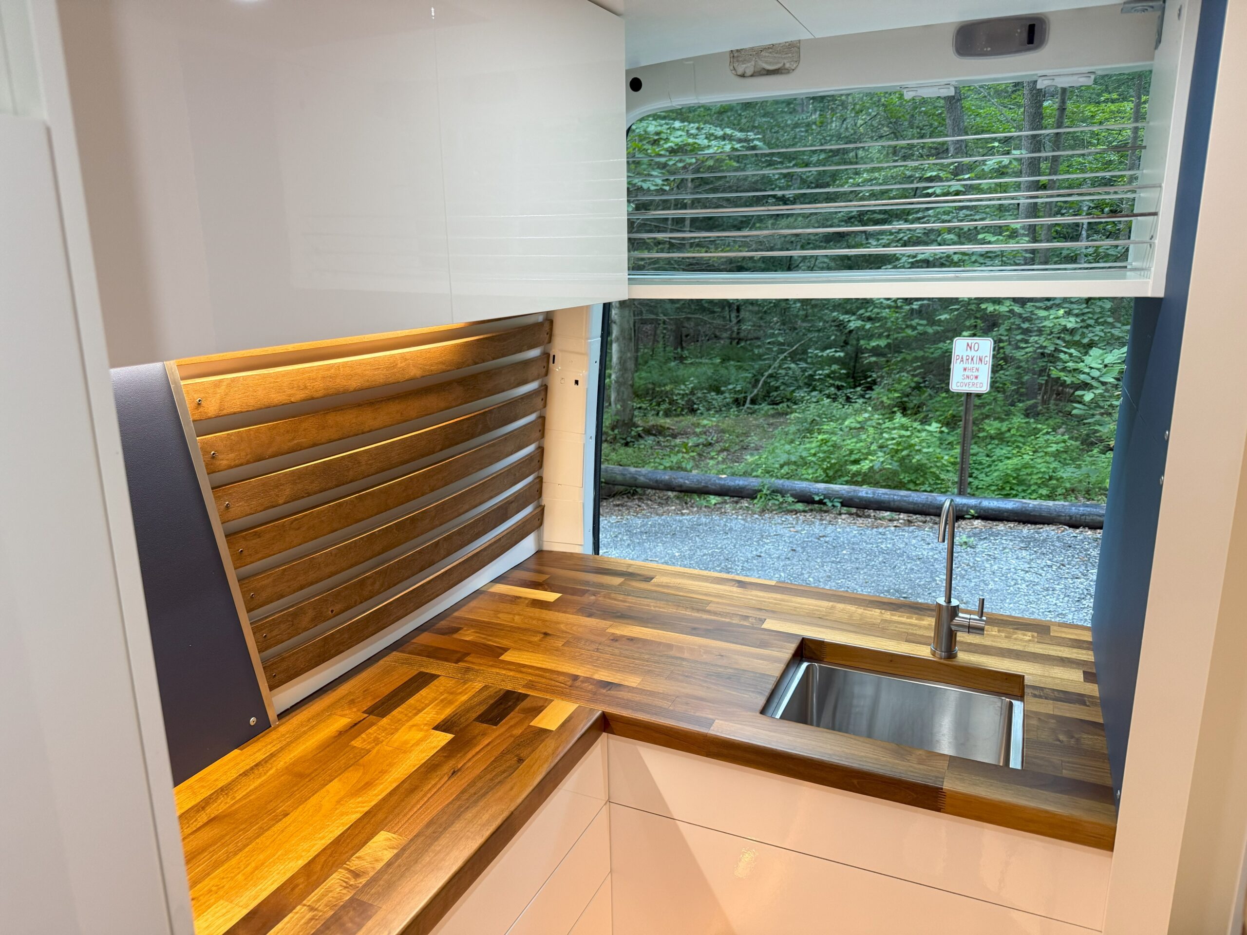- Custom butcher block countertops that are sealed and a stainless steel sink