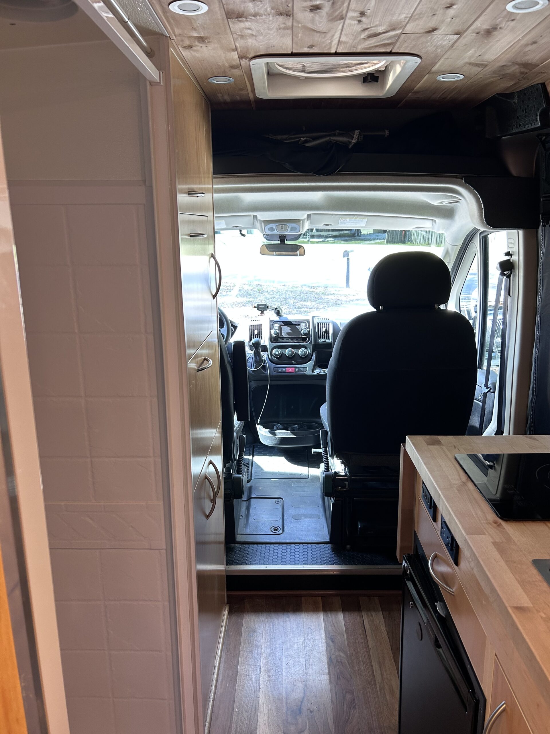 Full size 6" foam mattress, driver's side storage cabinet, overhead storage cabinet, walls built in solid natural wood, solar power, 2000w inverter, MAXXAIR Roof fan/vent, five 100AH Batteries housed inside, Upgraded Alternator Charger, Dometic 80L refrigerator/freezer, solid butcher block countertop, internal 26 gallon fresh water water tank, 3 gallon interior grey water sink tank, Carbon monoxide/LP