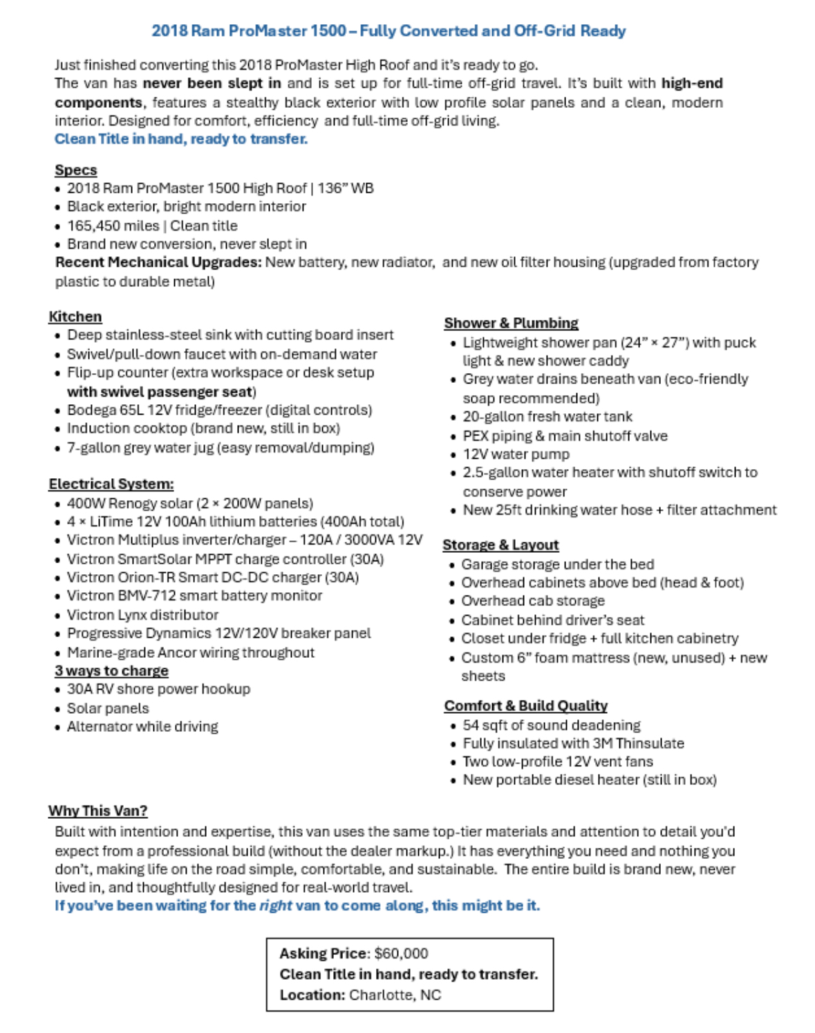 2018 Promaster – Solar Powered with Upgraded Suspension/Tires