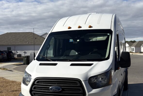 The van has a back up camera and is RWD. Although the key fobs don’t work (the buttons), the keys work (you just have to open everything manually). The tire pressure light and information light have been on since the van was converted by the previous owners, however I have had no issues with the tire pressure. I took the van into a Ford dealership to check out the key fobs and the tire/information lights. They said that there is one sensor that controls both of those (and the automatic windshield wipers) and that it’s behind the storage space built above the driver and passenger seat (picture 5). I have the quote to fix it, but since it’s never been an issue, I just use the keys manually and check the tire pressure every so often.