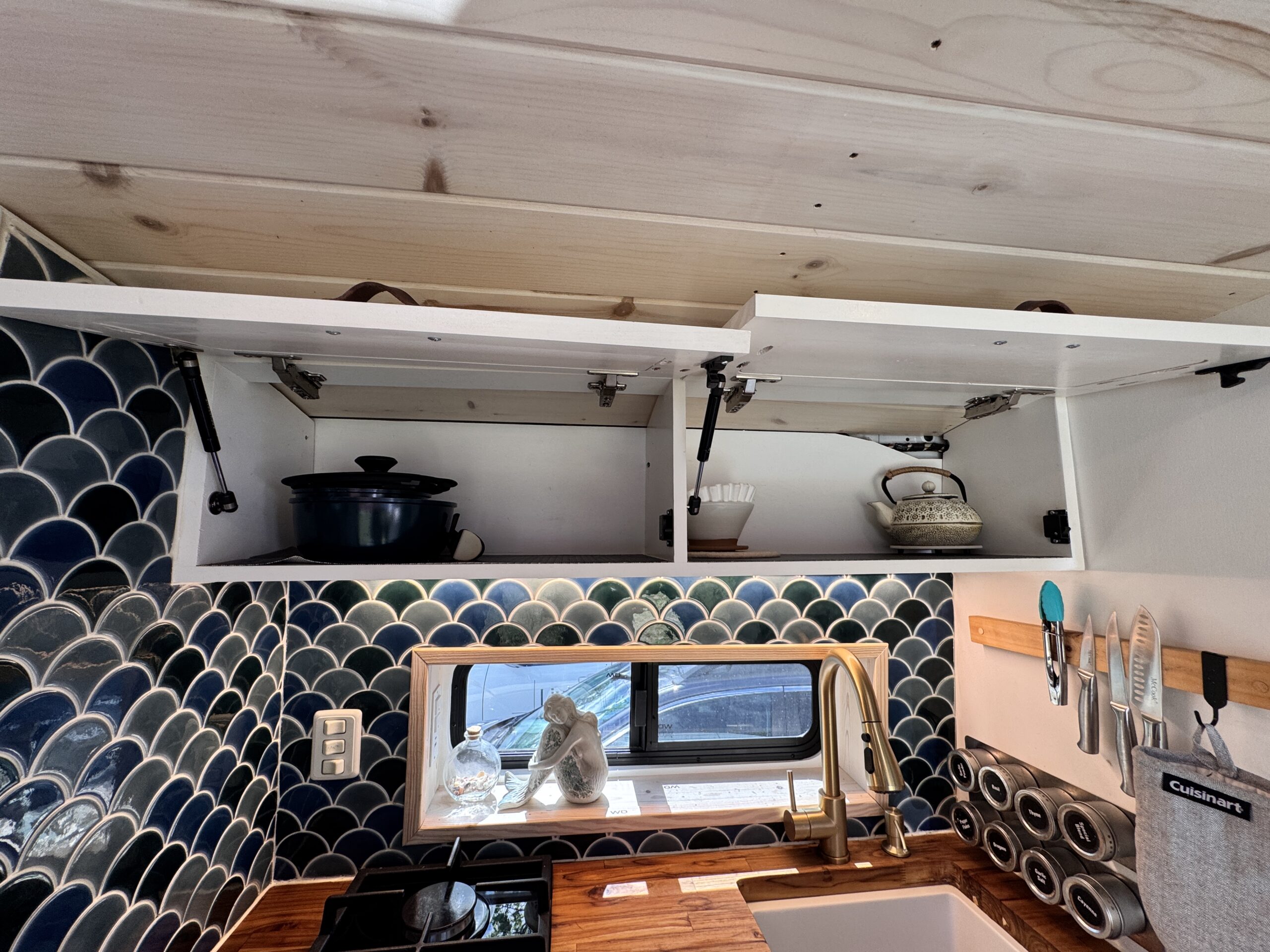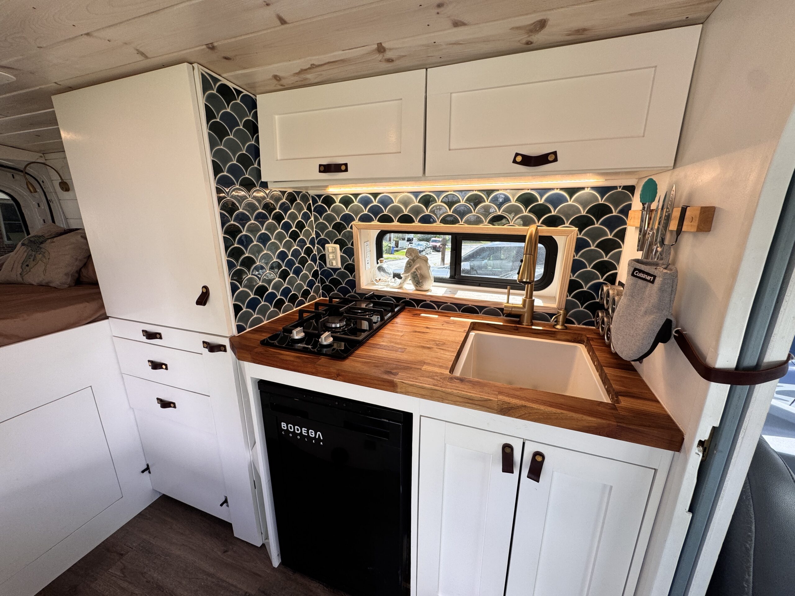-Bright, modern finishes with wood ceiling, white cabinetry, leather pulls, and blue tile backsplash