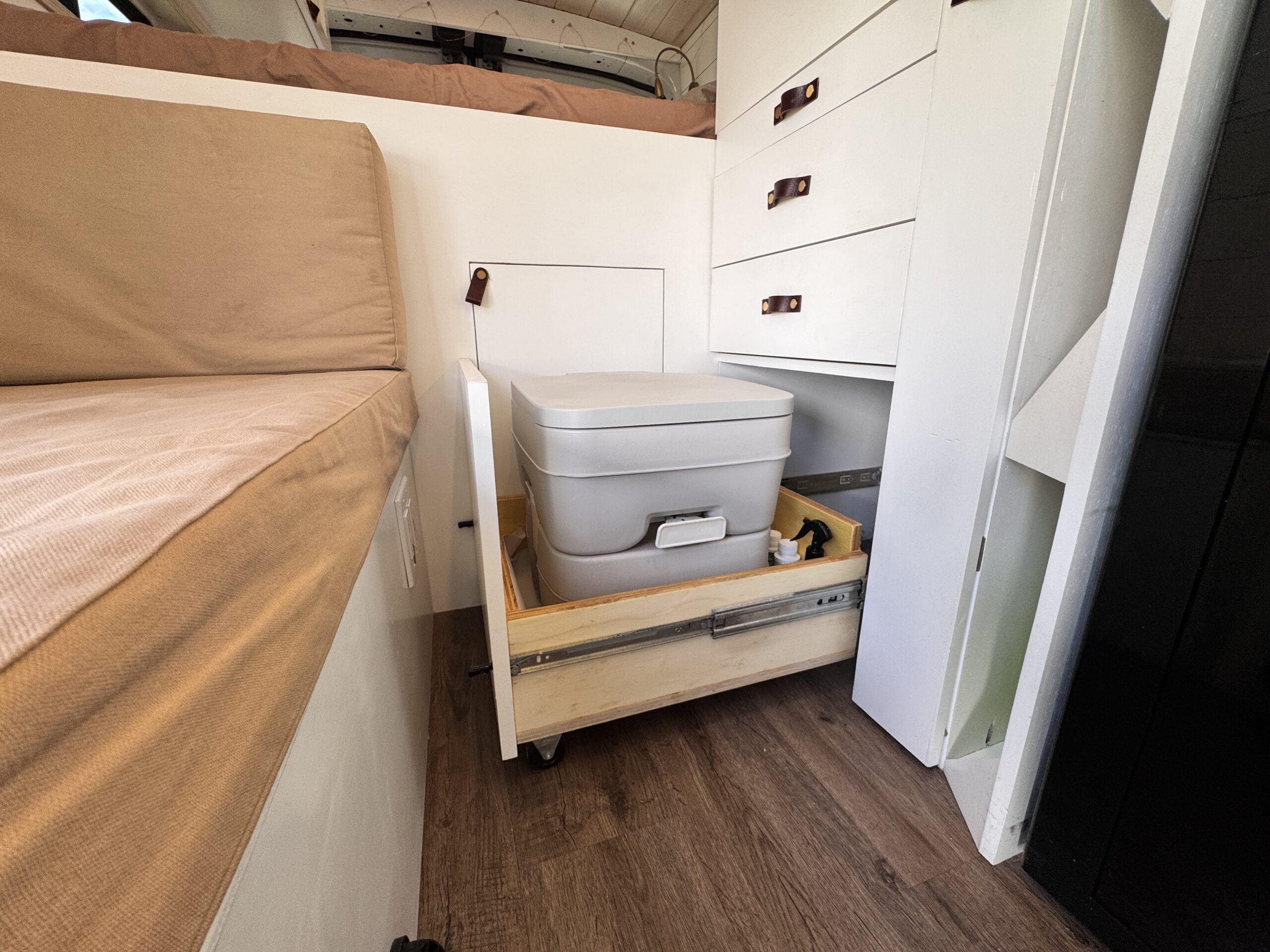 -Chemical toilet stored discreetly in cabinet