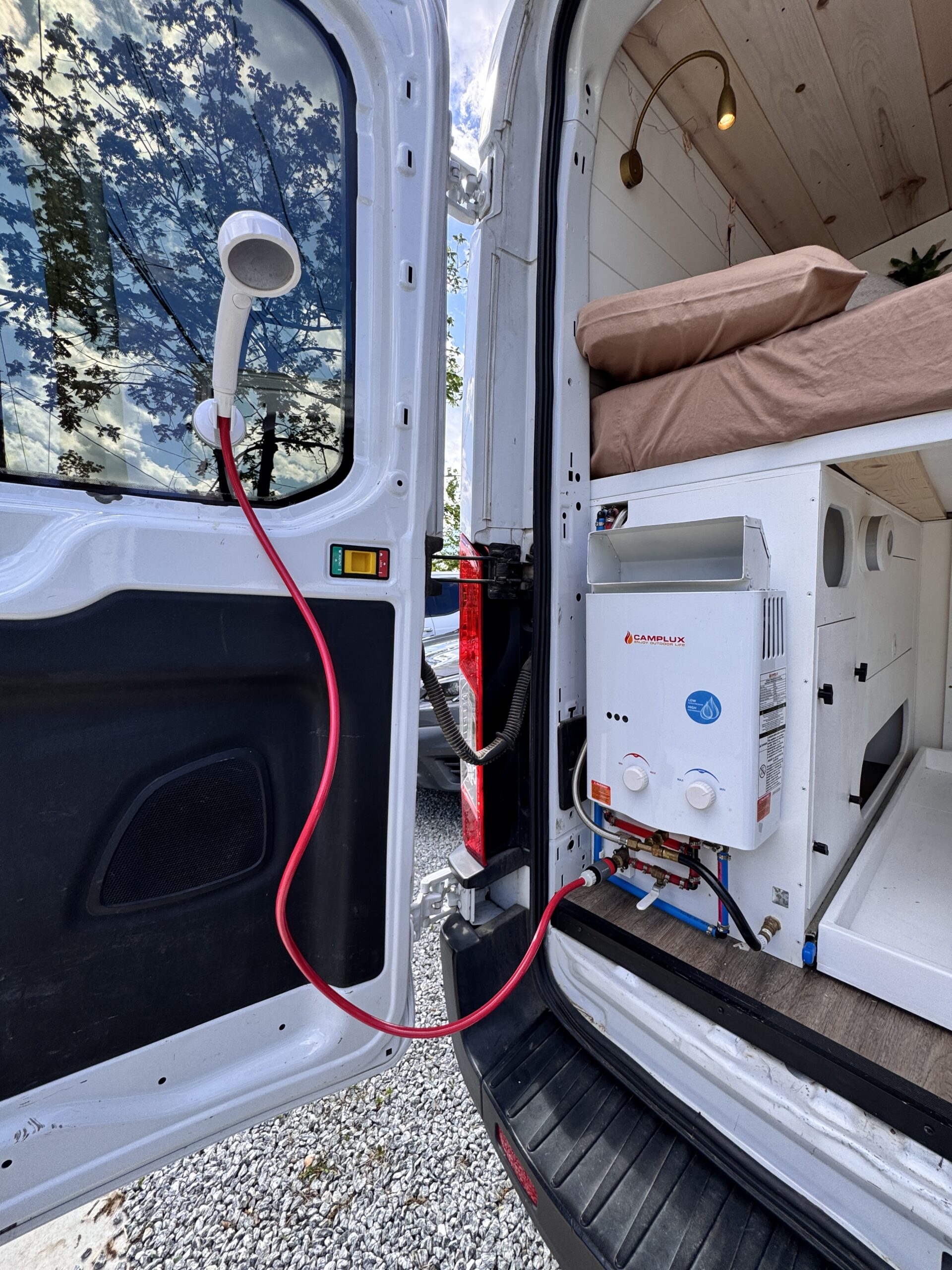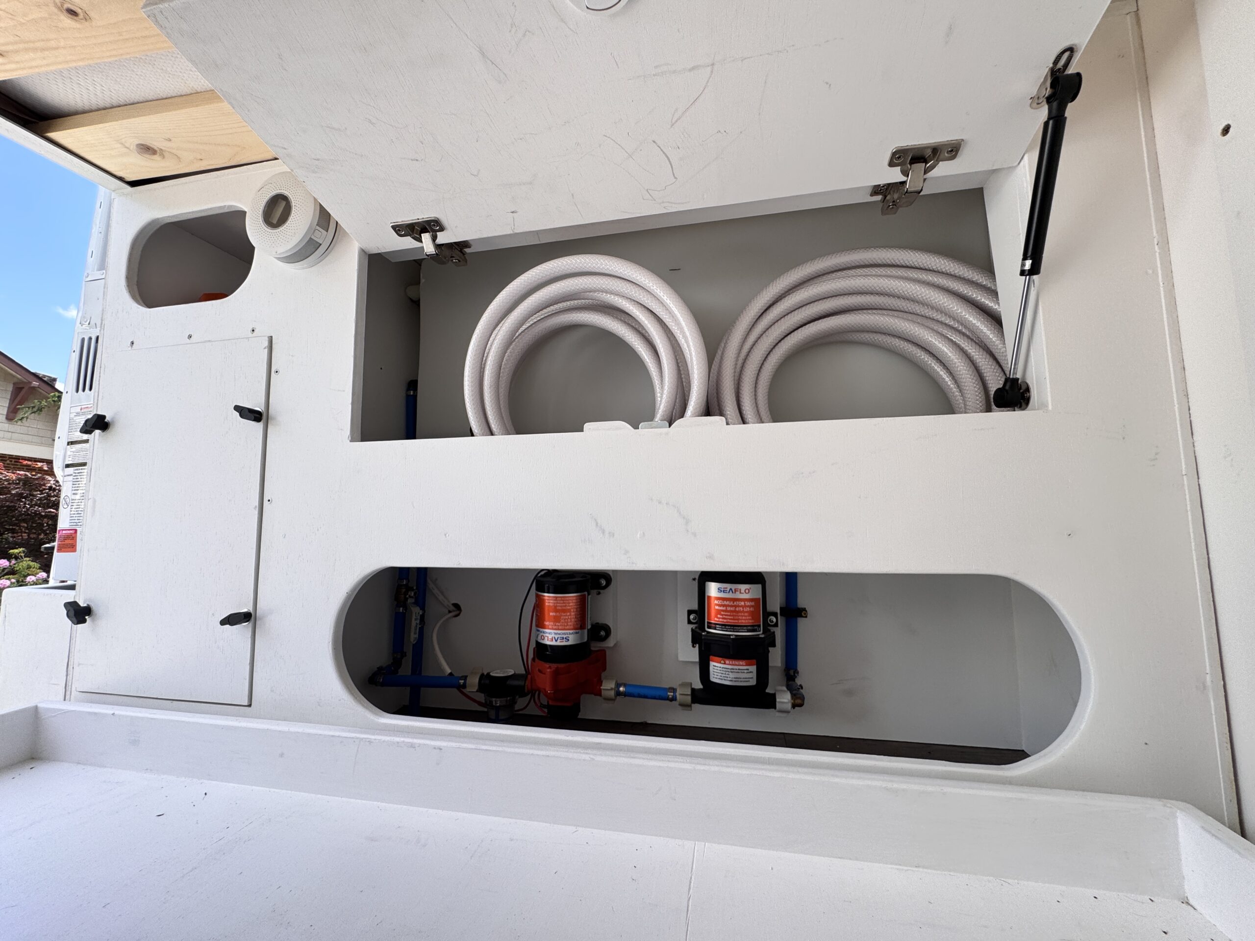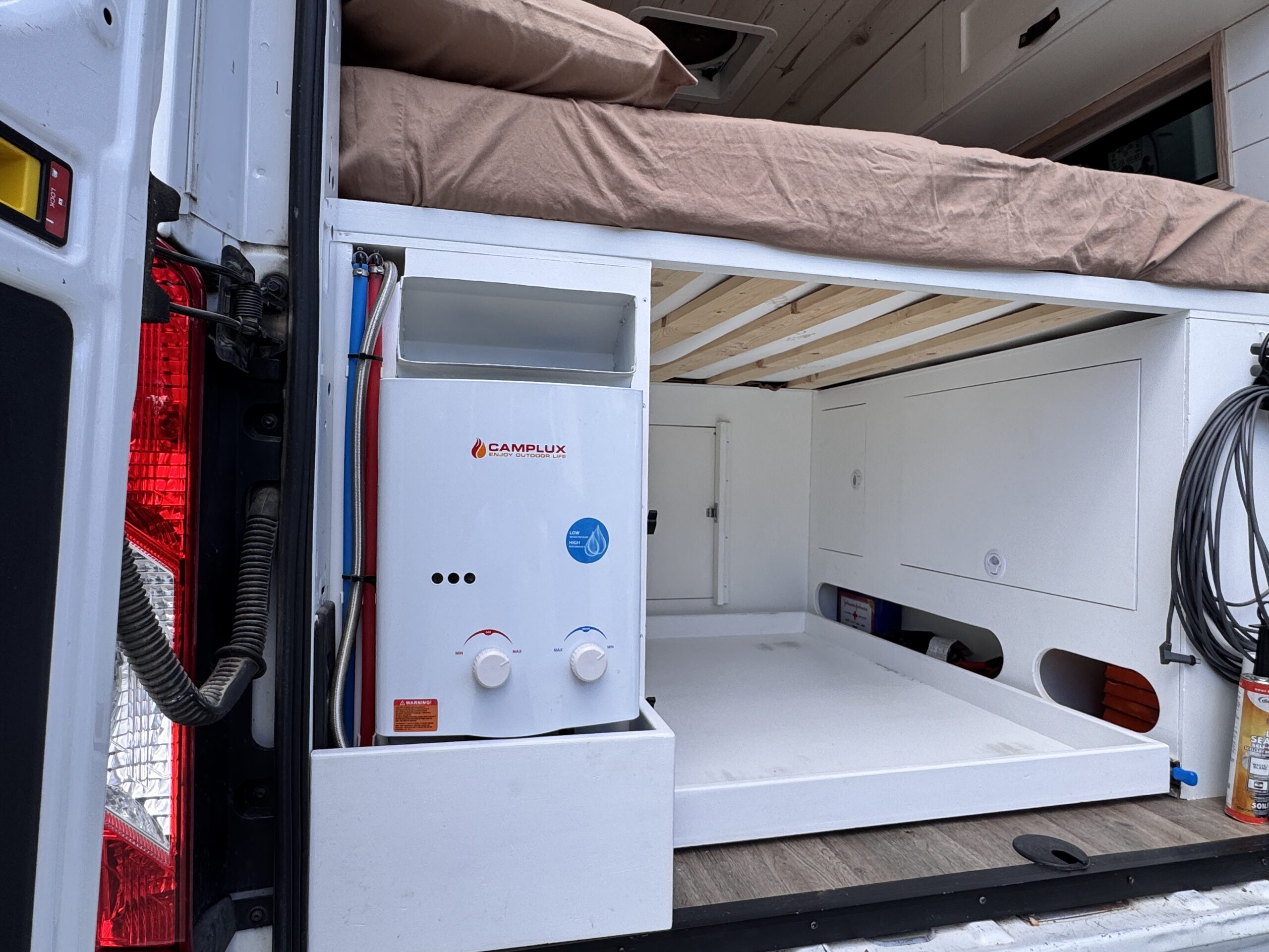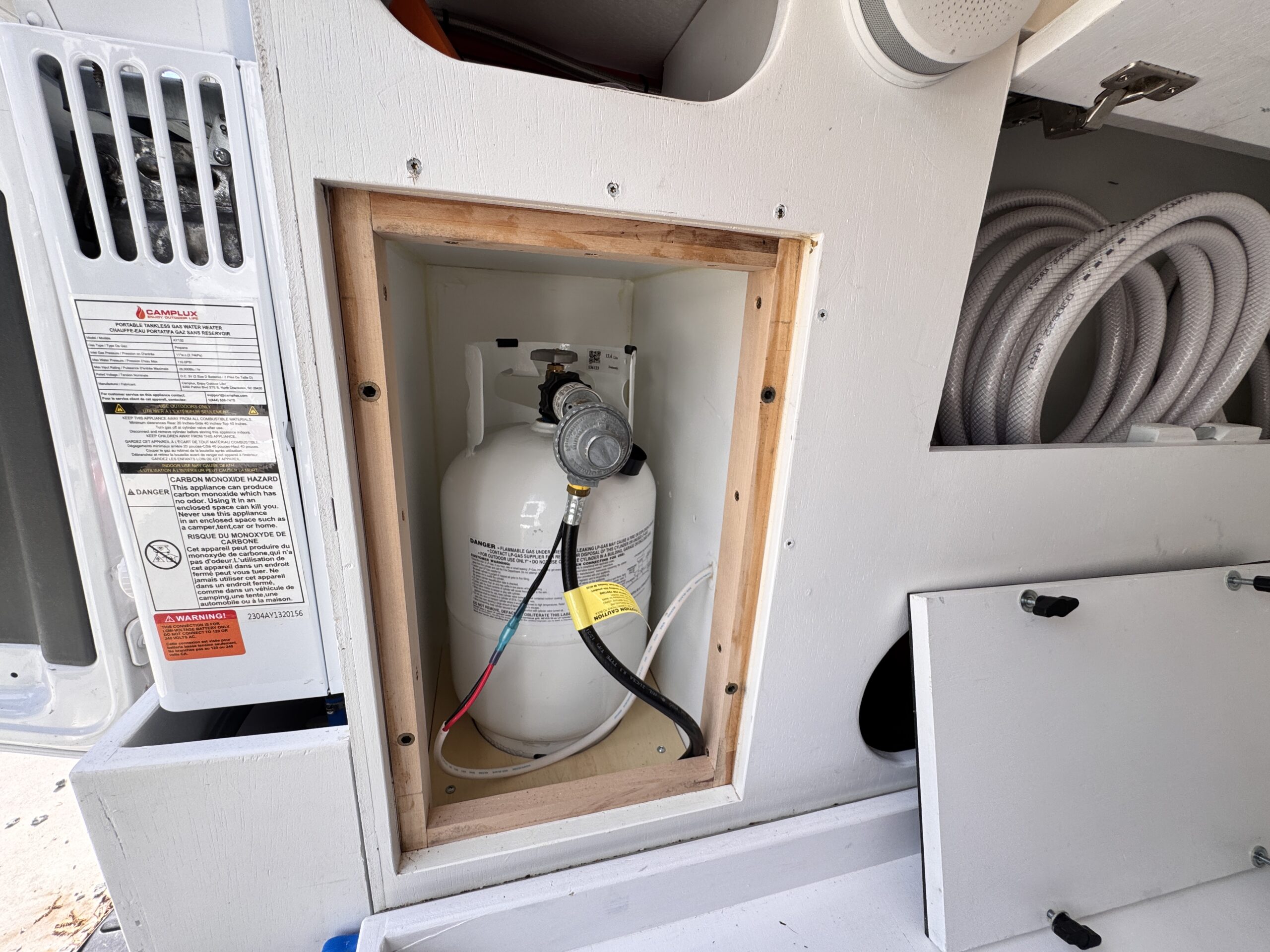 -Sealed and vented propane locker that vents through the floor of the van