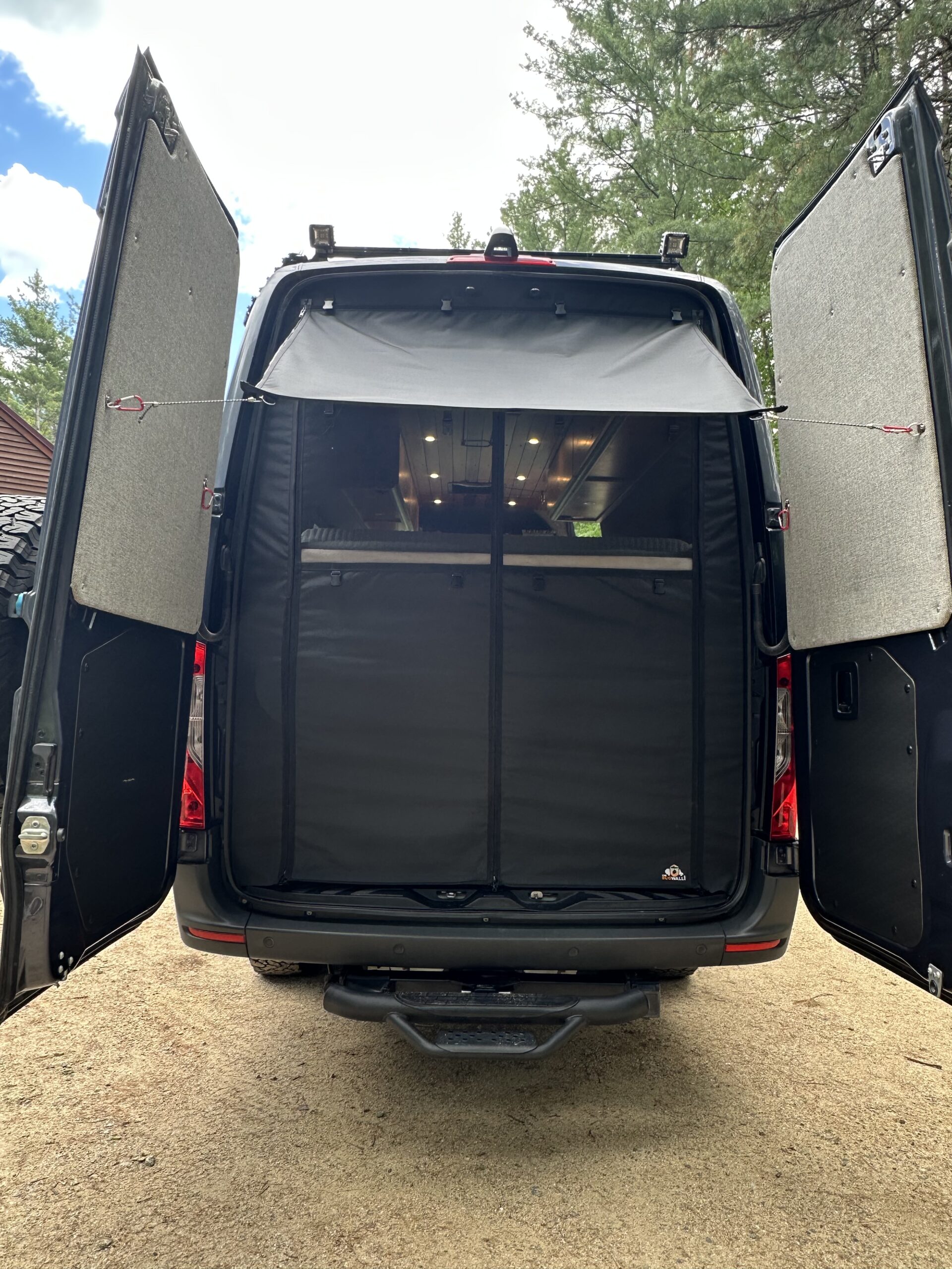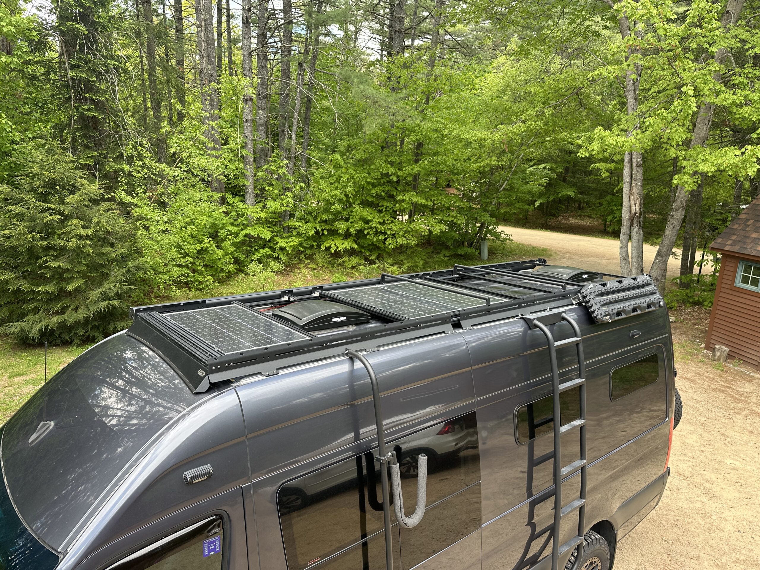 On the roof is a Flatline Van Co roof rack with 300 watts of solar. There are two raised crossbars that we used to mount our Thule box in winter and kayak racks in summer. Along the passenger side of the rack there is a Fiamma F80S awning. A Roam Built ladder is mounted on the driver side. Behind the ladder is an Aluminess Surf Pole that we strap our stand up paddleboards to. On the rear doors you will find an Owl Vans spare tire carrier, Owl Vans B2 mount and Owl Vans Expedition box. On the passenger side of the trailer hitch is the shore power connection. On the driver side is an air chuck that is fed by an ARB dual compressor mounted under the hood.