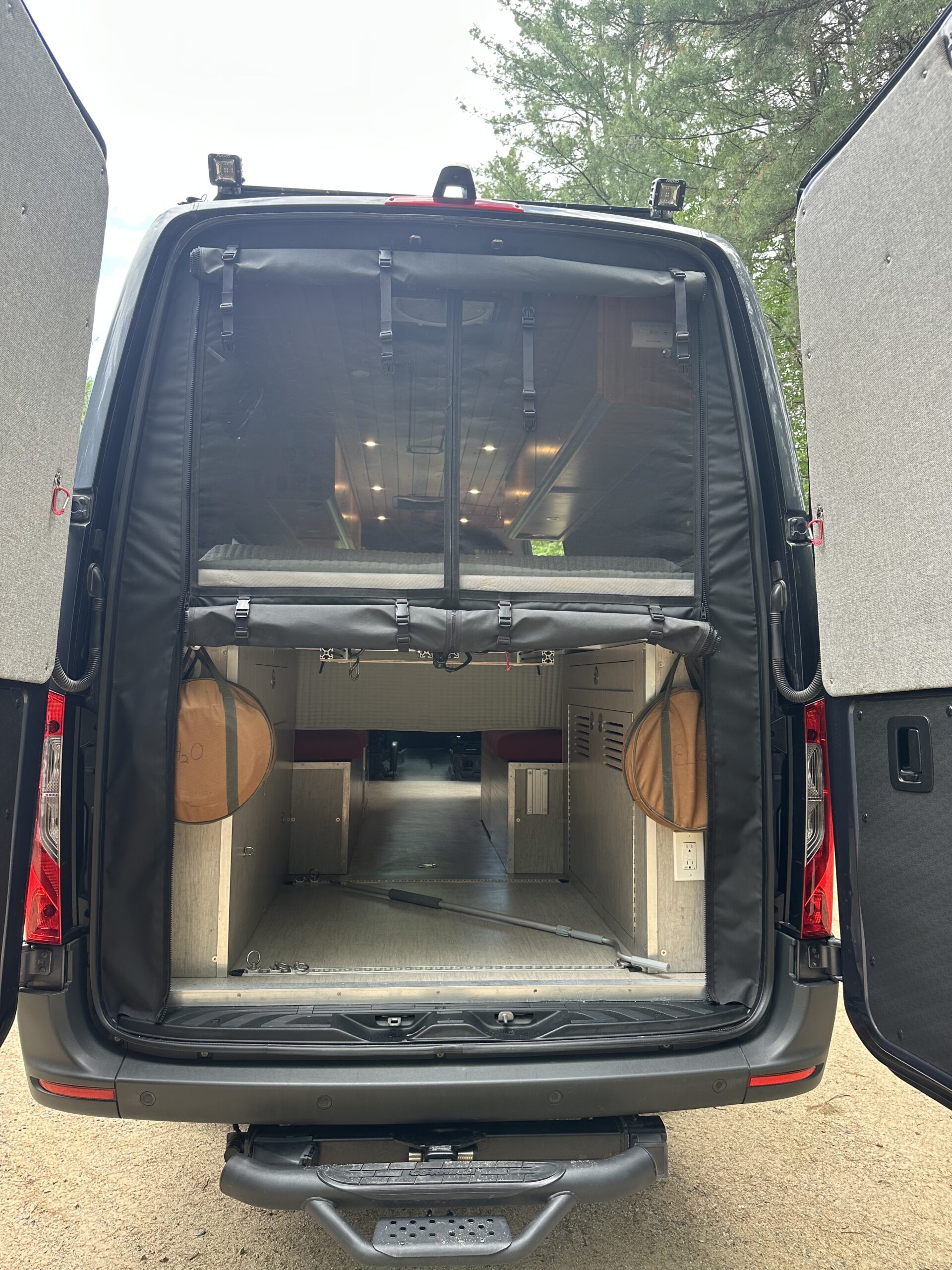 To the rear in the passenger side base cabinet is the Natures head composting toilet. Behind the base cabinets are two jump seats, one houses the water heater and the other has storage underneath. In the front of the passenger side base cabinet there are three huge drawers providing tons of storage. Under the sink is a dedicated gray tank as well as the water pump and ball valves for the water system. There’s also a large trash can under there. In between the two jump seats in the floor there is a drain fitting that services the removable indoor shower pan. It drains into a 28 gallon gray tank that is mounted in the spare tire carrier. The tank has a heating pad on it for use in cold weather. There is also an outdoor shower in back of the van with a curtain that stretches between the two open doors.