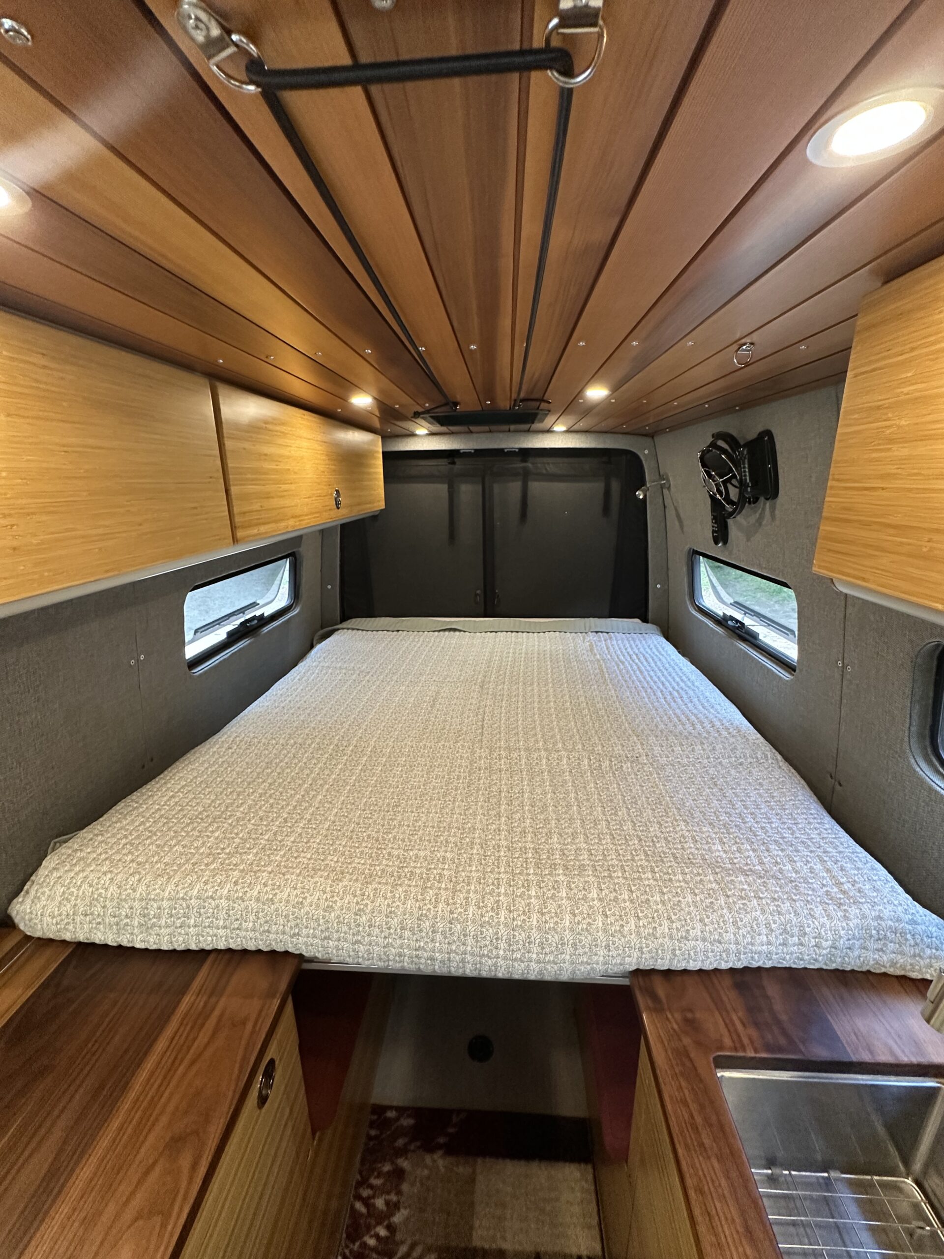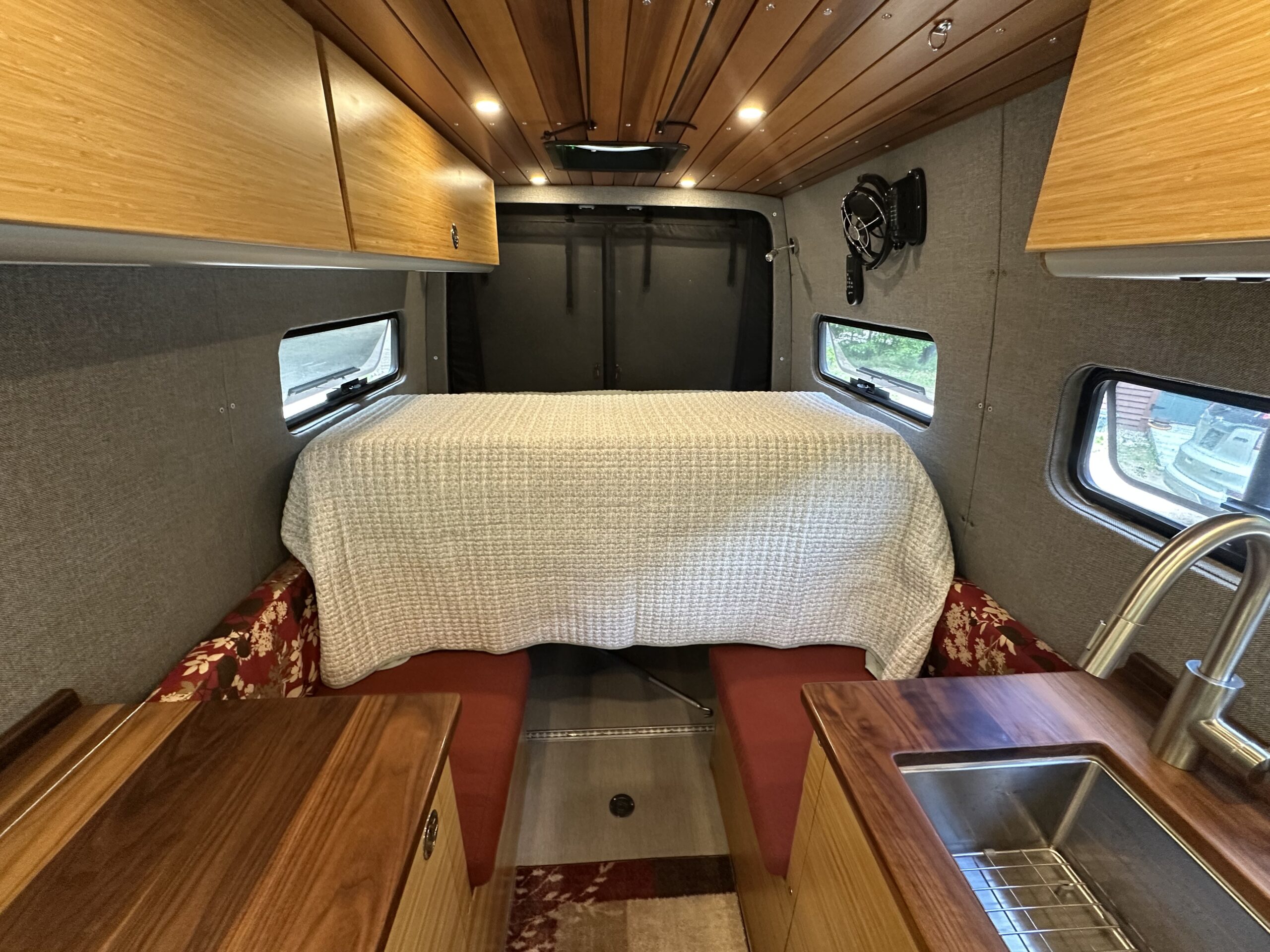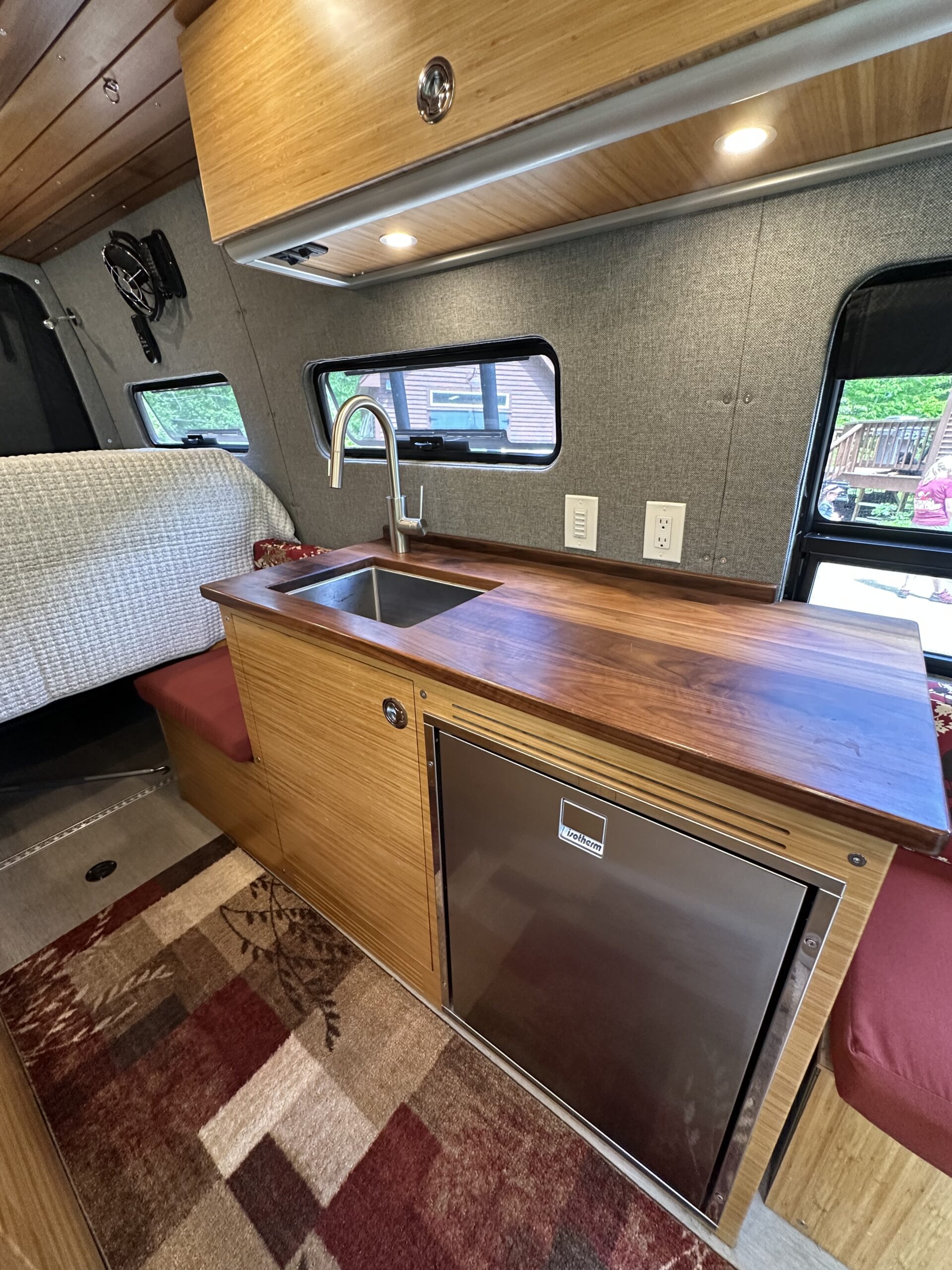 The custom build started with Kilmat sound deadening. 5 Windows were added along with 2Maxxair fans. The van is fully insulated with Thinsulate and kept toasty warm in the winter with an Espar diesel heater. There is 3/4 marine plywood covered in Lonseal vinyl on the floor. The walls are 5mm Baltic birch plywood with landau foam and Duramax tweed fabric. The ceiling has custom milled ship lap cedar. Upper and lower cabinets are extruded aluminum frames bolted to the frame of the van and covered in bamboo plywood. The countertops are black walnut. All the wood is finished with Spar varnish due to the extreme temperature changes the van might encounter.