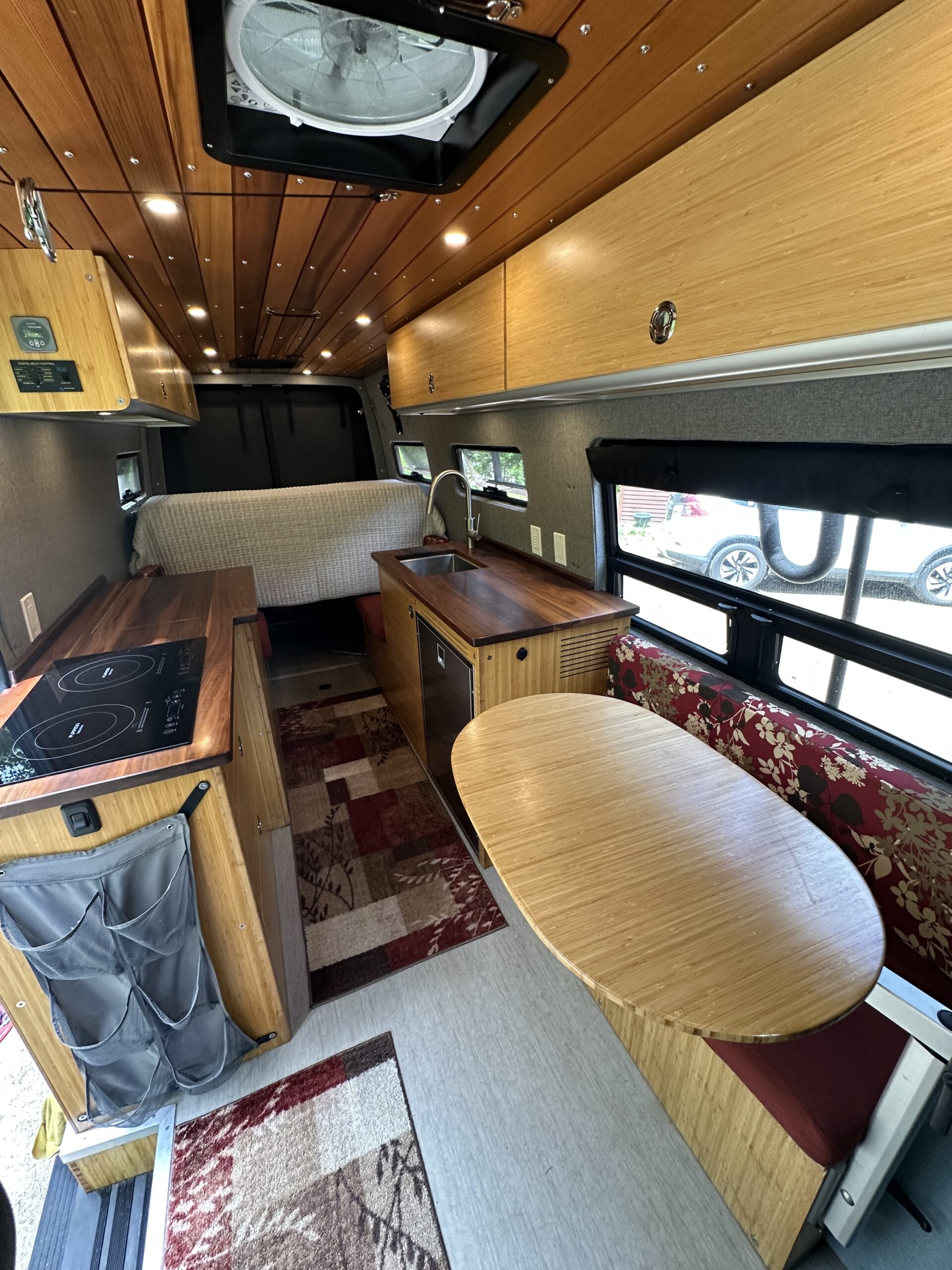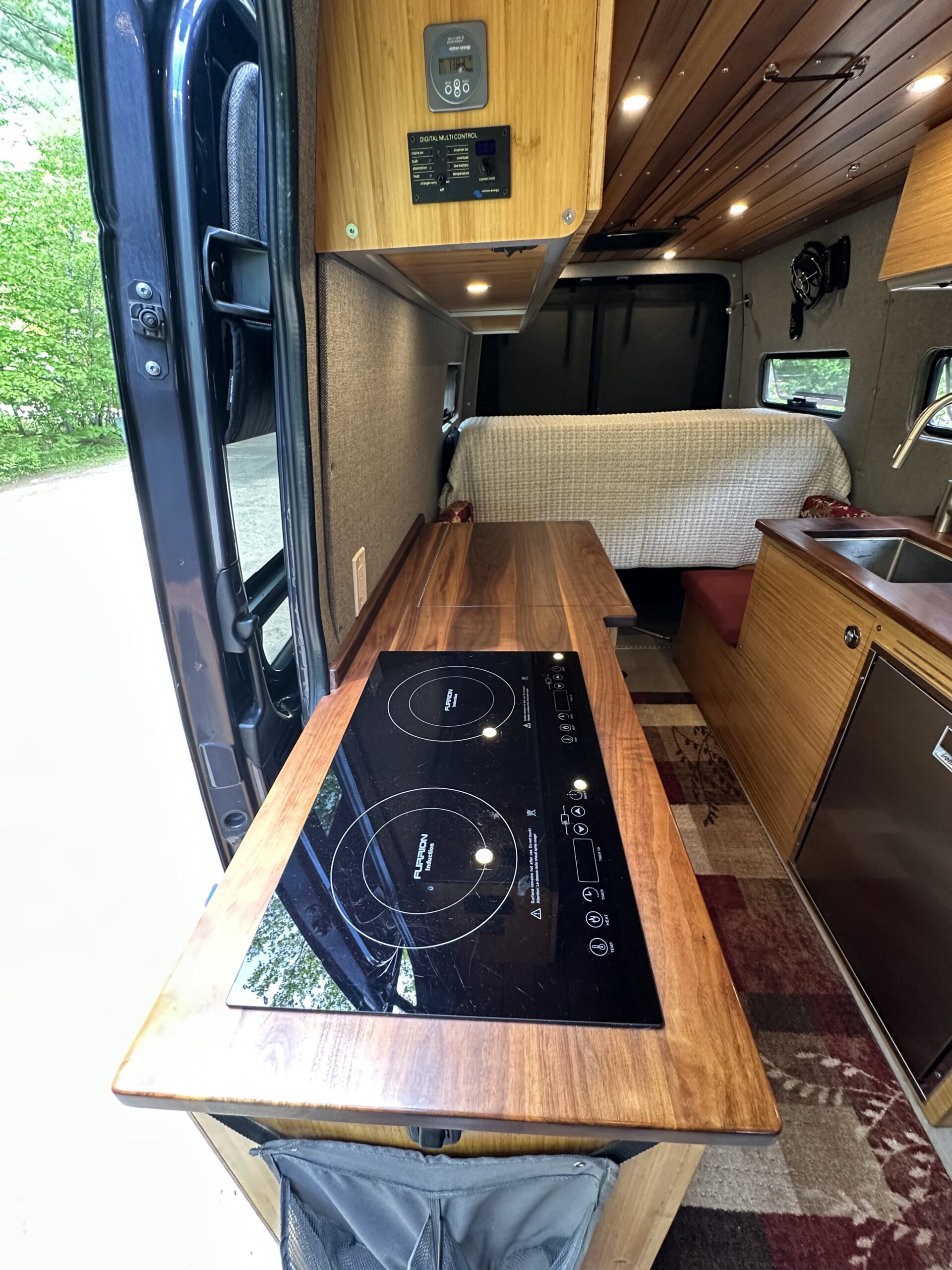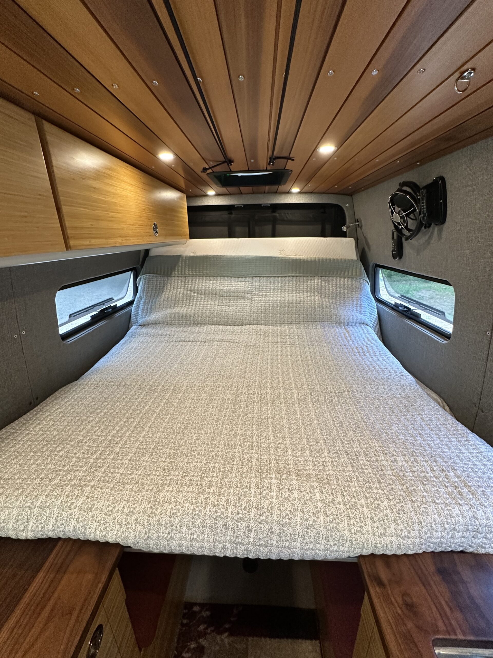 The custom build started with Kilmat sound deadening. 5 Windows were added along with 2Maxxair fans. The van is fully insulated with Thinsulate and kept toasty warm in the winter with an Espar diesel heater. There is 3/4 marine plywood covered in Lonseal vinyl on the floor. The walls are 5mm Baltic birch plywood with landau foam and Duramax tweed fabric. The ceiling has custom milled ship lap cedar. Upper and lower cabinets are extruded aluminum frames bolted to the frame of the van and covered in bamboo plywood. The countertops are black walnut. All the wood is finished with Spar varnish due to the extreme temperature changes the van might encounter.