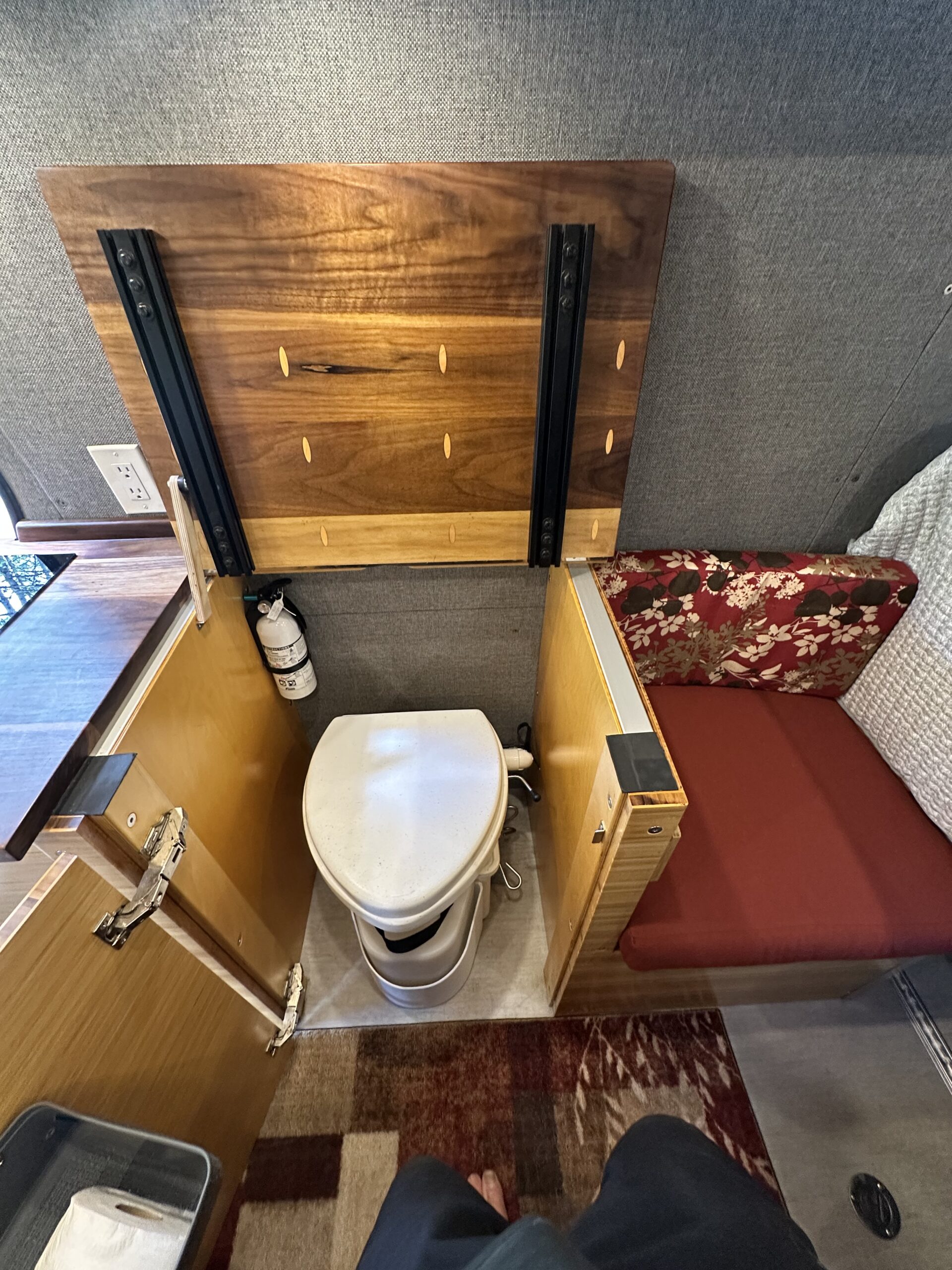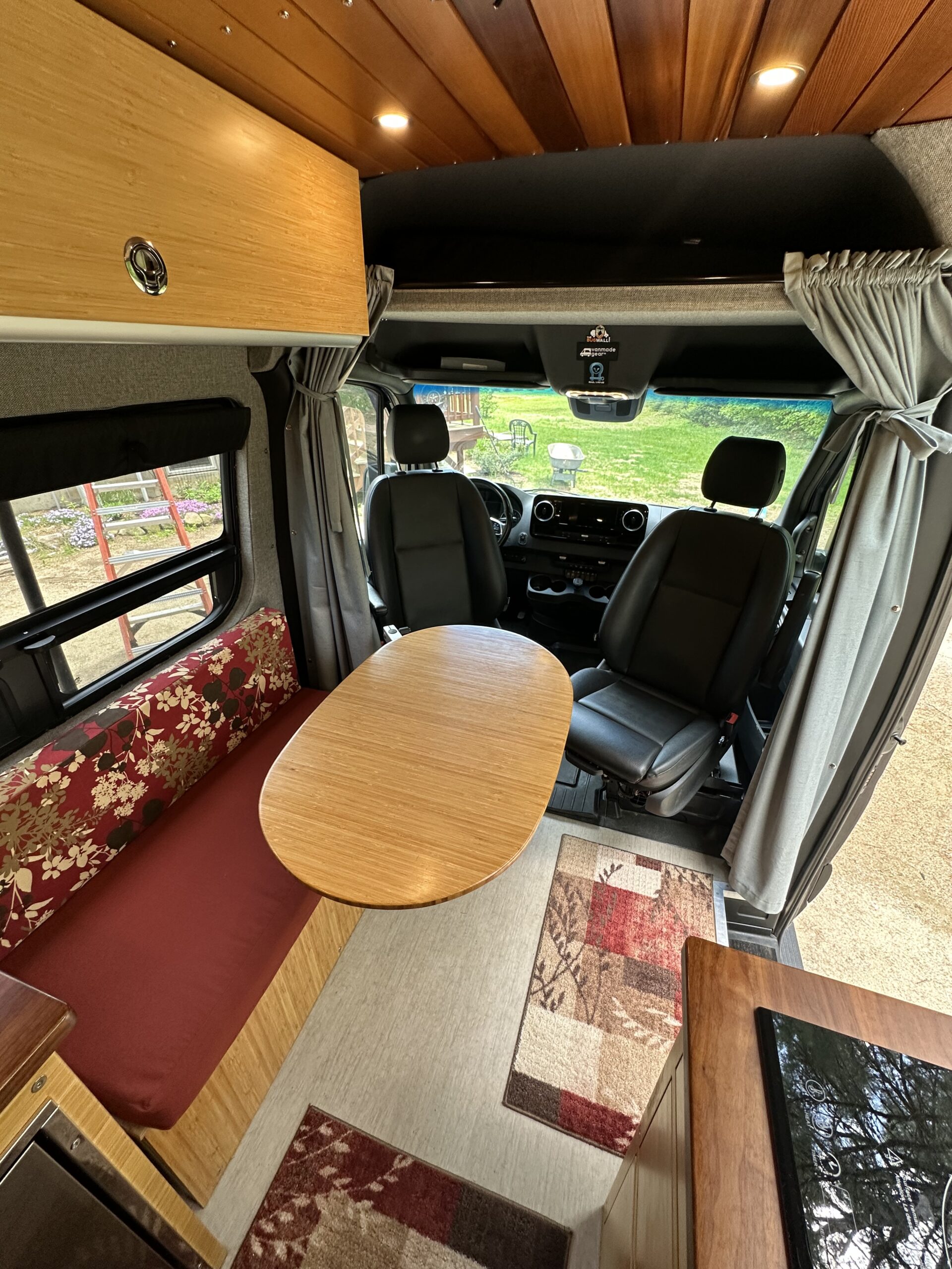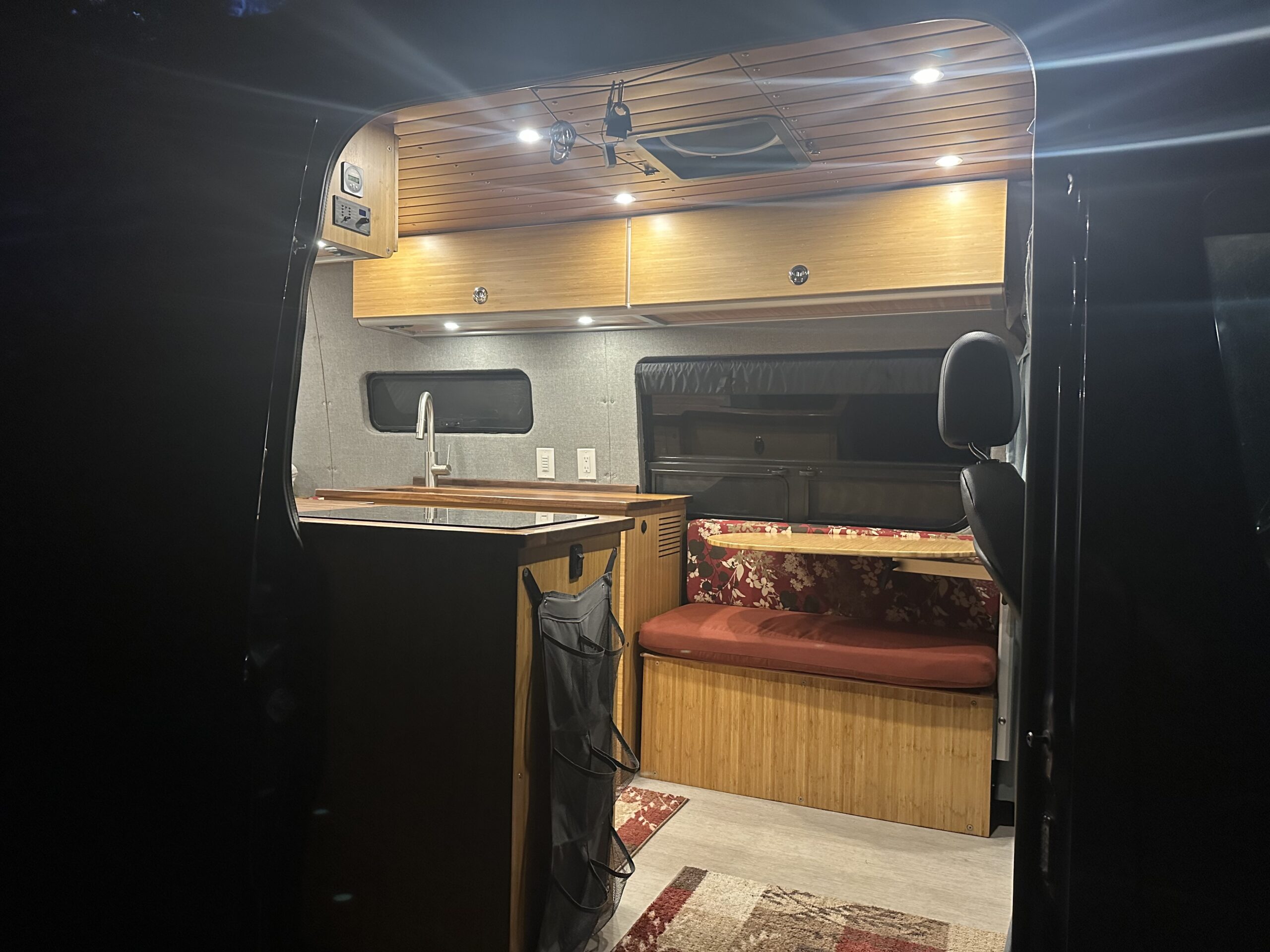 Behind the drivers seat there is a bench with storage underneath and a Lagun mount with a bamboo top. Interior lights are LED puck lights with dimmers.