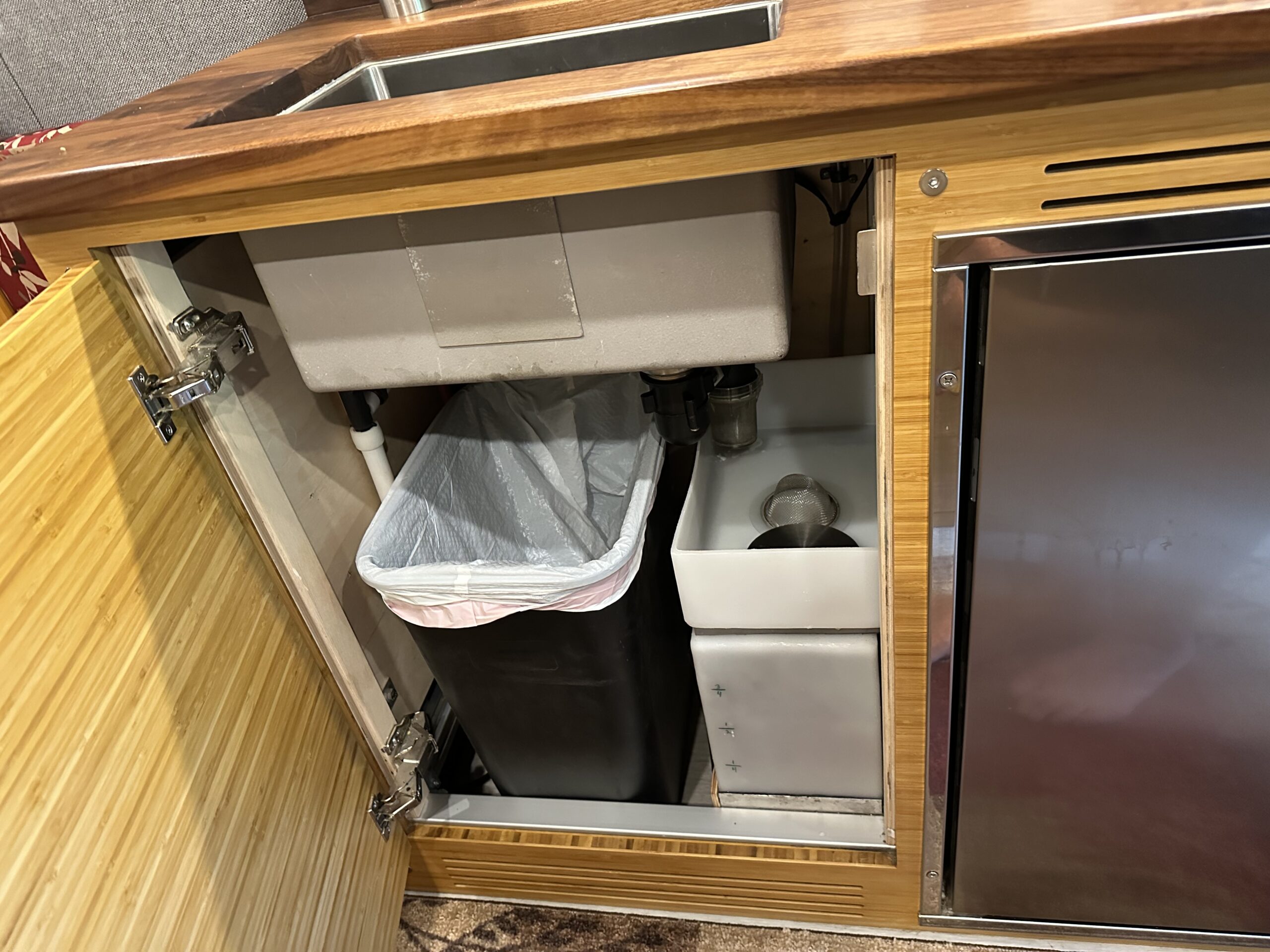 In the galley we have an Isotherm marine fridge, a Ruvati undermount sink and a two burner induction cooktop. Hot water is supplied by a Isotemp marine water heater.