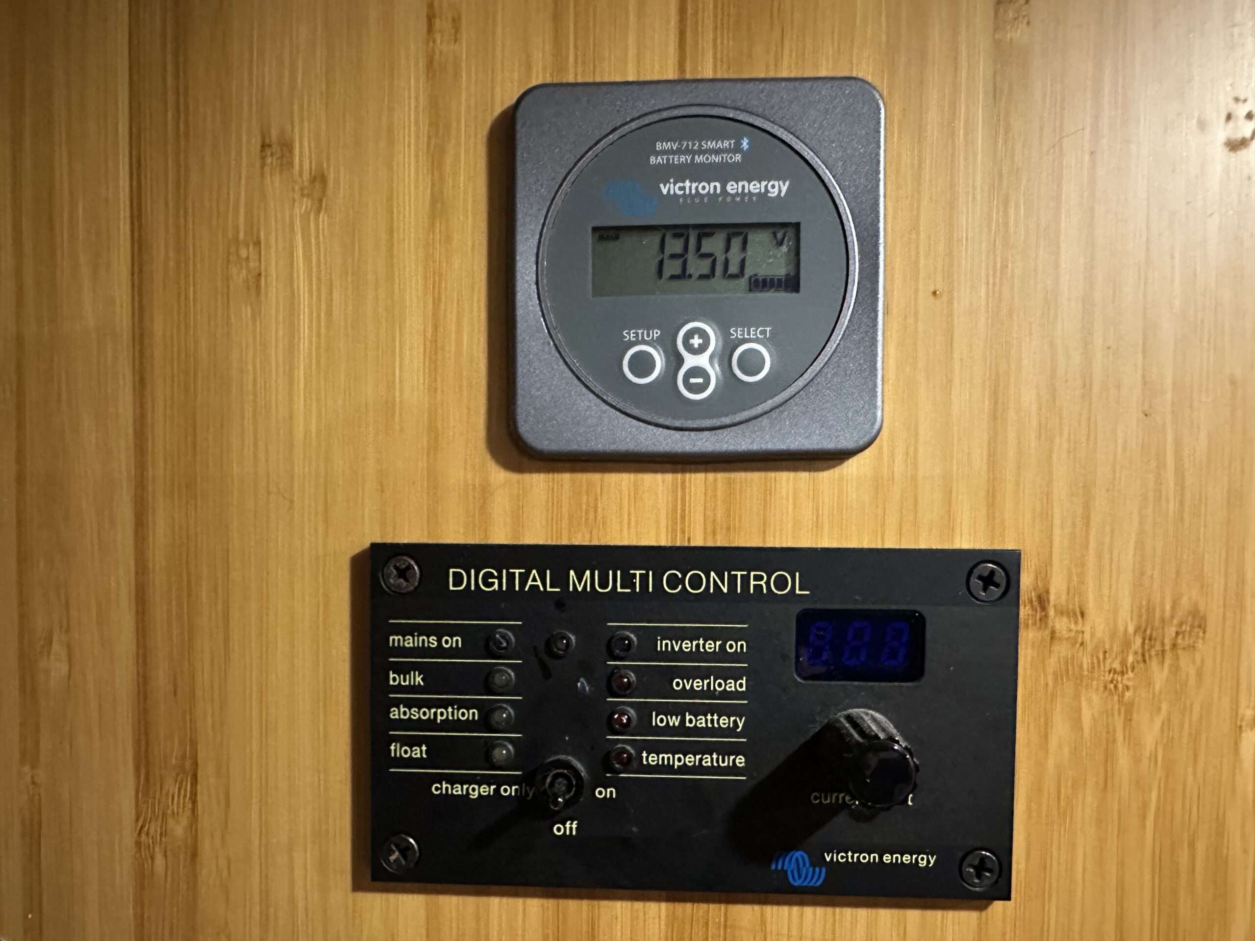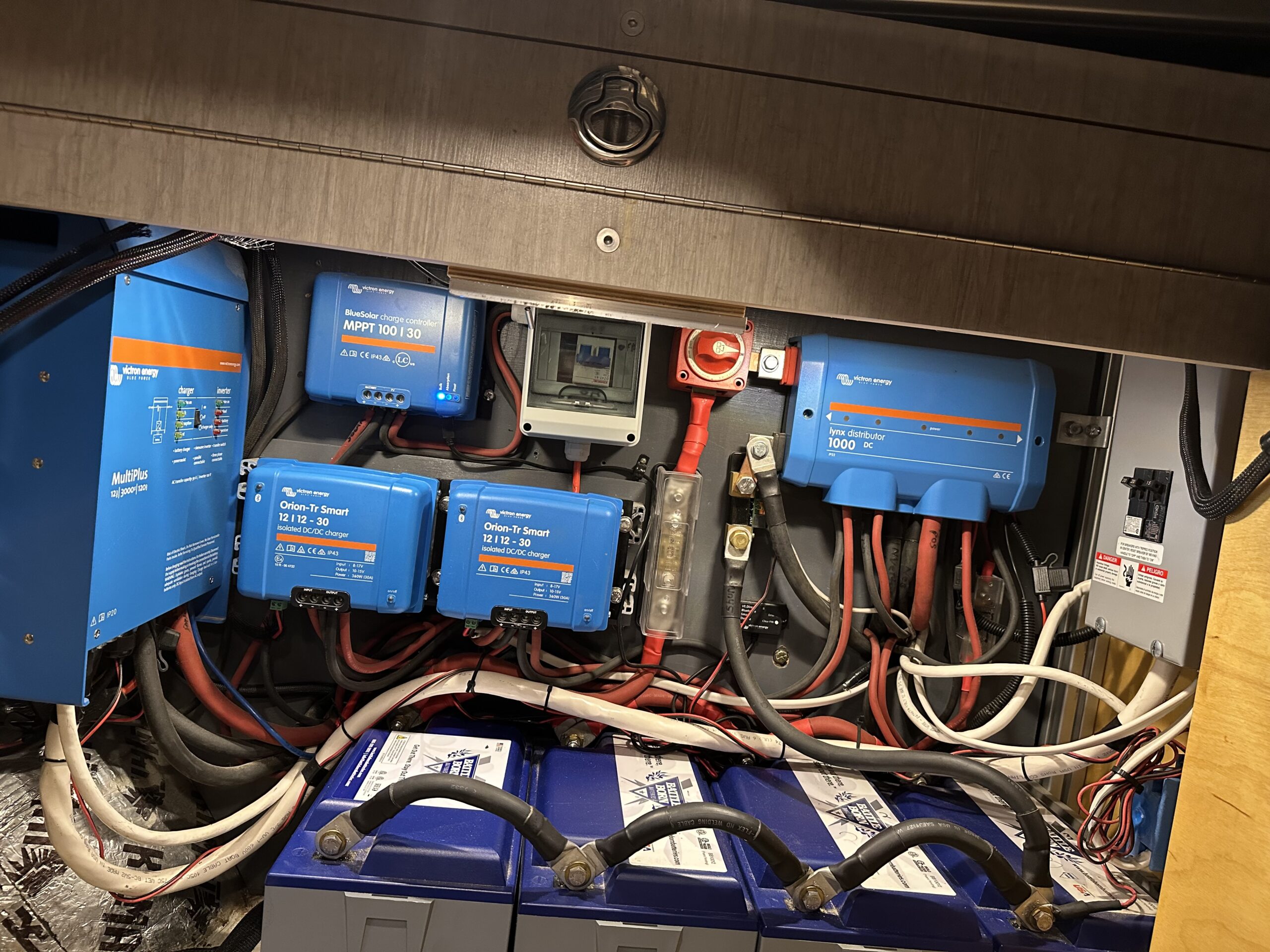 Under the bed in the garage area on the drivers side is a cabinet that houses the 30 gallon fresh water tank with storage above. The cabinet on the passenger side holds the 4-100 ah Battleborn lithium batteries. There is also a 3000 watt Victron inverter-charger, a Victron solar charge controller, 2 Victron 30 amp dc-dc chargers, a Victron Lynx distributor and the ac breaker box.