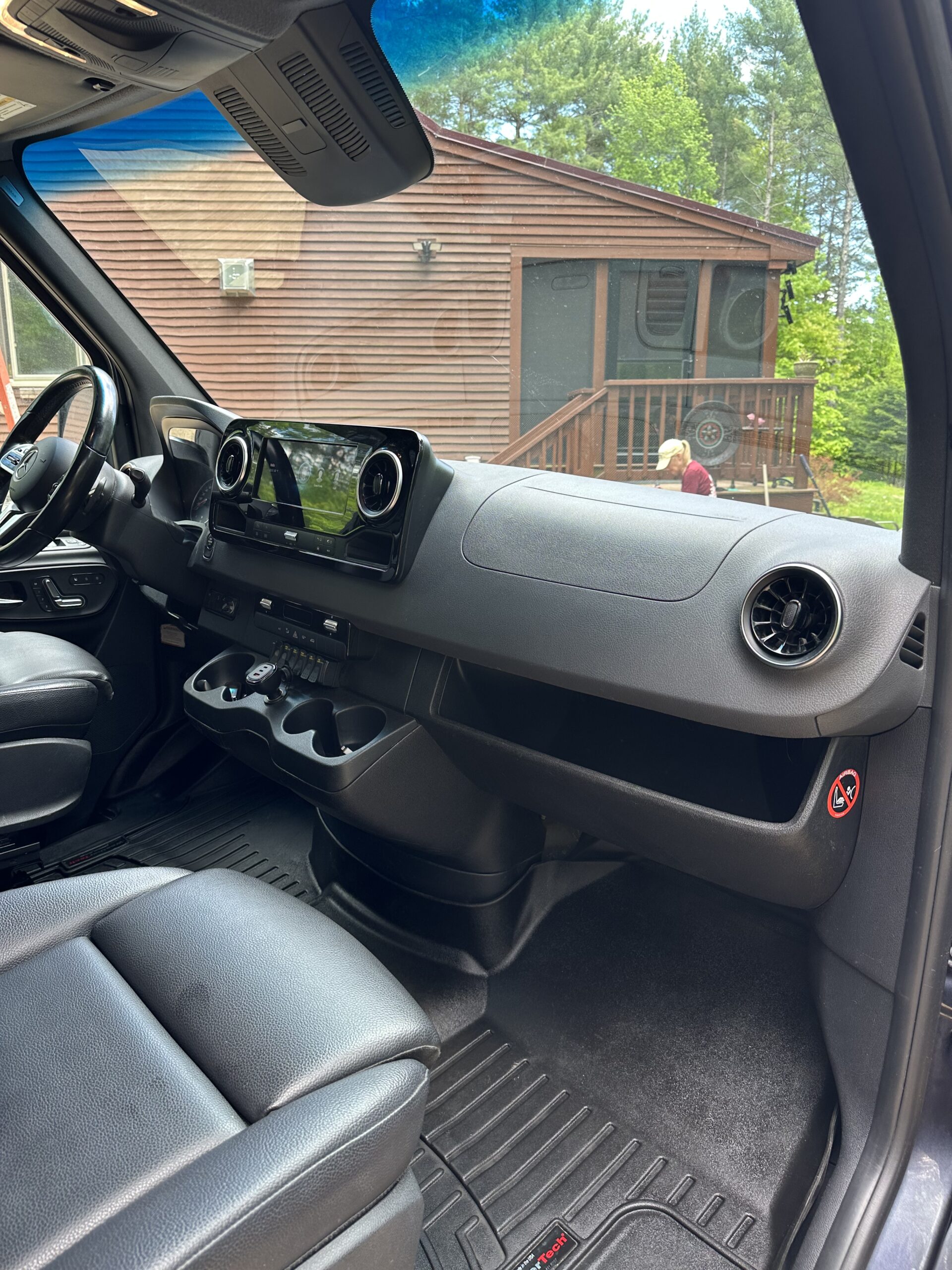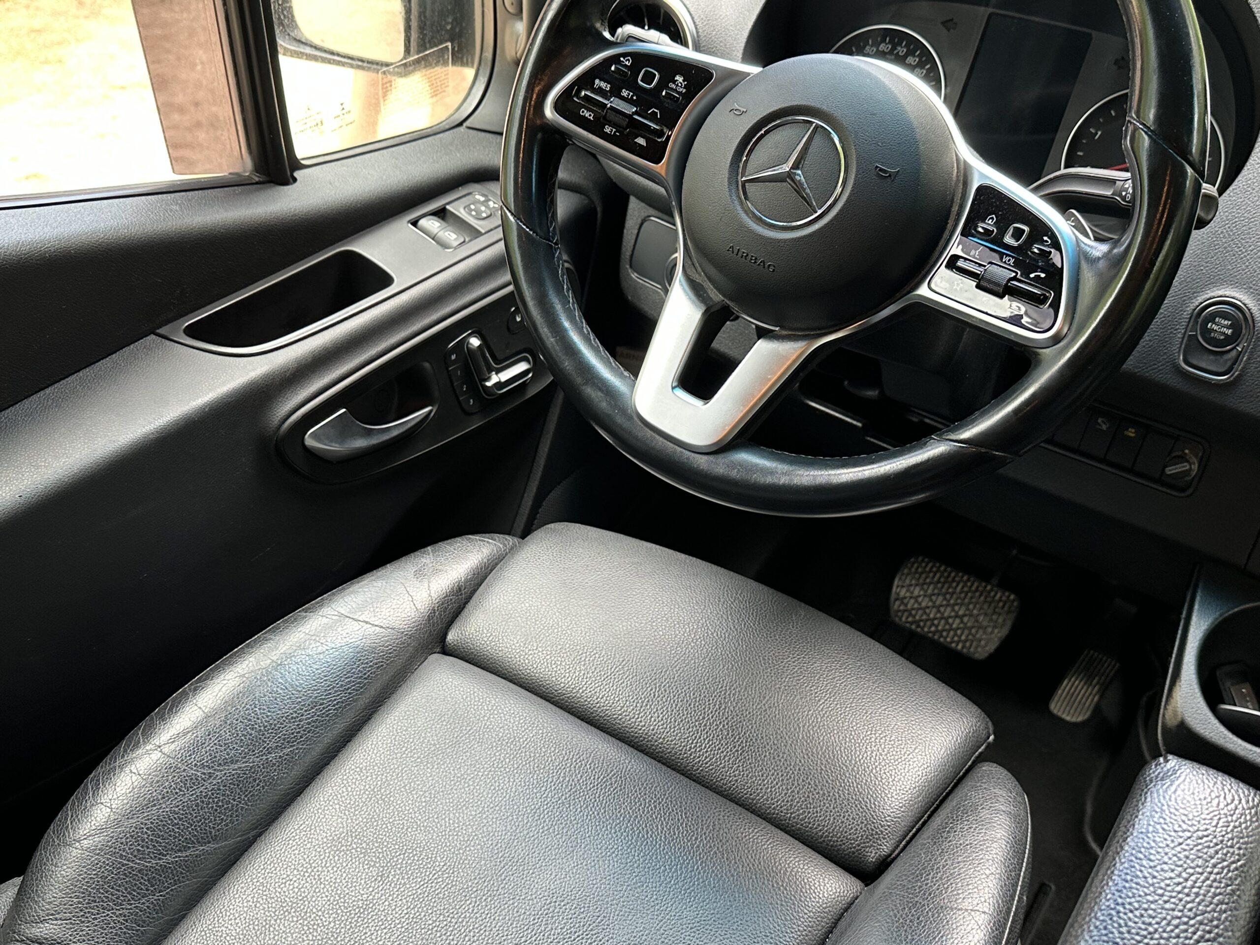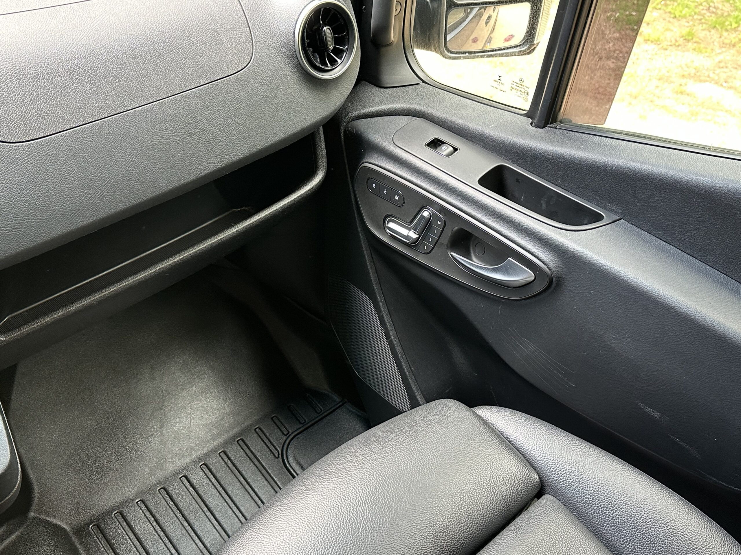 The cockpit of the van is highly optioned with heated black leatherette swivel seats that power adjust with memory. It has the 10.25” screen along with lane keeping, distronic cruise control etc, etc.