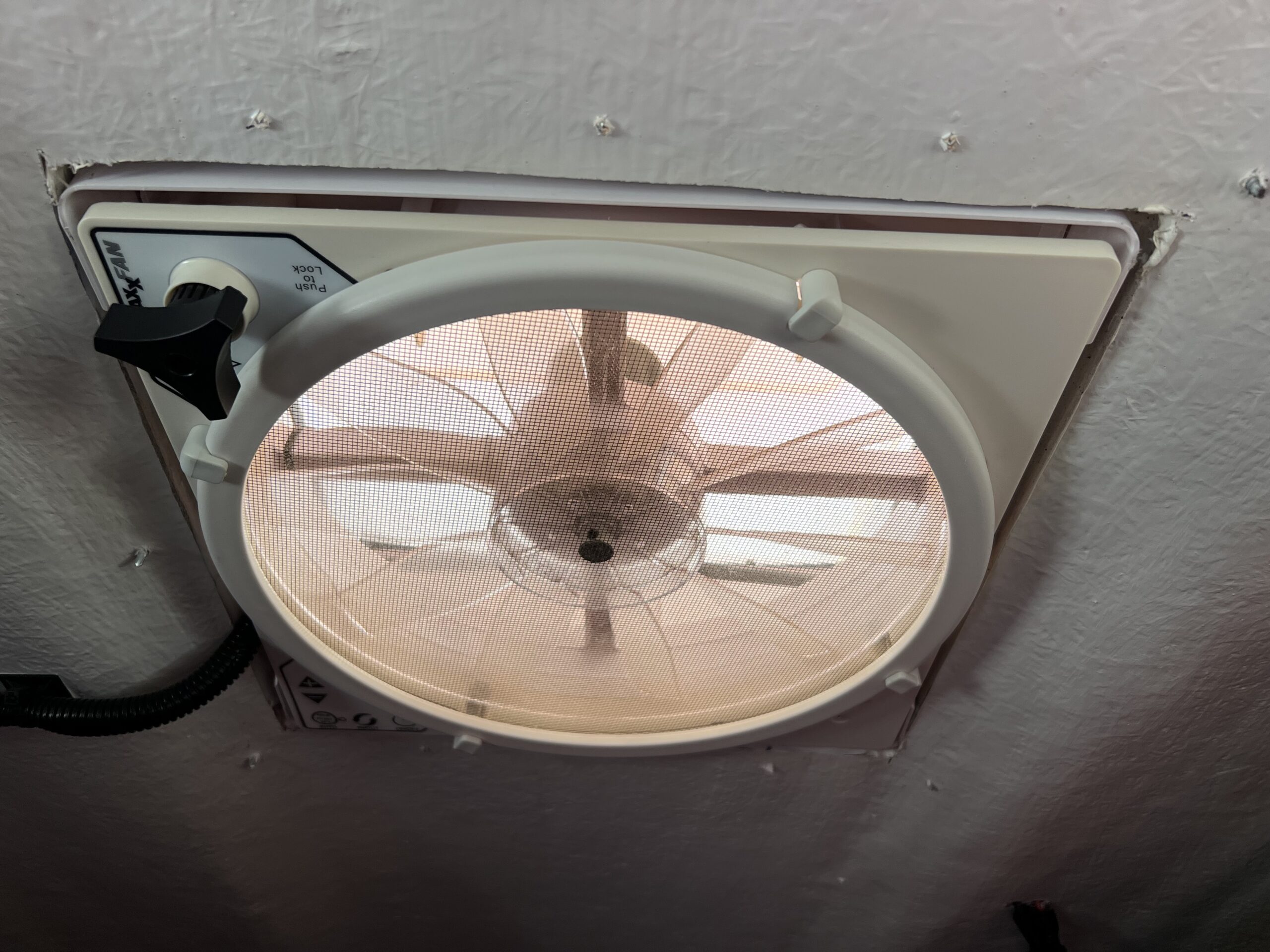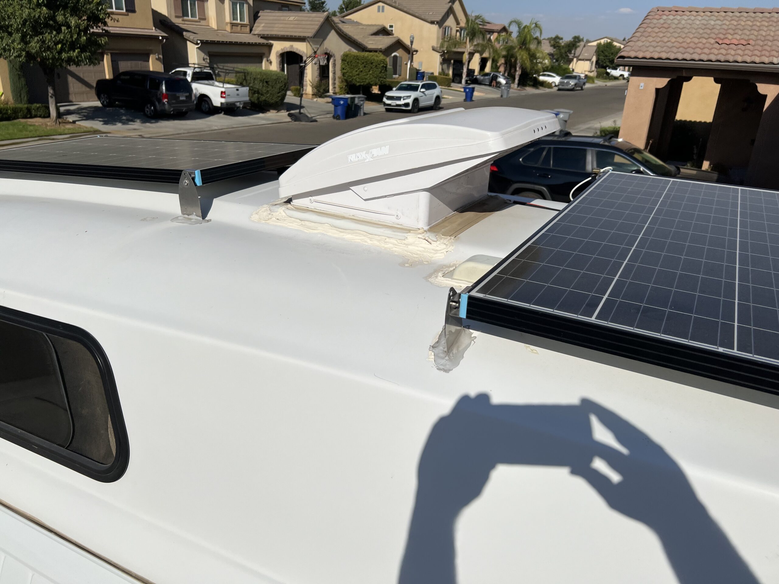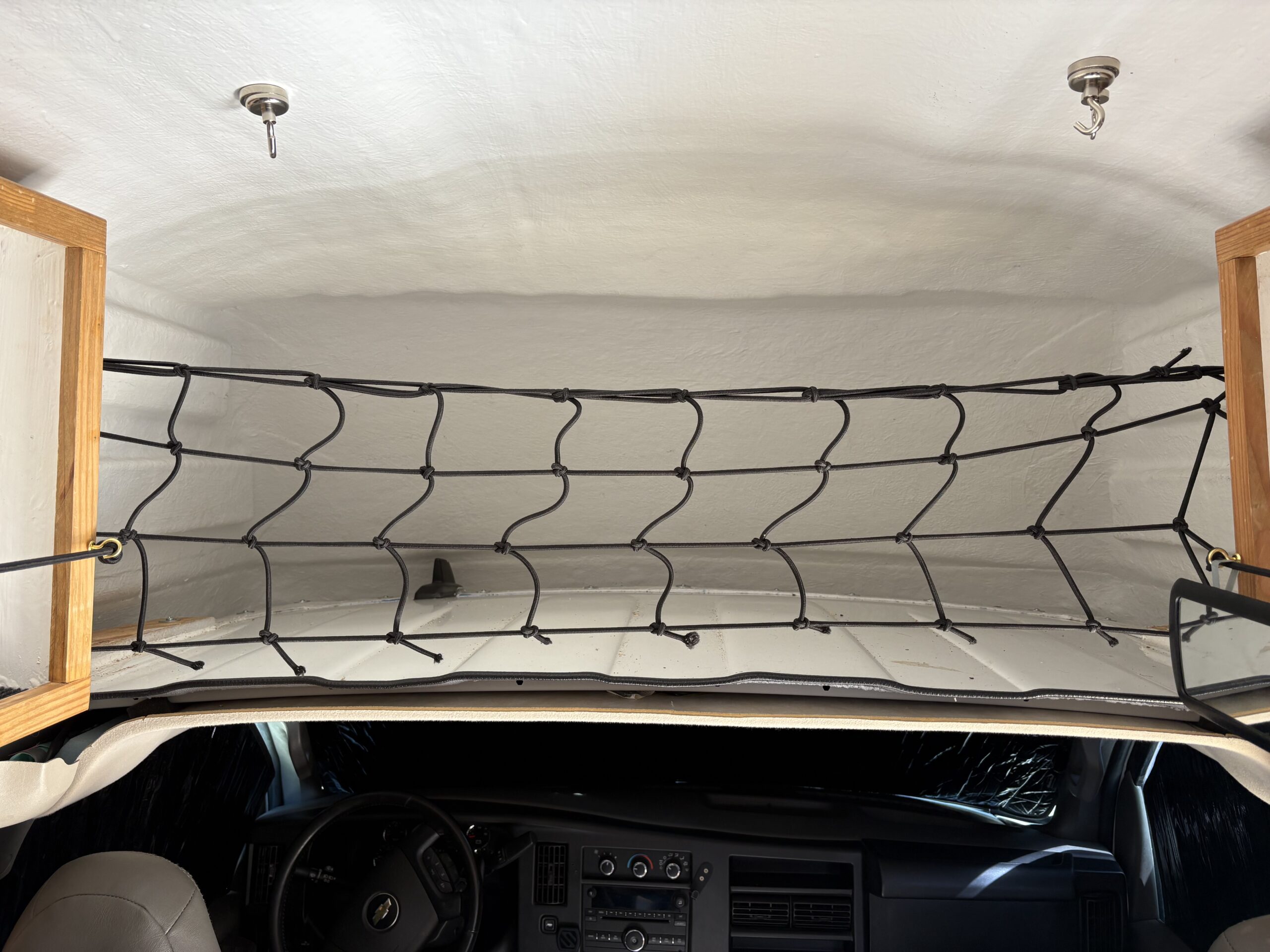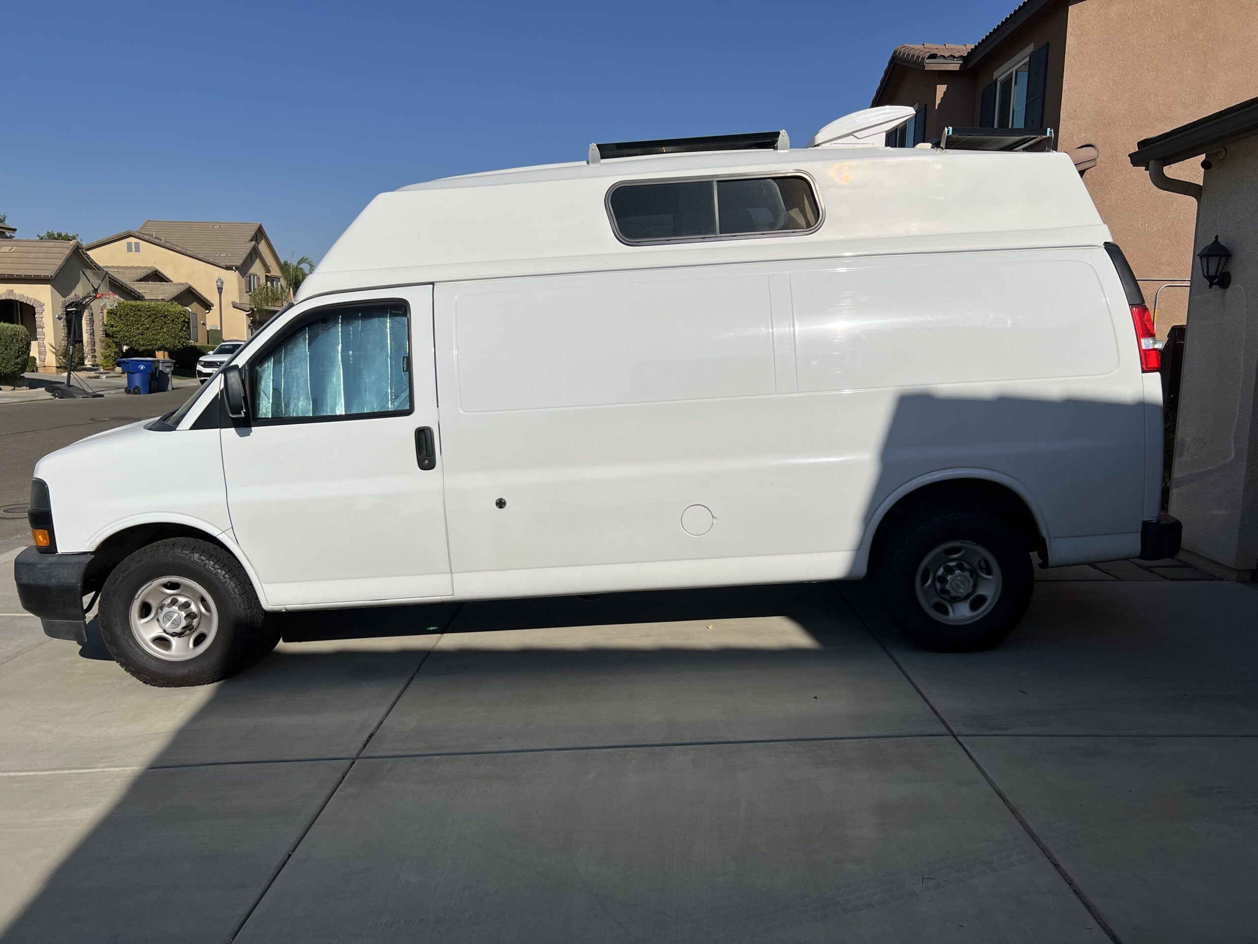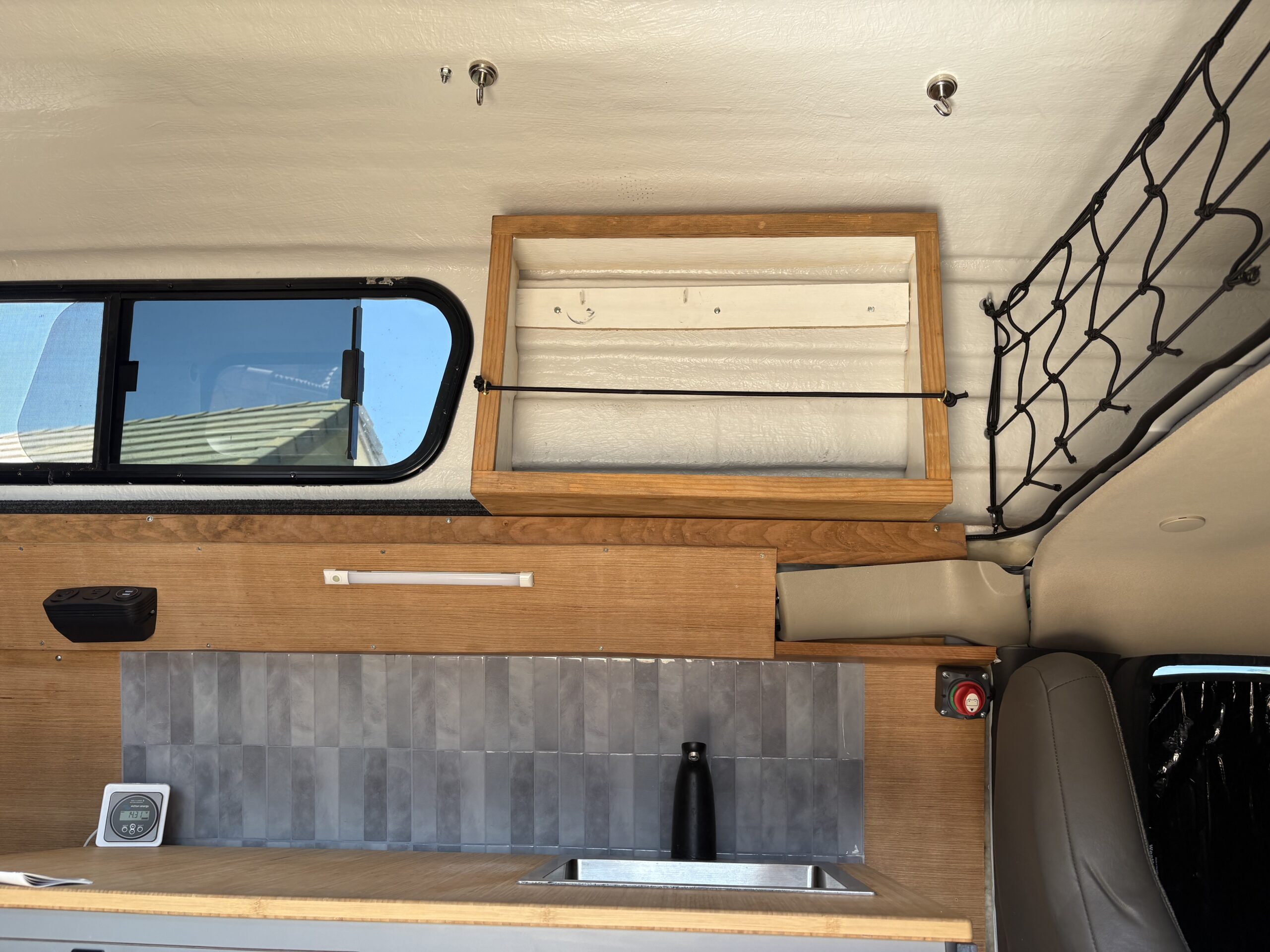 All interior work was professionally built with the exception of the ⅛” walls and the three upper cabinets. Incredible storage area above the front seats too. We drove to Fiberine in Los Angeles and had them add a 24” raised top with all the options for 8000.00. White Gel Coat Interior, Maxx Air Fan (dual directional fan), Extra reinforcements in fiberglass for sides and ceiling. Qty 2 12” x 44” Sliding windows with bug screens. These eye level windows are fantastic and not found on Promaster, Transits or Sprinter vans.