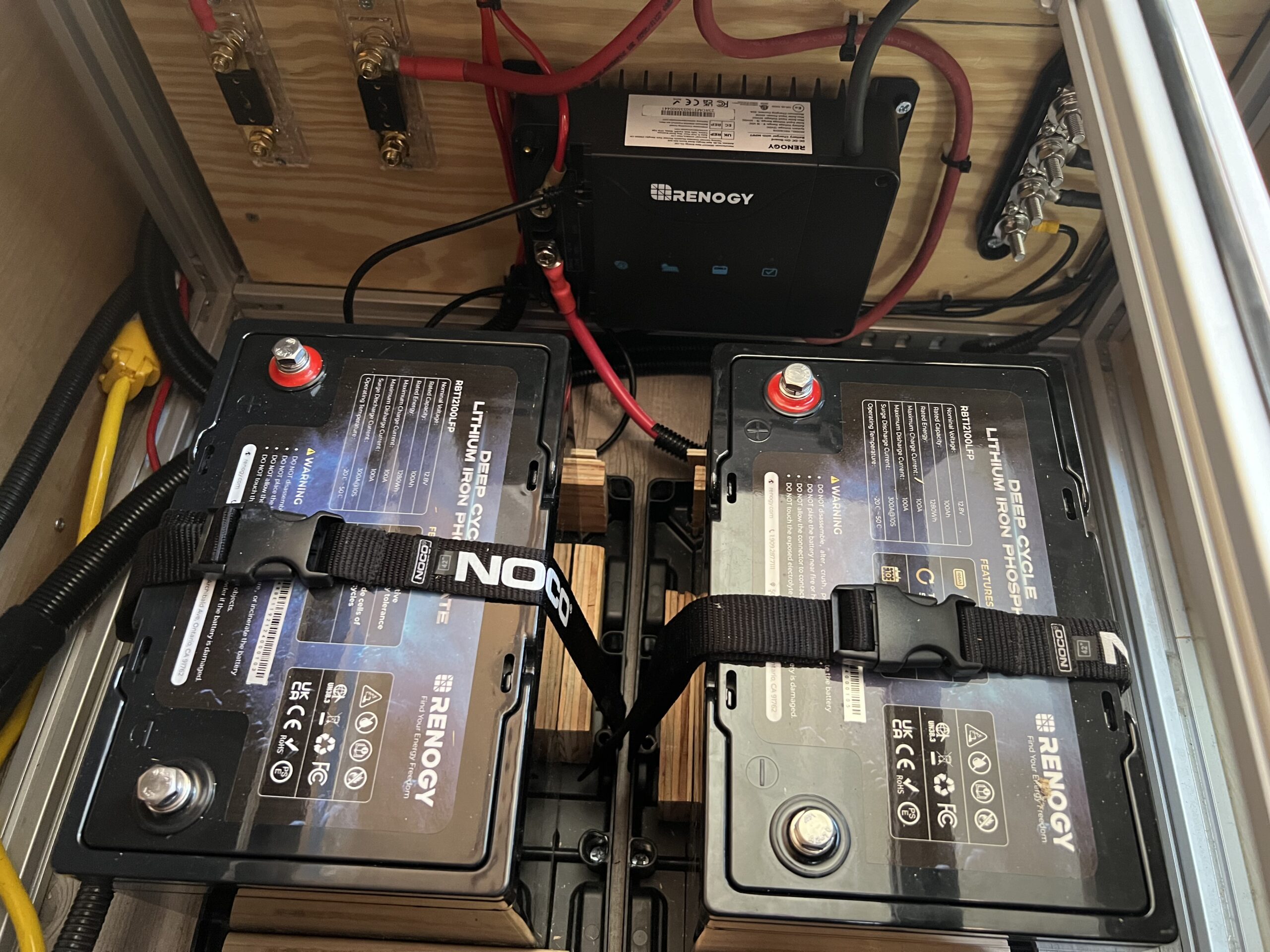 Renogy and Victron 12V Electrical System. Qty 2 100 watt Renogy Monocrystalline Rigid Solar Panels on roof, attached with stainless steel AM Solar brackets. Renogy 30 amp DC to DC Charger with MPPT. (charges house batteries while you drive and includes a solar charge controller) Qty 2 Renogy 100ah LiFePO4 Lithium Batteries. Added a Victron Smart Shunt with Bluetooth for (Victron App) monitoring 12V power in the van. Please note we do not have an Inverter. Everything runs off 12V DC which provides efficient use of power. We often carry a Portable Power Station by Bluetti for when we might need 110V to power a device. There is a panel with USB-C, USB-A and a Cigarette plug for charging devices too.