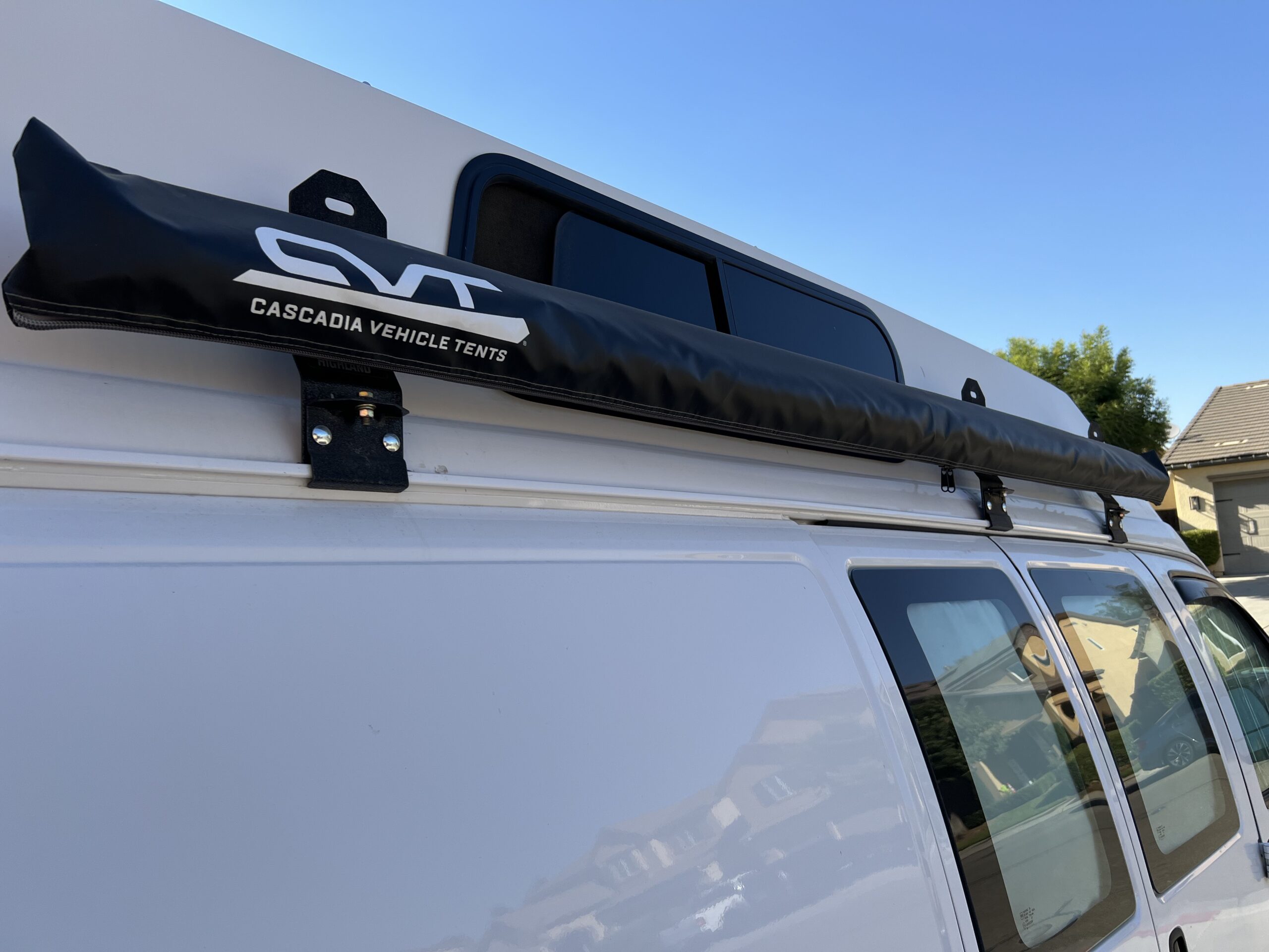 CVT Cascadia Van Tents 8’ Awning Driver and Passenger Swivel Seats Installed Shore power connection to a power strip near kitchen galley.