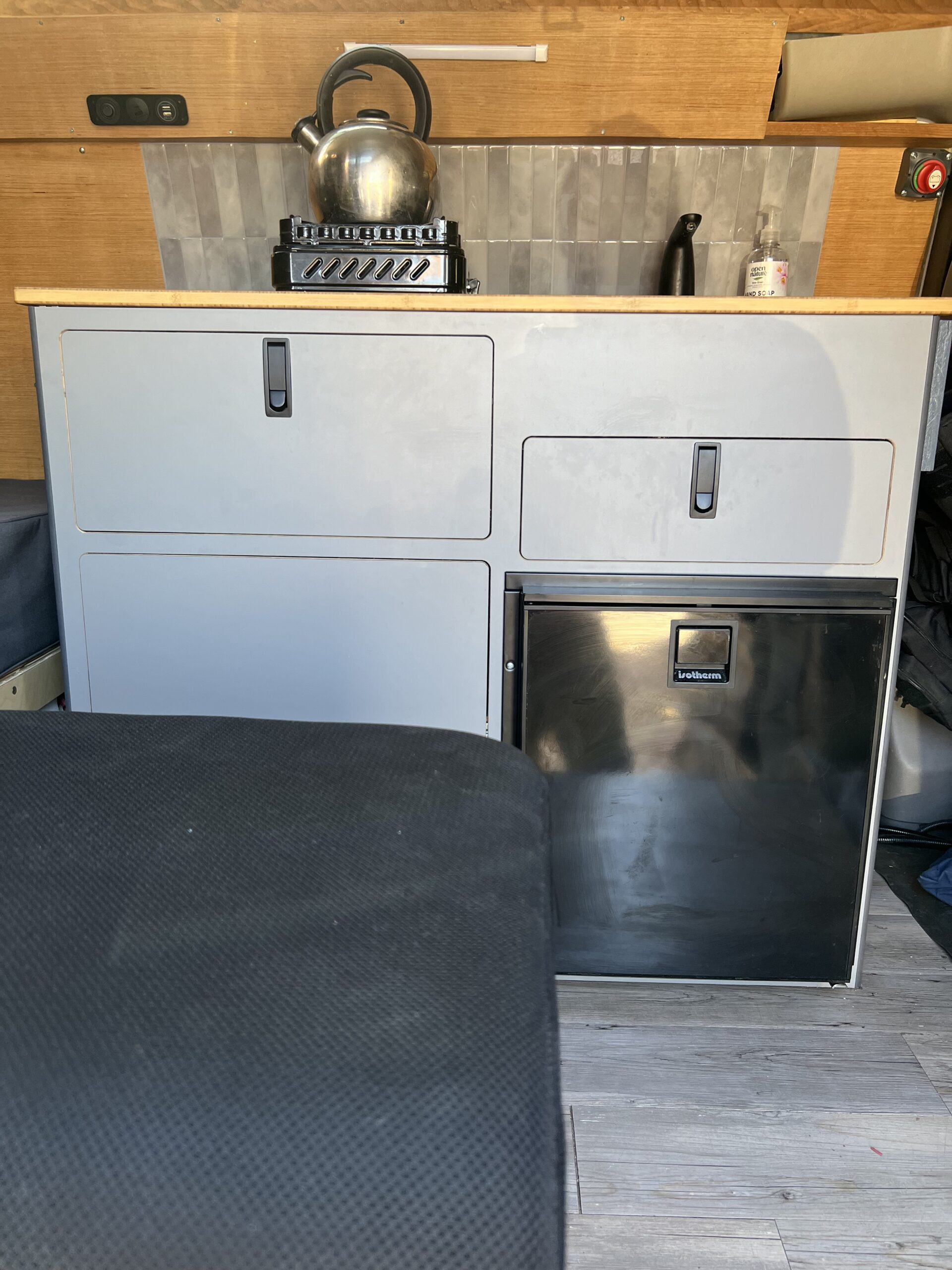 The following upgrades were completed in 2024: Purchased a Kitchen Adventure Van Voyager Galley from Skyliner Gear with both cabinet doors and a large deep drawer. Stainless Steel Sink and a USB Kitchen Faucet. Two “portable” water tanks underneath both for fresh and gray water. An Isotherm Cruise Elegance 65 12volt compressor fridge and freezer. This fridge is one year old. Also to supplement cooling of the compressor in 100+ degree weather, an additional 12v fan was added with an on/off switch.
