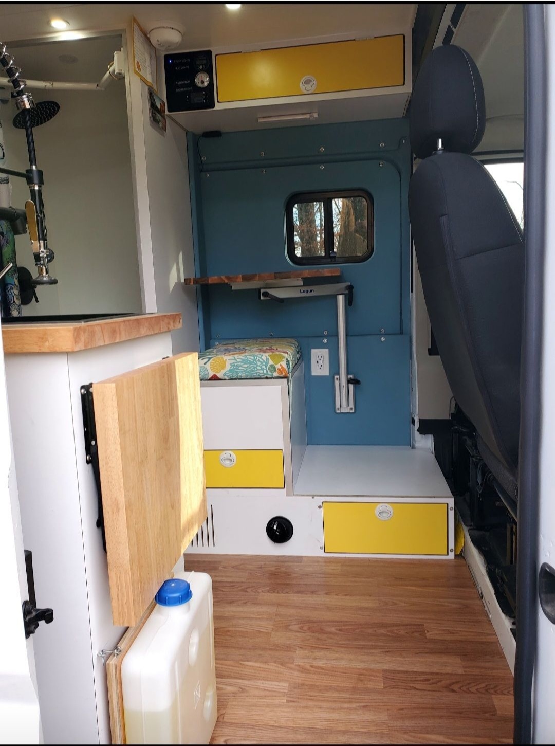 – Swivel front seats + butcher block swivel desk (for work or meals with a view)