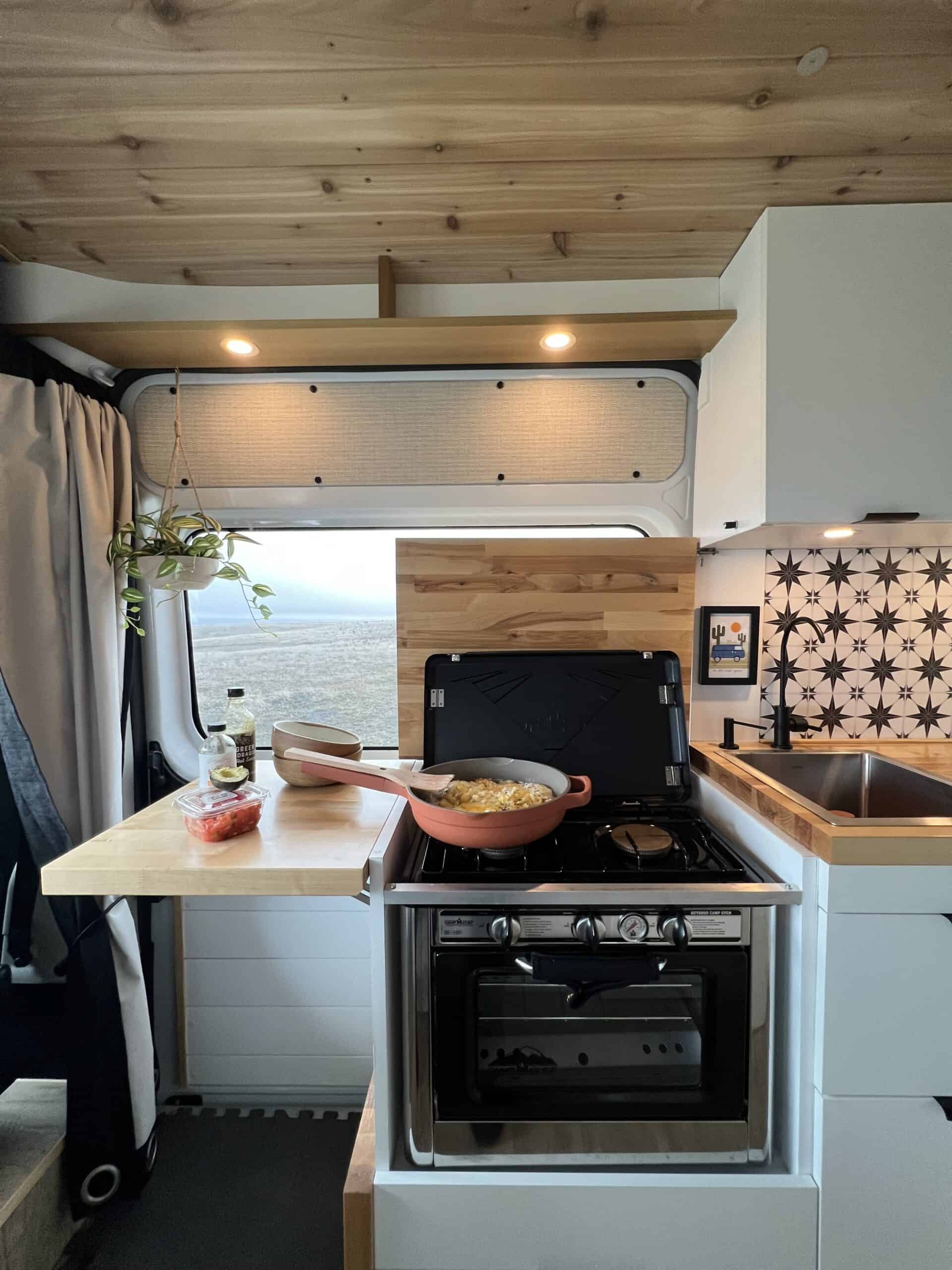• Built-in propane stove + oven (fits 9×13 pan)