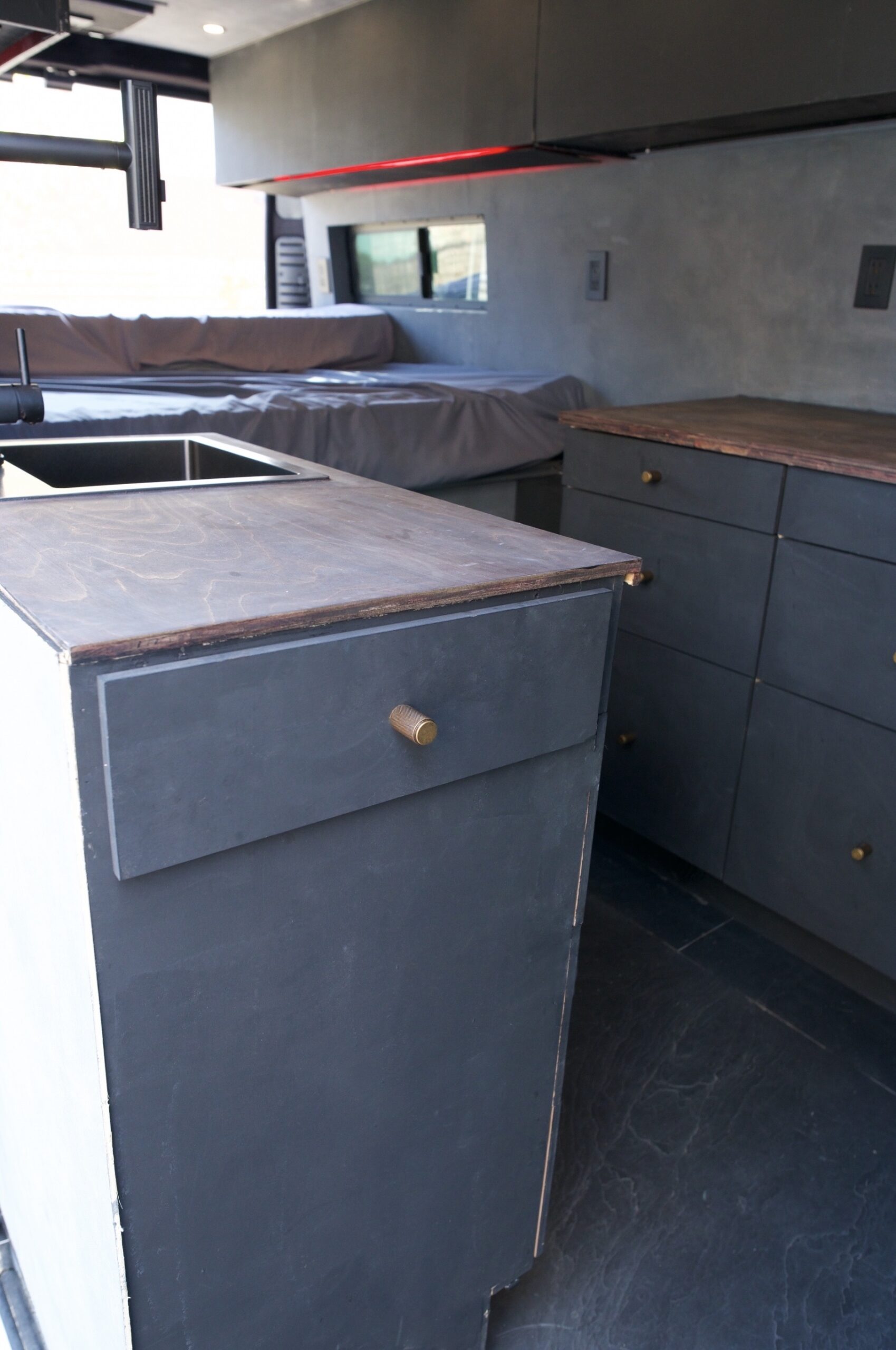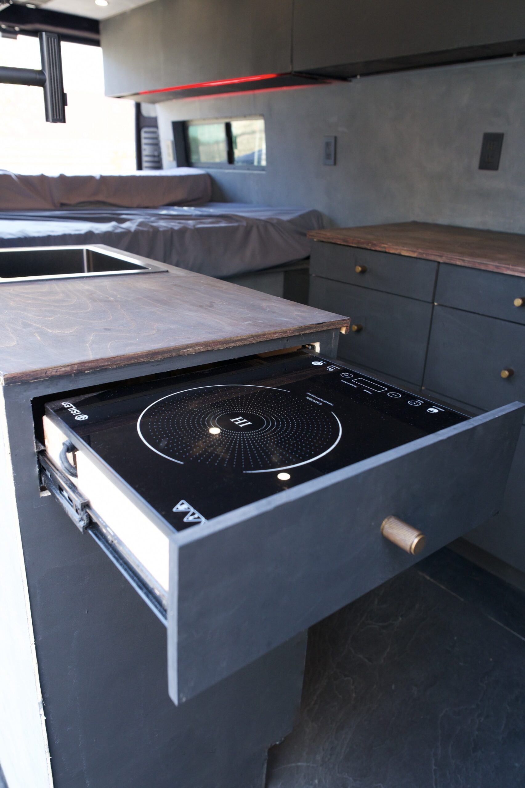 Passenger side kitchen galley with kitchen faucet/sink, and pull out cooktop, three drawers, and a cabinet for extra storage.