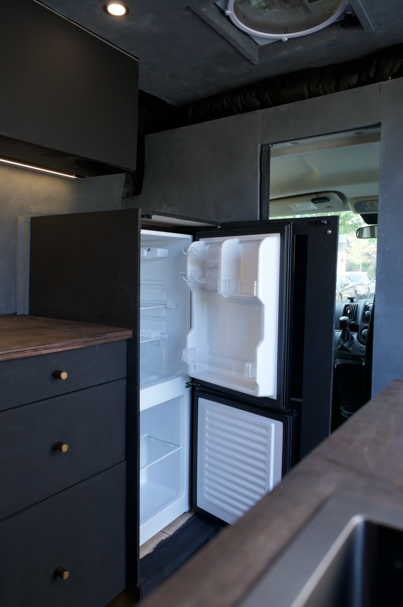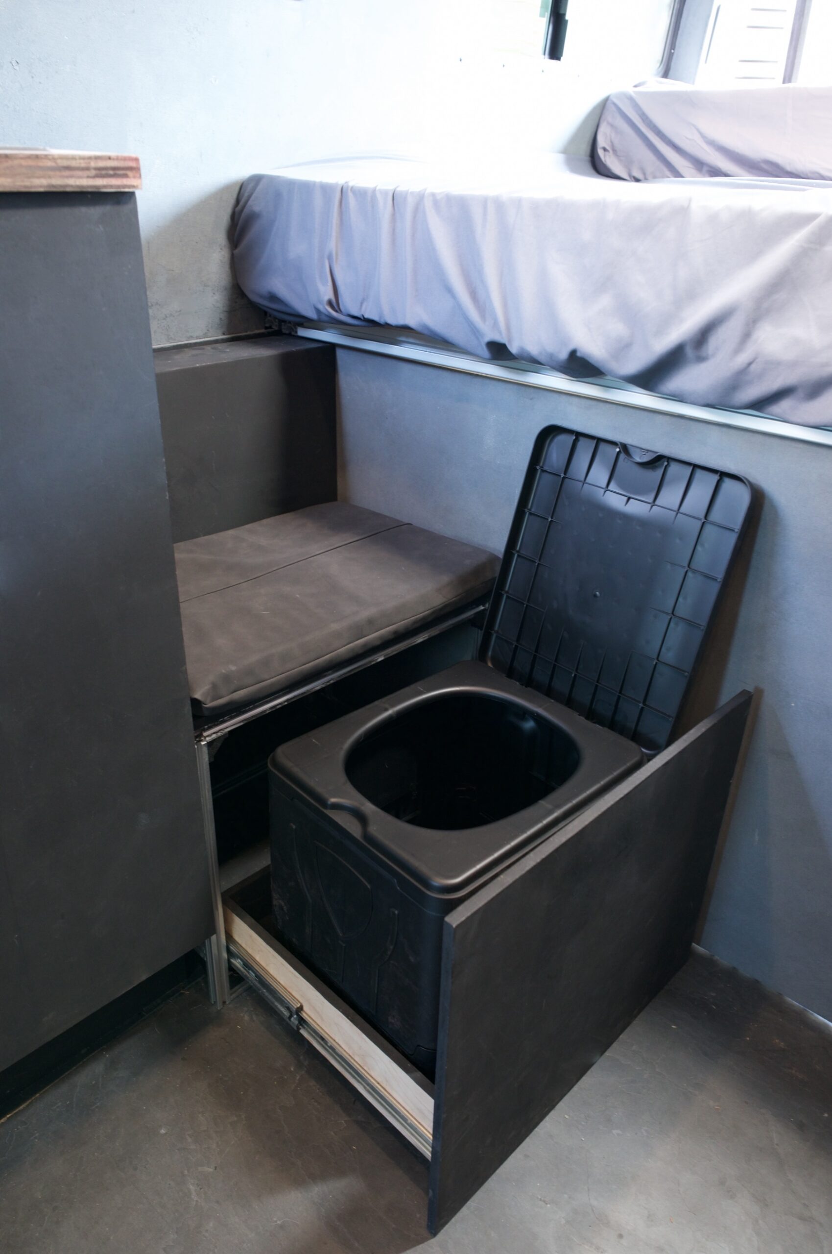 Partially fixed KING SIZE BED. The bed frame is extruded aluminum and is fixed to the frame of the van making it insanely strong. There is a twenty inch extension piece that slides out over the benches to make it a true king sized mattress. This can easily be tucked away when not in use to expand the living area.