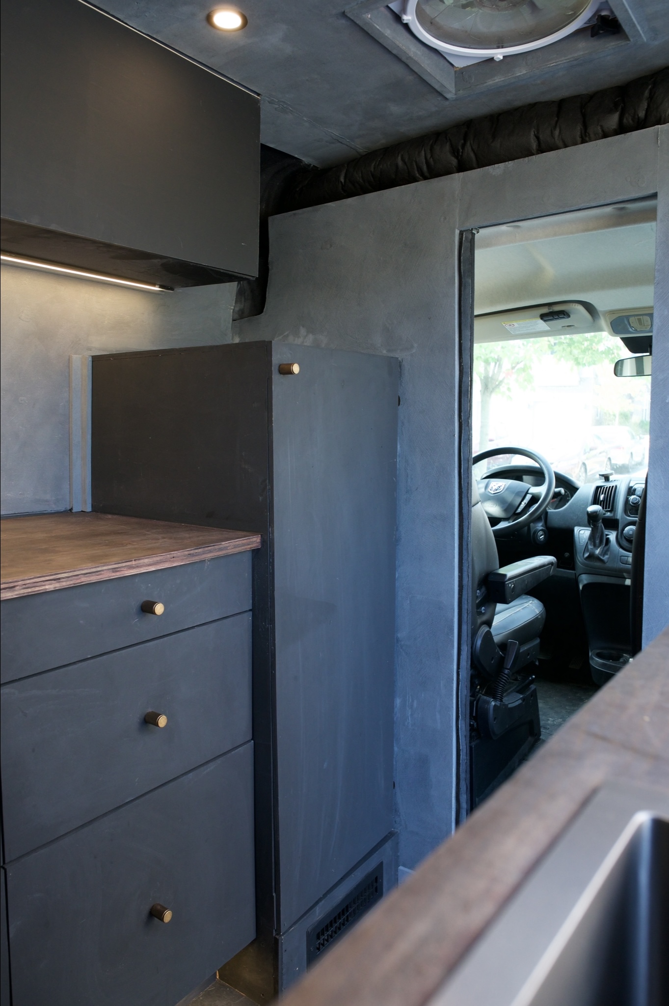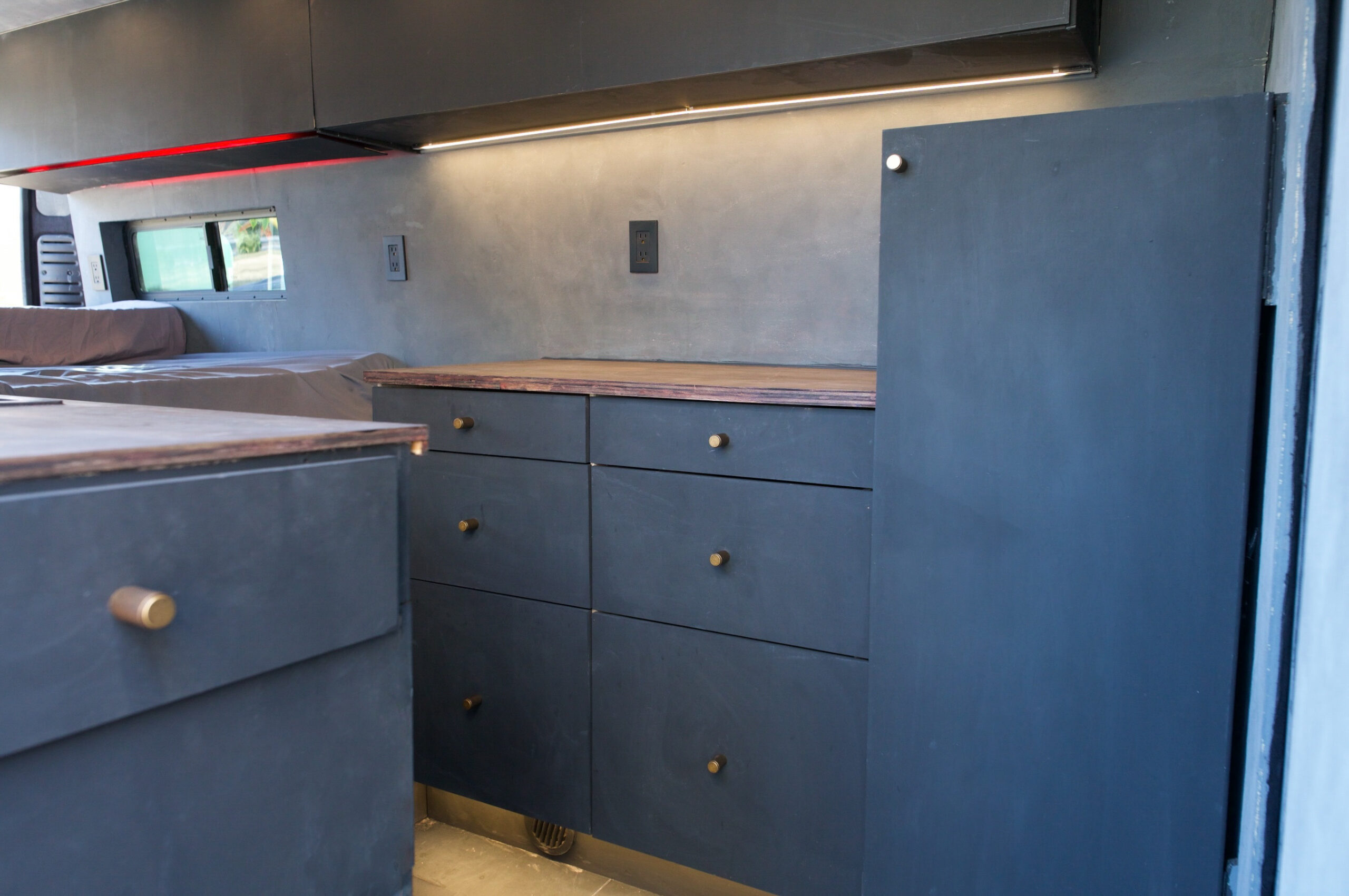 Driver side kitchen galley with large countertop and six drawers.