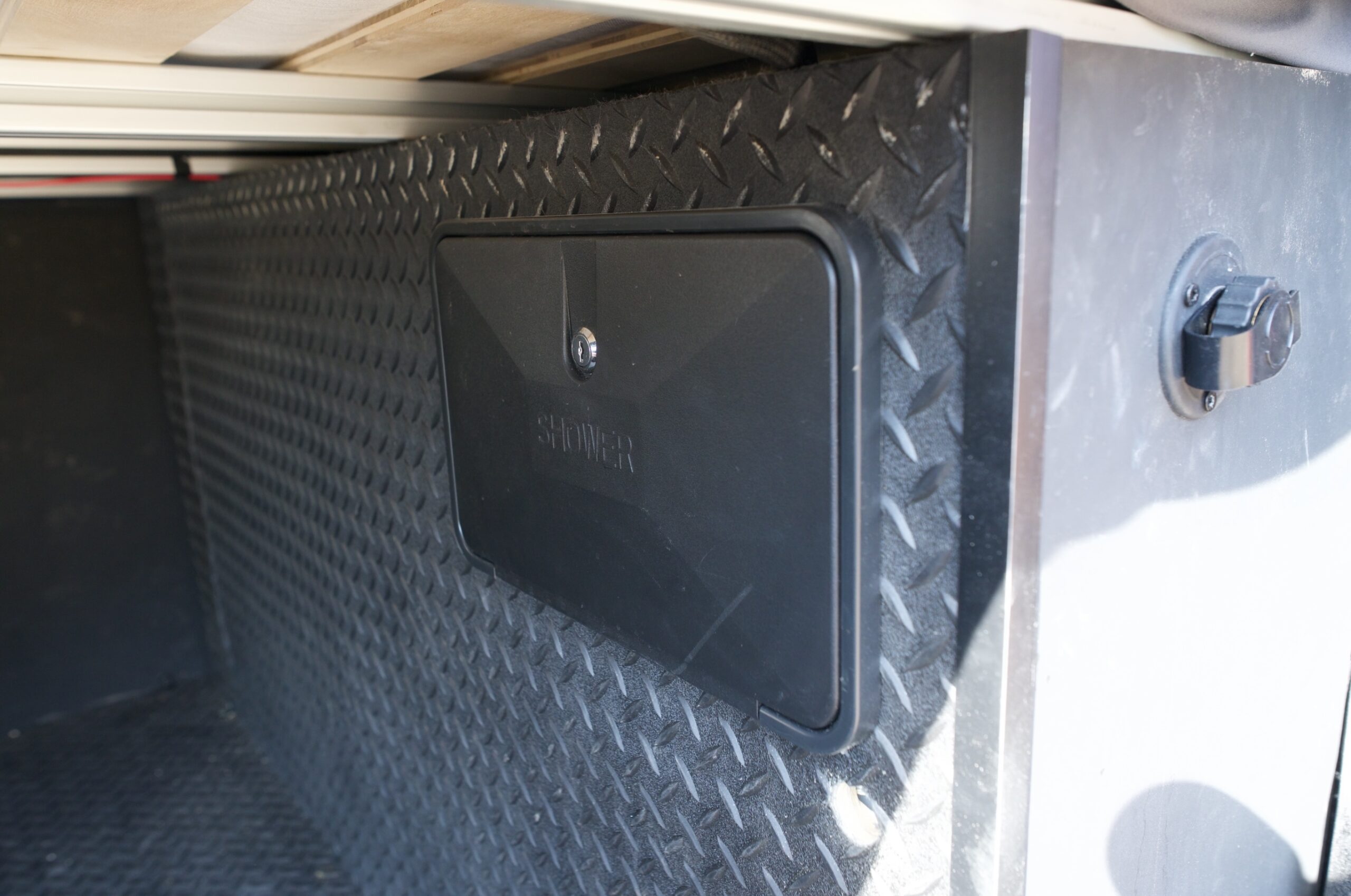 Compact shower mounted in the garage area for taking outdoor showers
