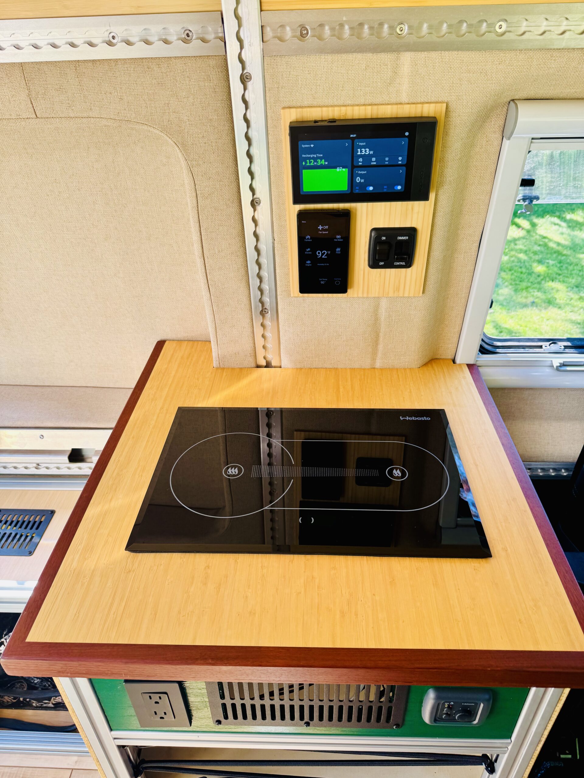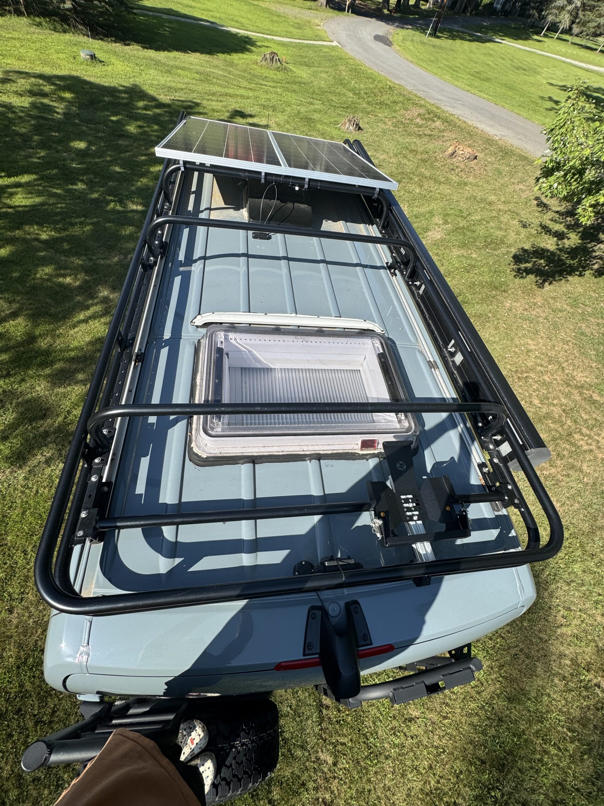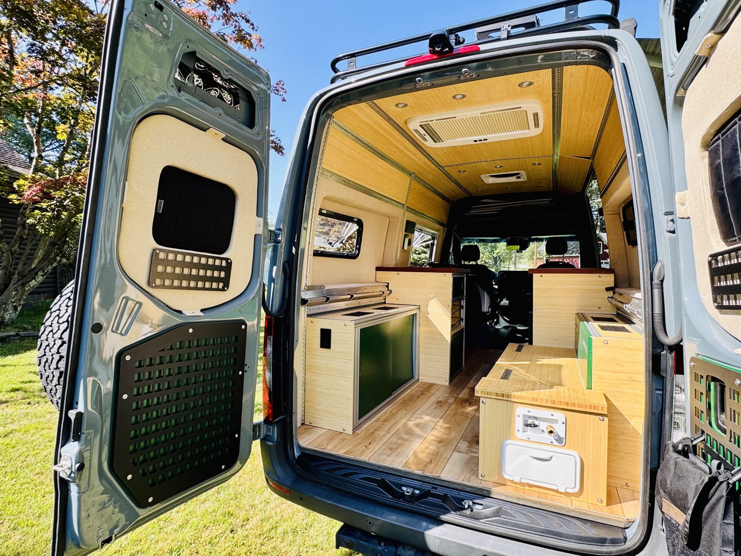 By substituting high demand electrical components used for cabin heating, water heating and cooking with a diesel source coupled with an expanded 47 gallon diesel, off grid adventures can last for weeks on the 10,000 Watt hour battery bank with 400watts of solar power and a 60A DC to DC charger. In addition it reduces the number of energy sources - no propane tanks or gasoline for generator needed. The highly robust and efficient Rixen Enterprises MCS-7 system provides heated cabin air, radiant floor heating and instant hot water. The portable EcoFlow Wave 2 with extra battery provides plenty of cooling power and can be removed when not needed. Instead of looking at an ugly, permanently installed roof top mounted air conditioner that you must look at throughout the year, I elected to use EcoFlow’s portable AC unit that can be removed during colder months, and I installed an Arctic Tern Roof Hatch where a roof top AC unit is usually installed to allow for stargazing in bed.