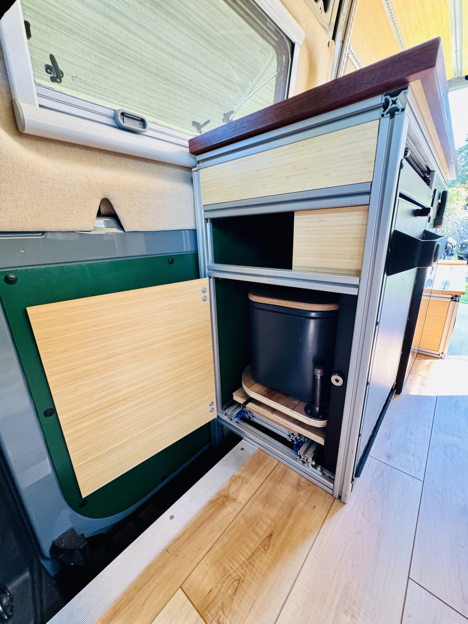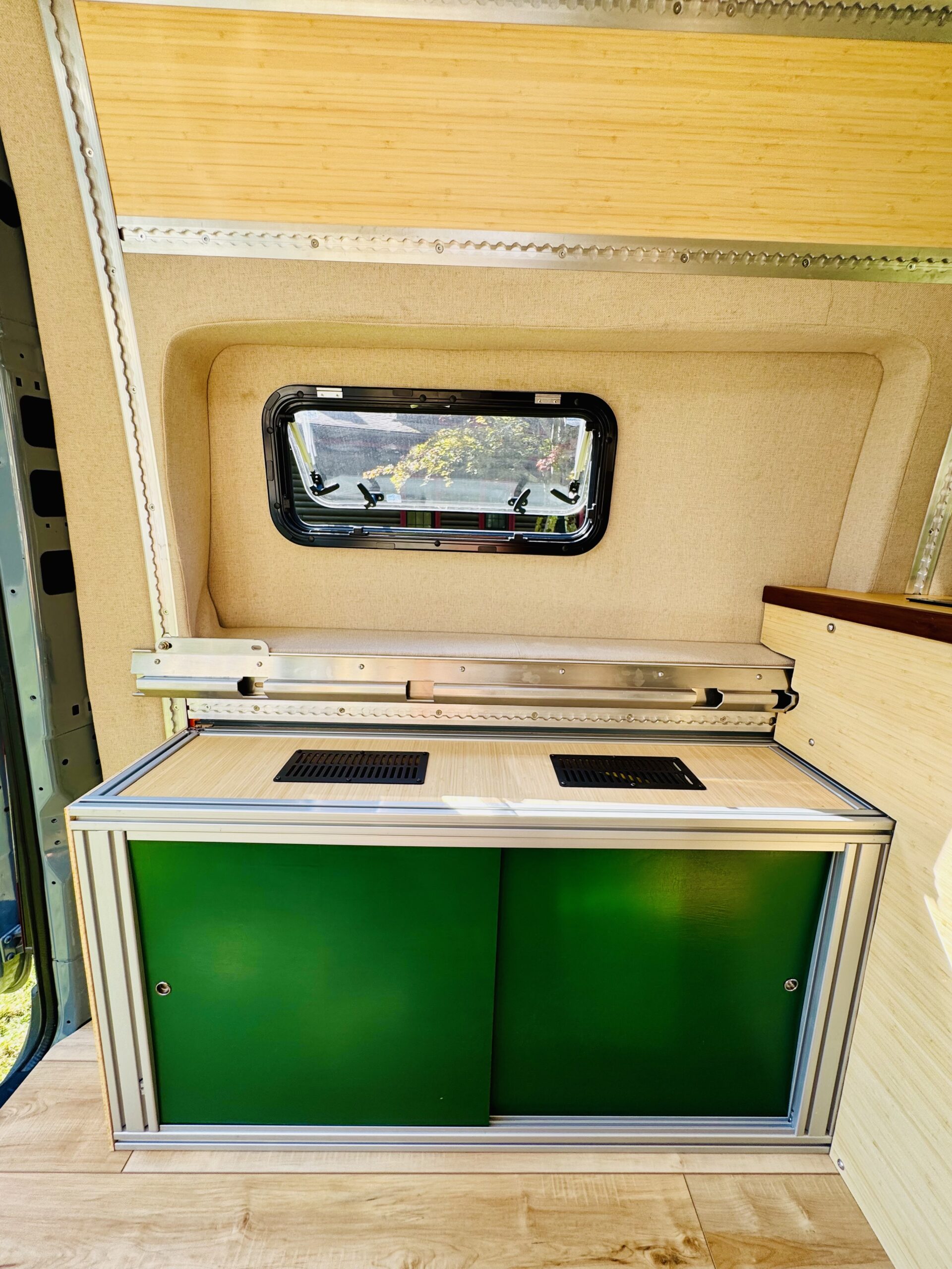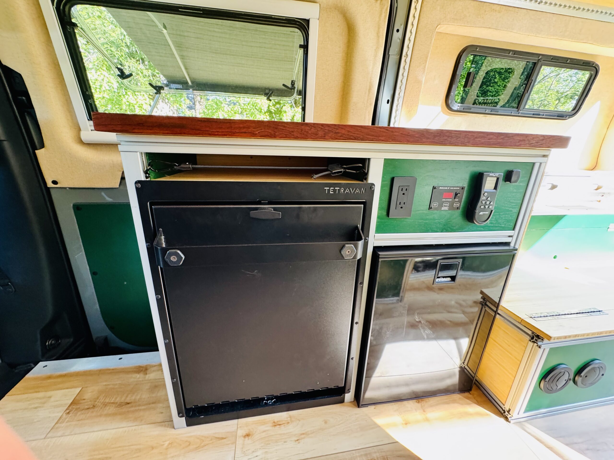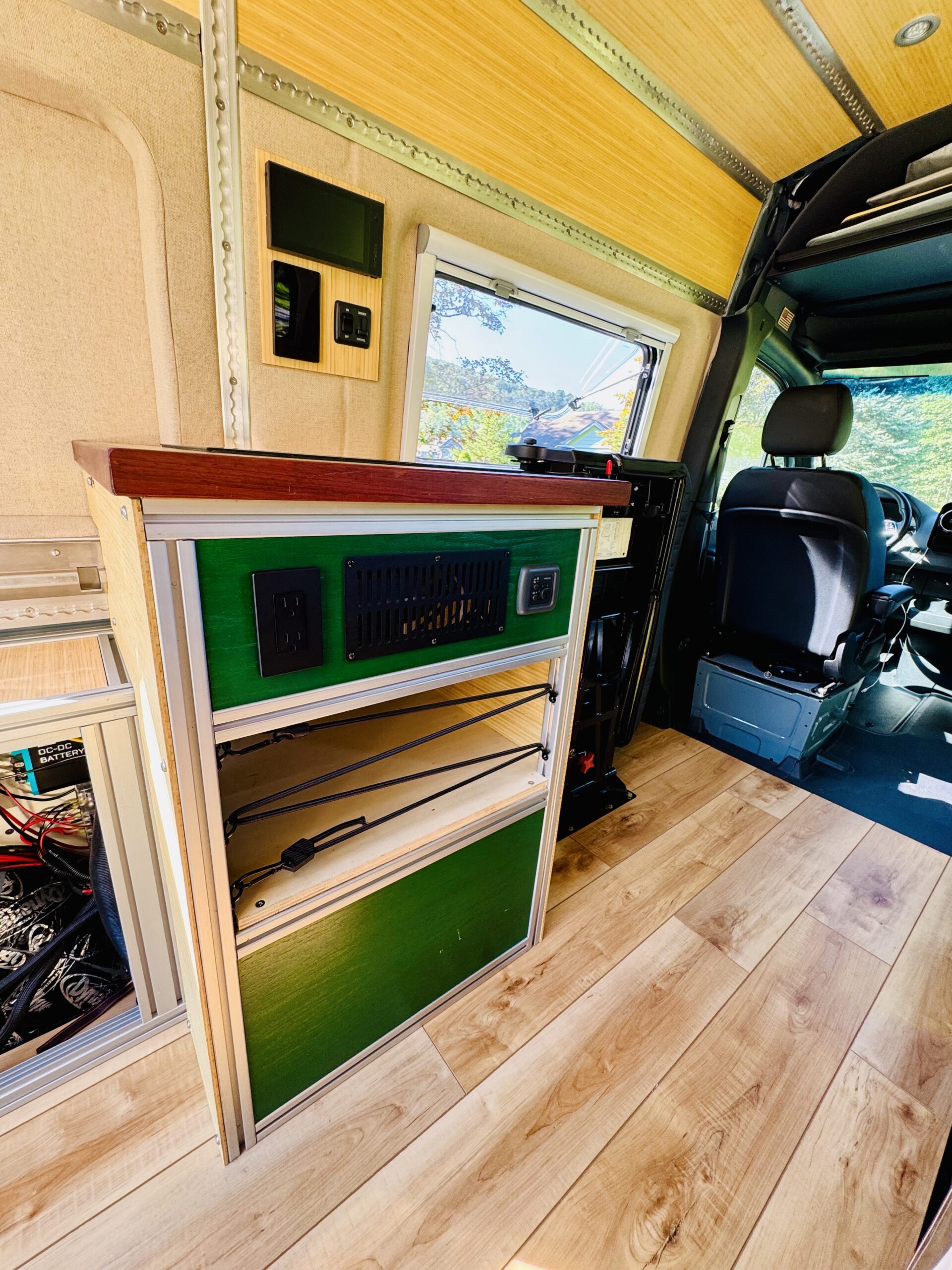 The interior construction includes lightweight 1/4 plywood paneling, plenty of L-Track and 8020 extruded aluminum framing. Walls and ceilings are insulated with 3M Thinsulate and reflectix. The floors are insulated with 1.5” Coosa Composite board Bluewater 26, which is normally used for high end marine applications. I also hand routed channels to accommodate a PEX tubing for a radiant heated floor.