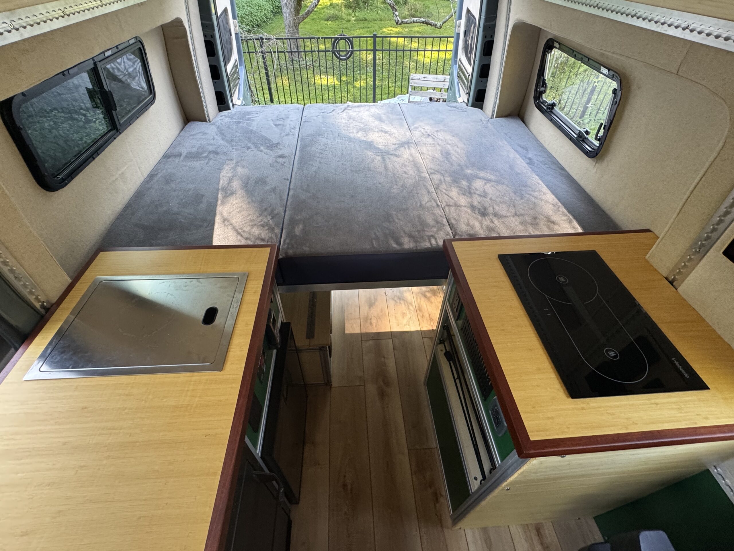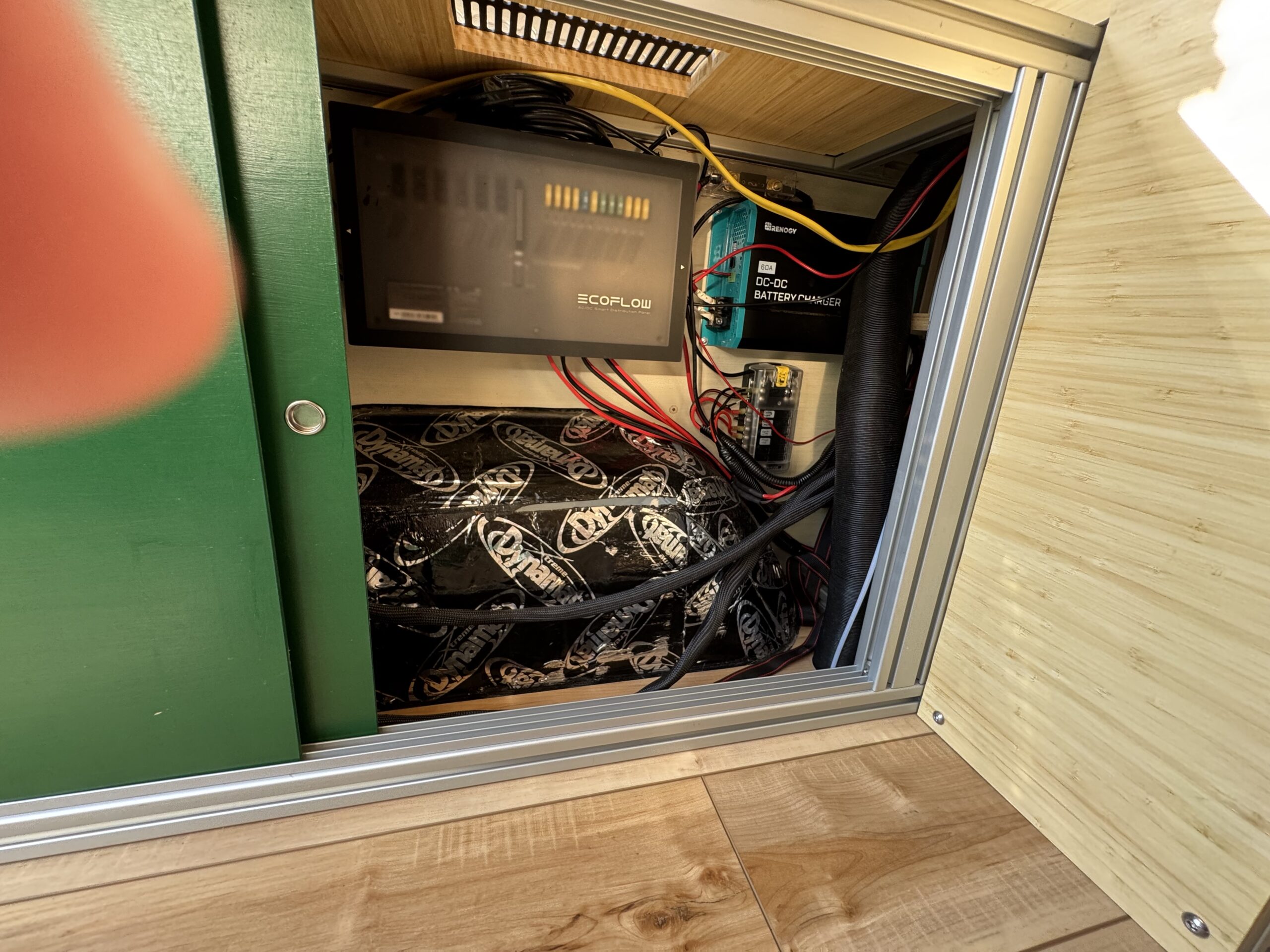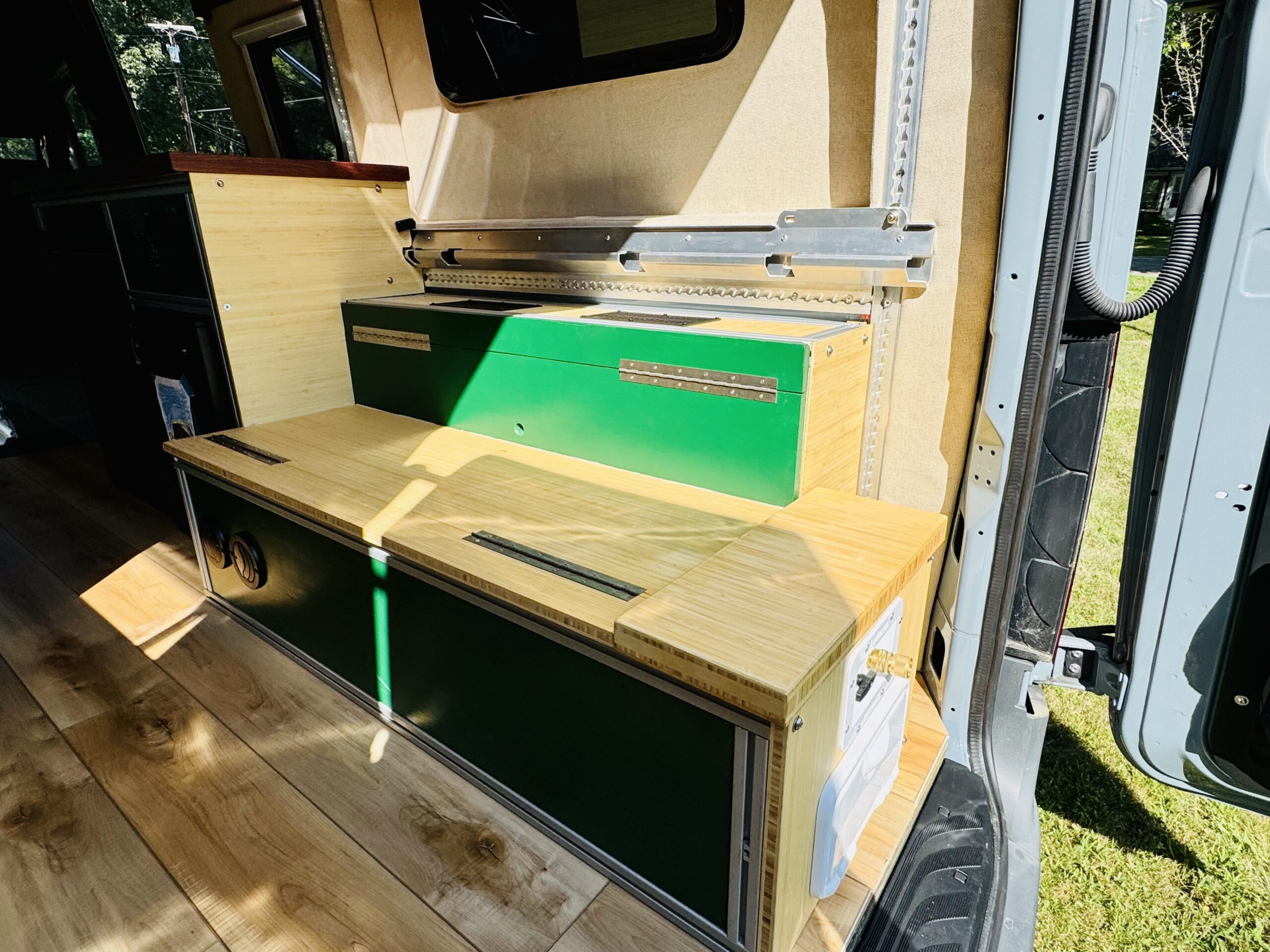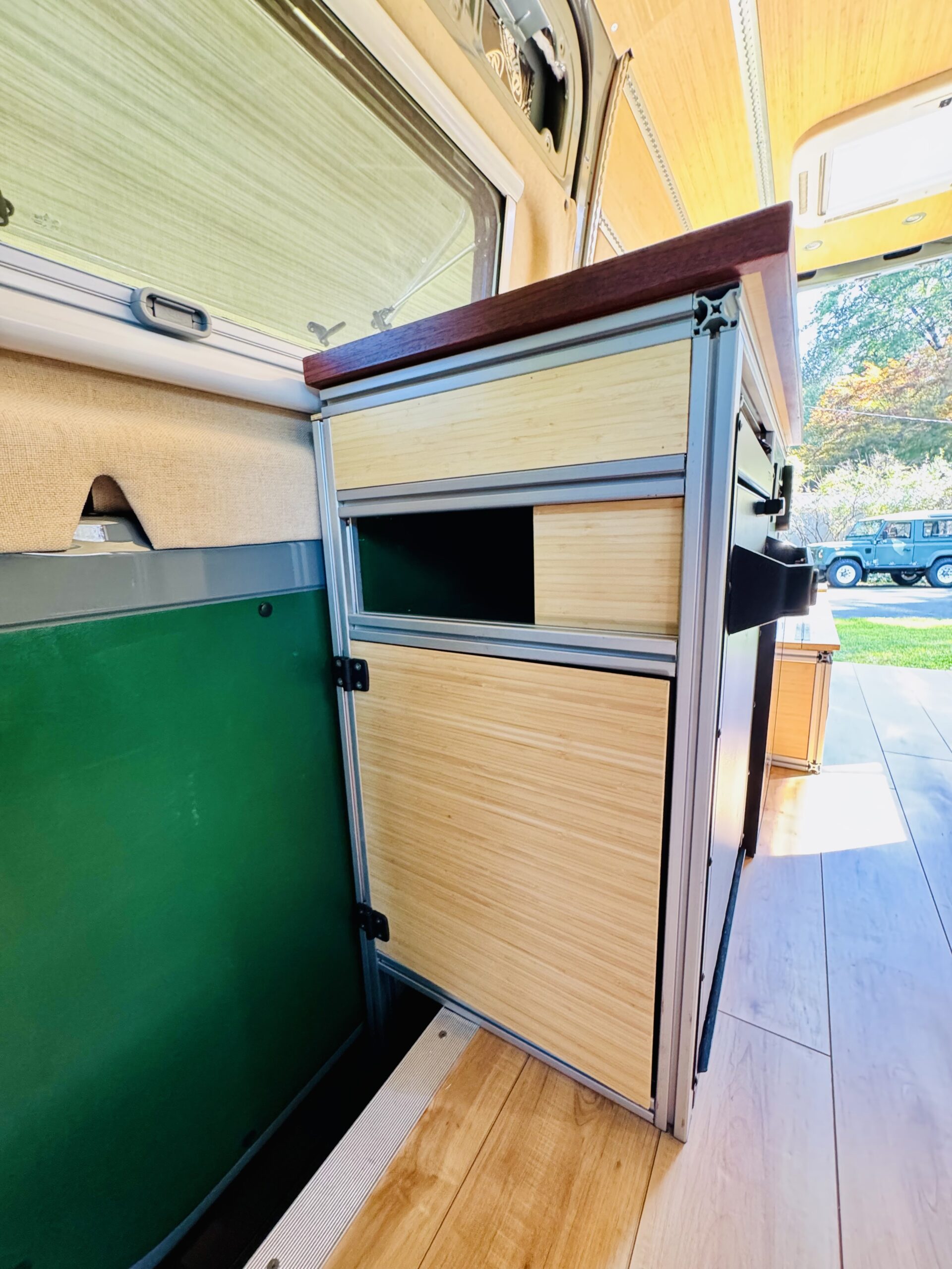 The interior construction includes lightweight 1/4 plywood paneling, plenty of L-Track and 8020 extruded aluminum framing. Walls and ceilings are insulated with 3M Thinsulate and reflectix. The floors are insulated with 1.5” Coosa Composite board Bluewater 26, which is normally used for high end marine applications. I also hand routed channels to accommodate a PEX tubing for a radiant heated floor.
