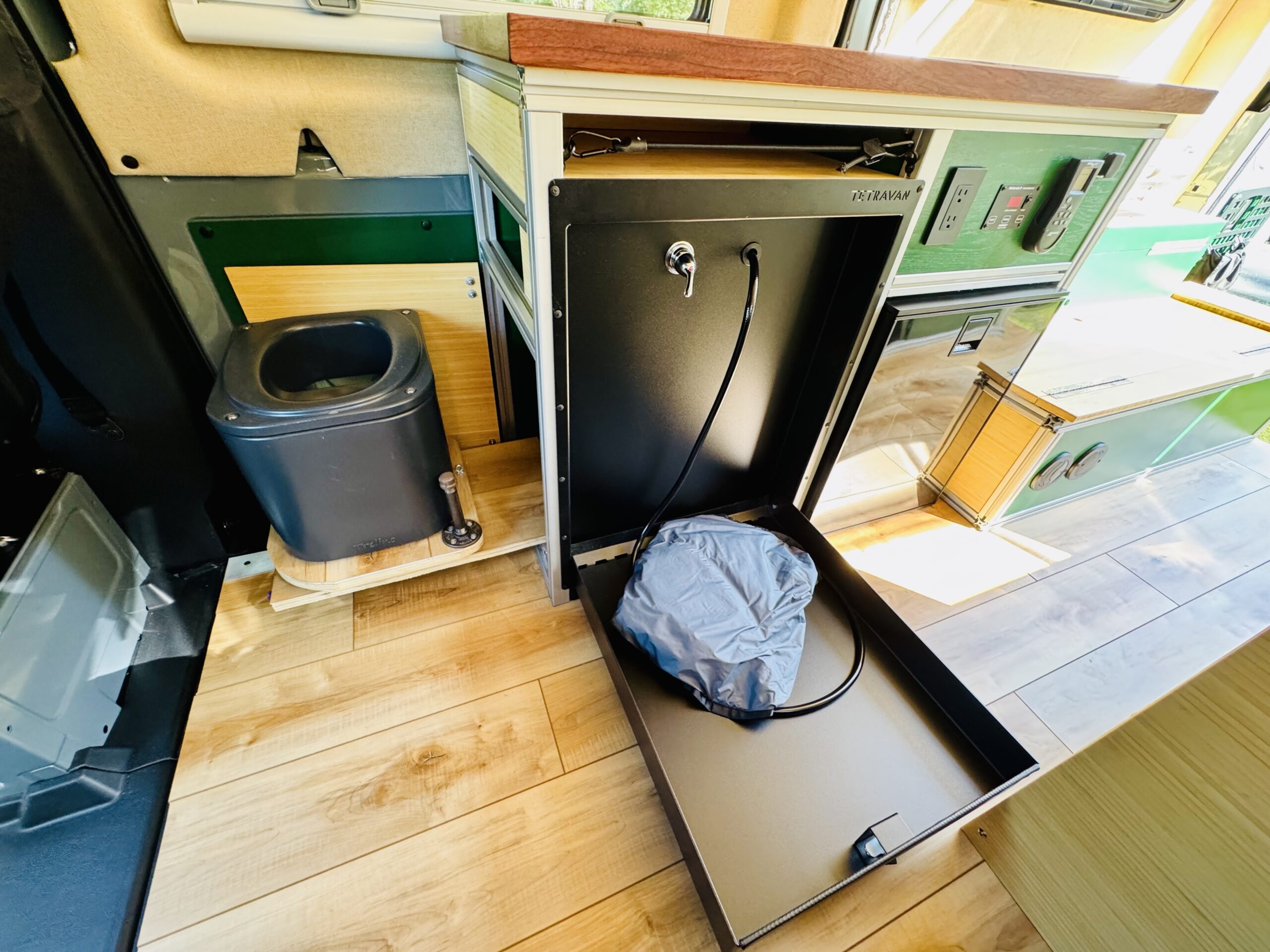 Tetravan interior shower with 360 shower curtain