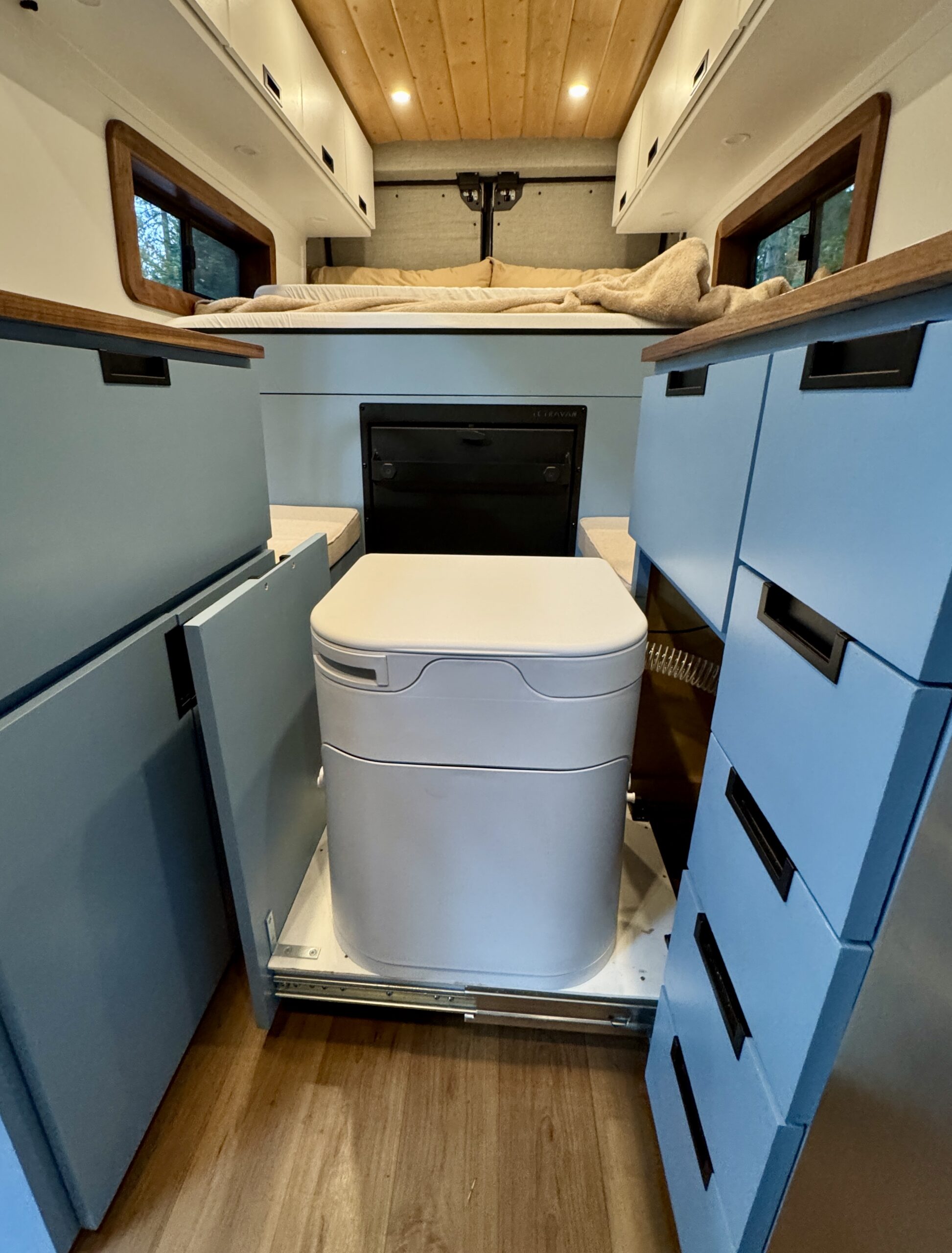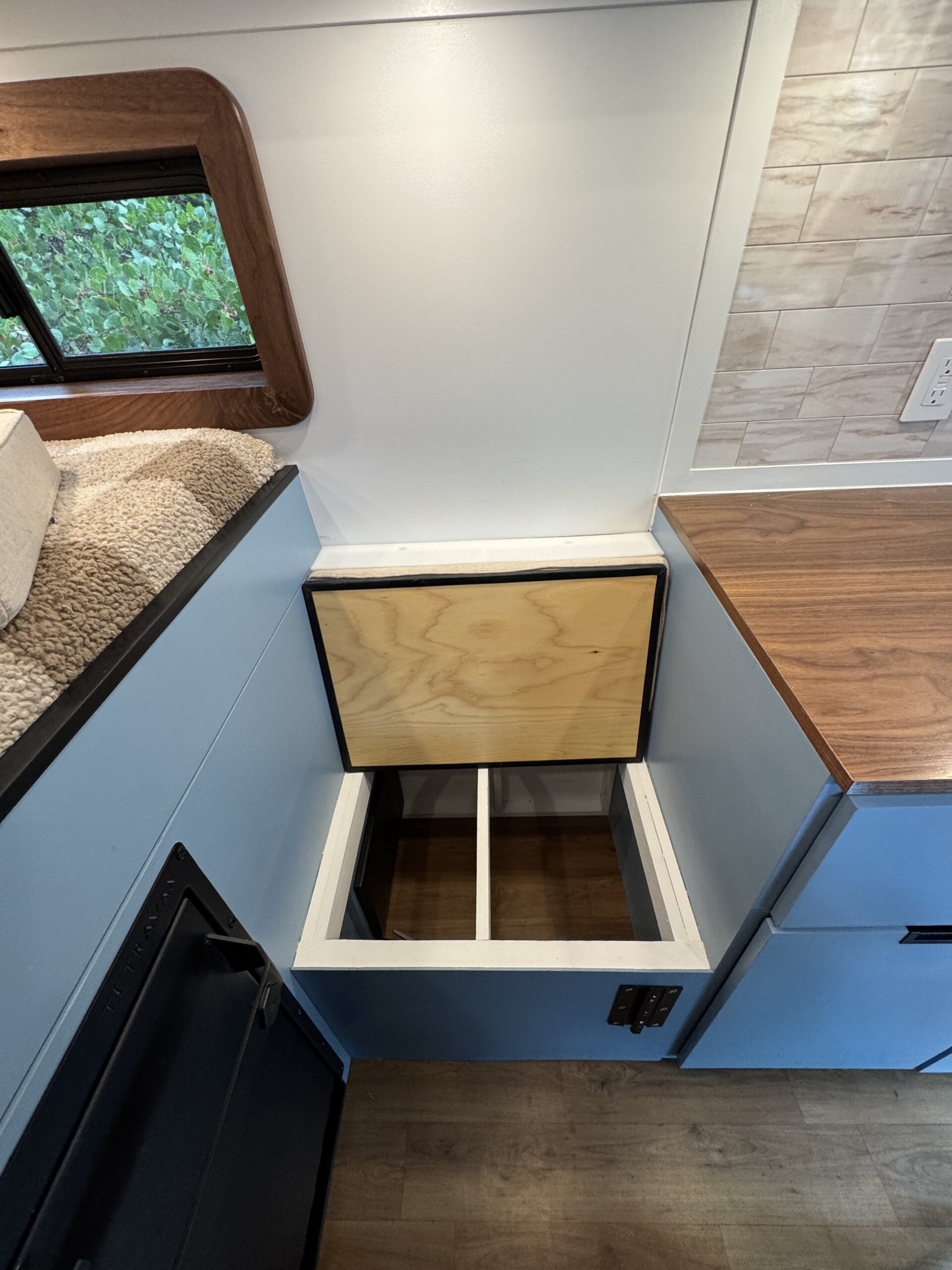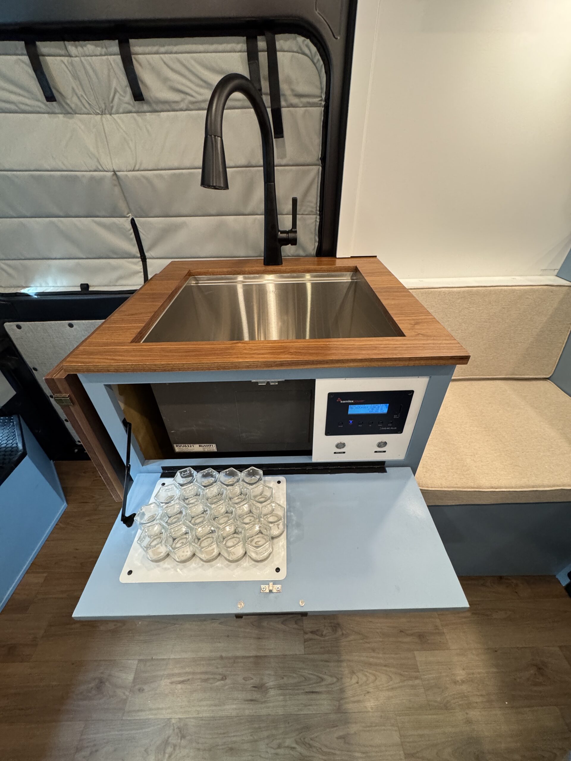 26-gallon recessed undermount grey water tank, with electric dump valve (custom from van life outfitters)
