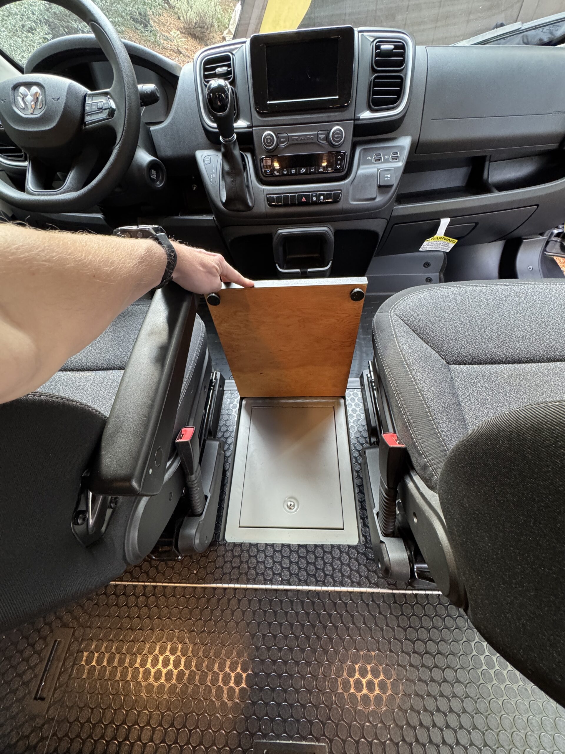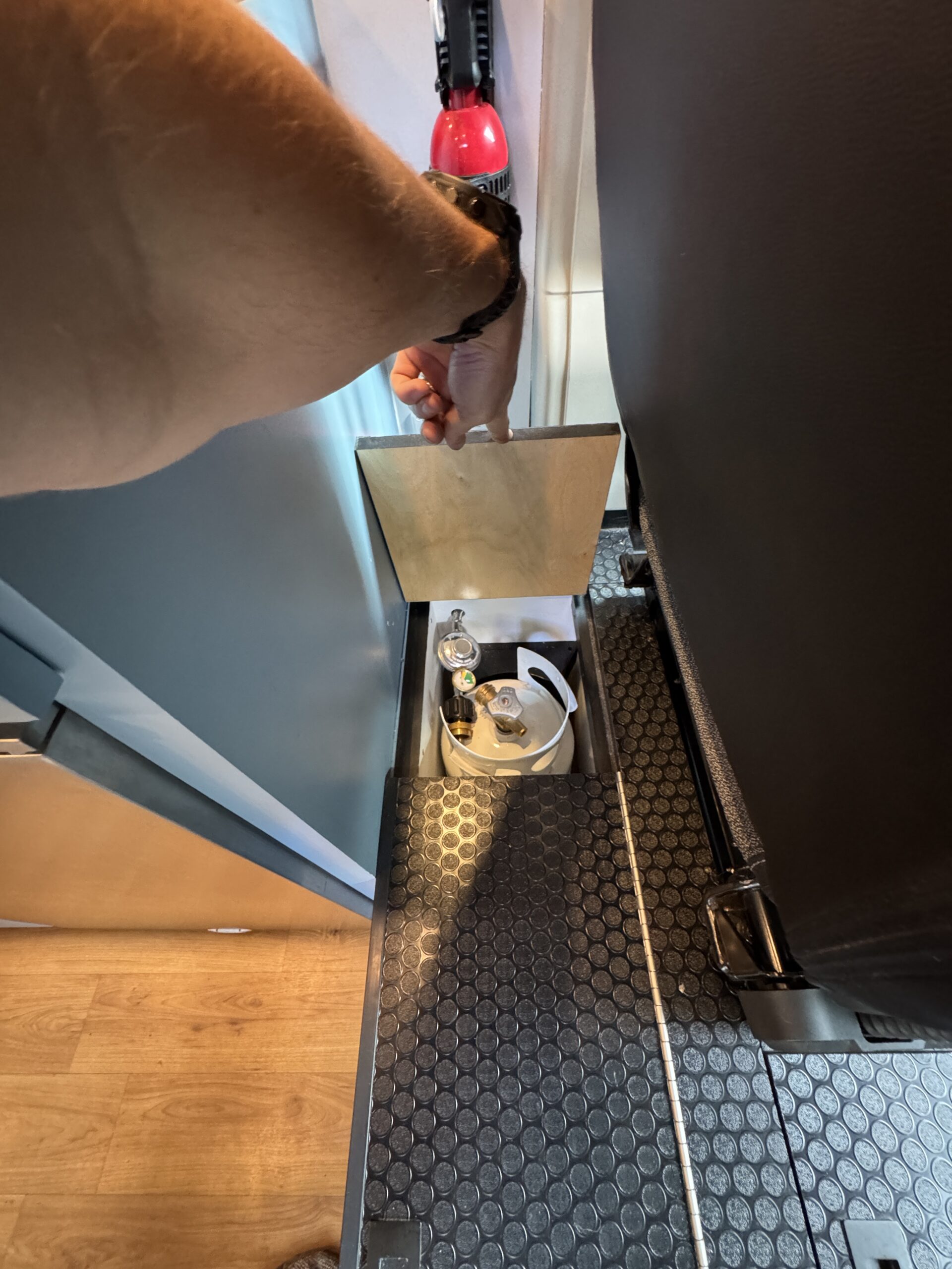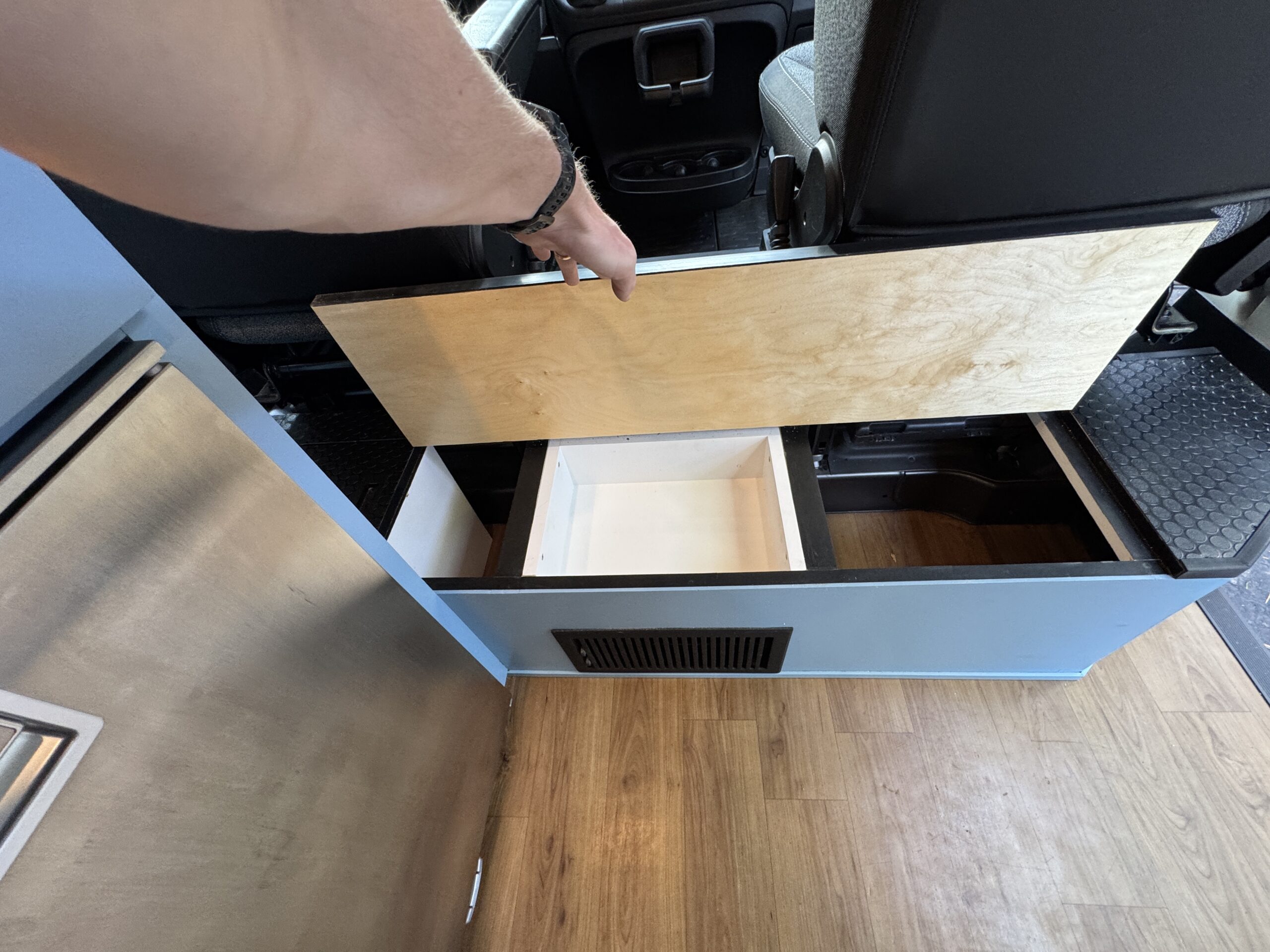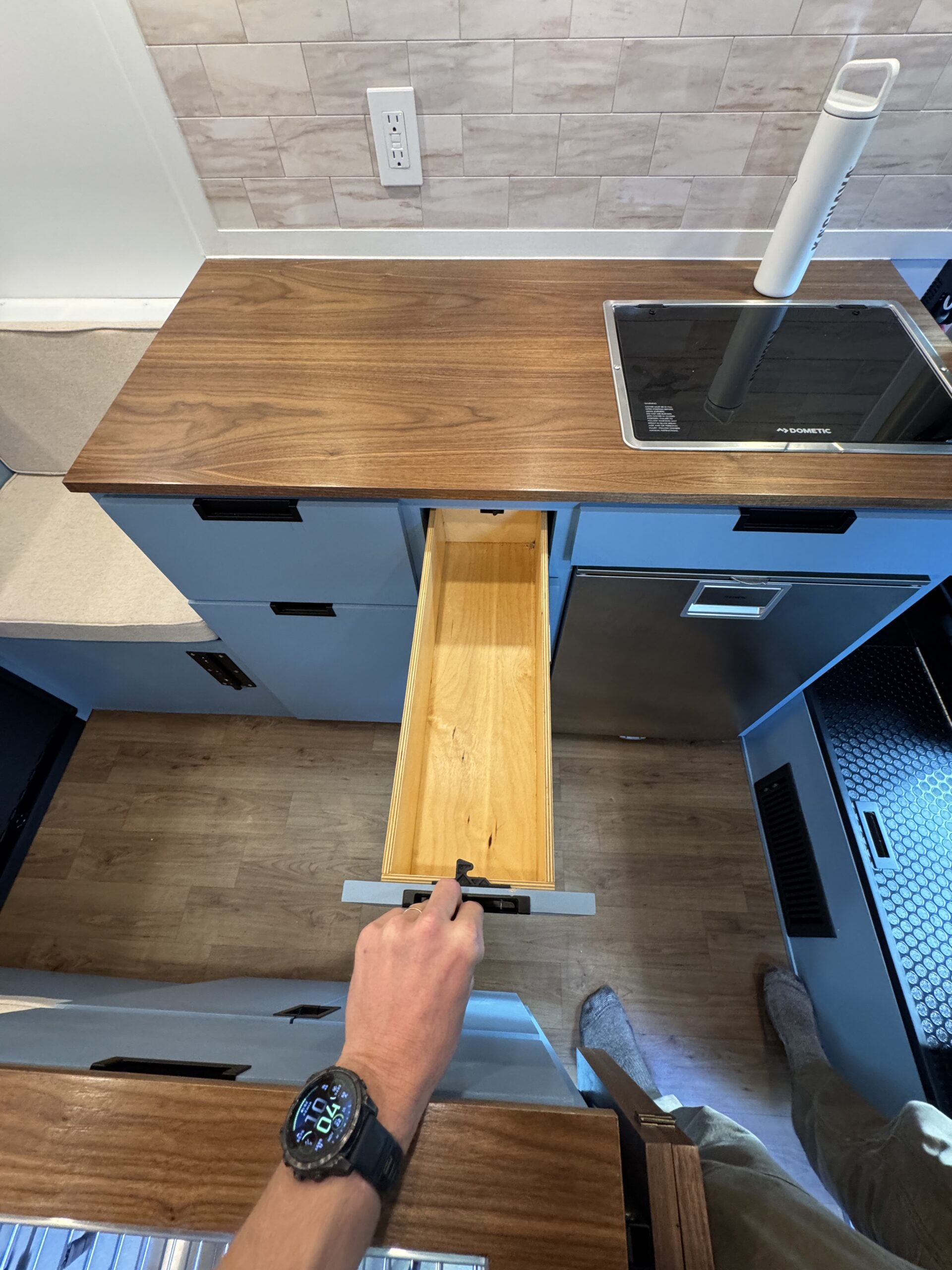 26-gallon recessed undermount grey water tank, with electric dump valve (custom from van life outfitters)