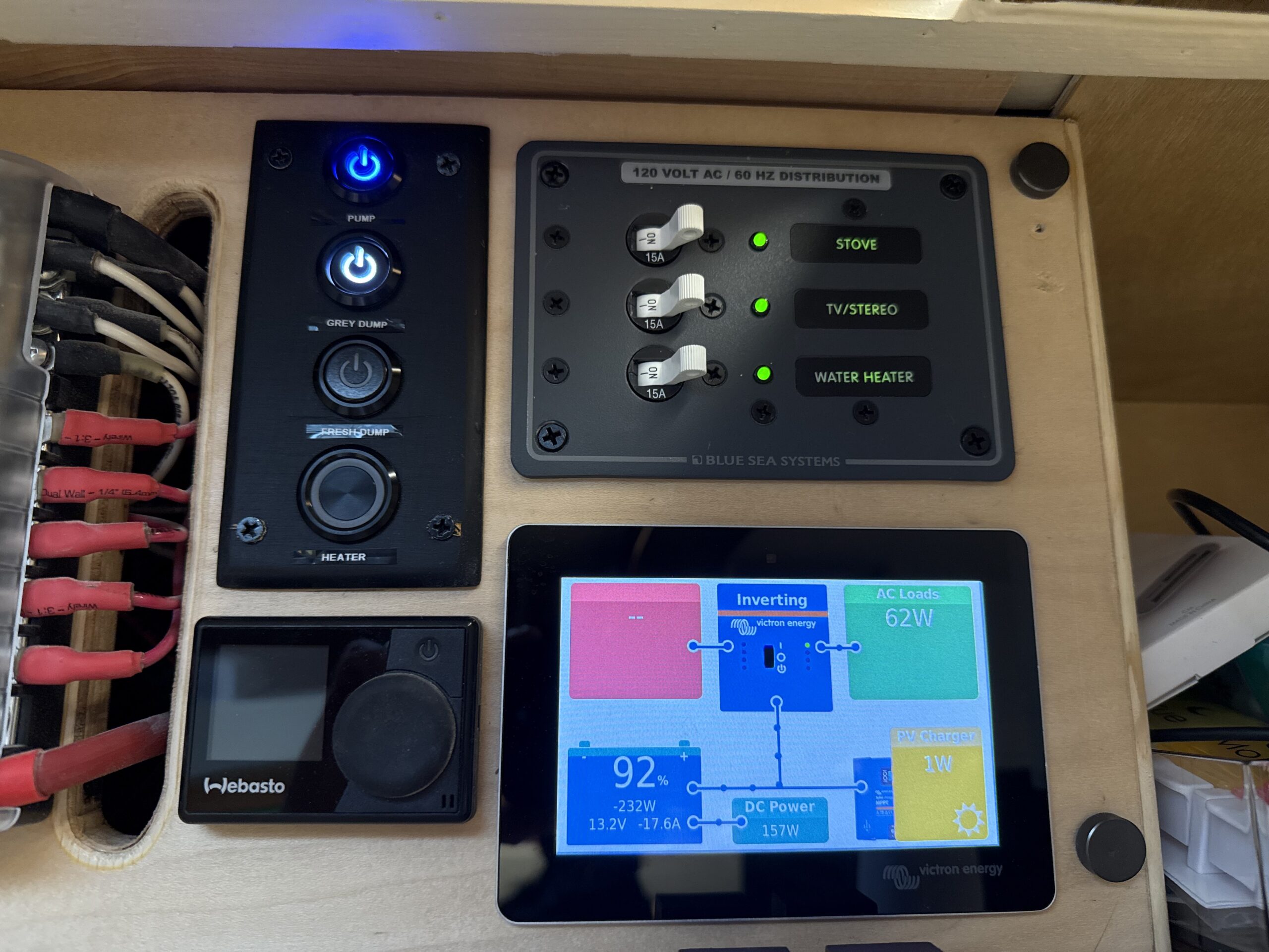 • 200W solar + full Victron monitoring suite (Touch 50, Cerbo GX, MPPT, Smart Shunt)