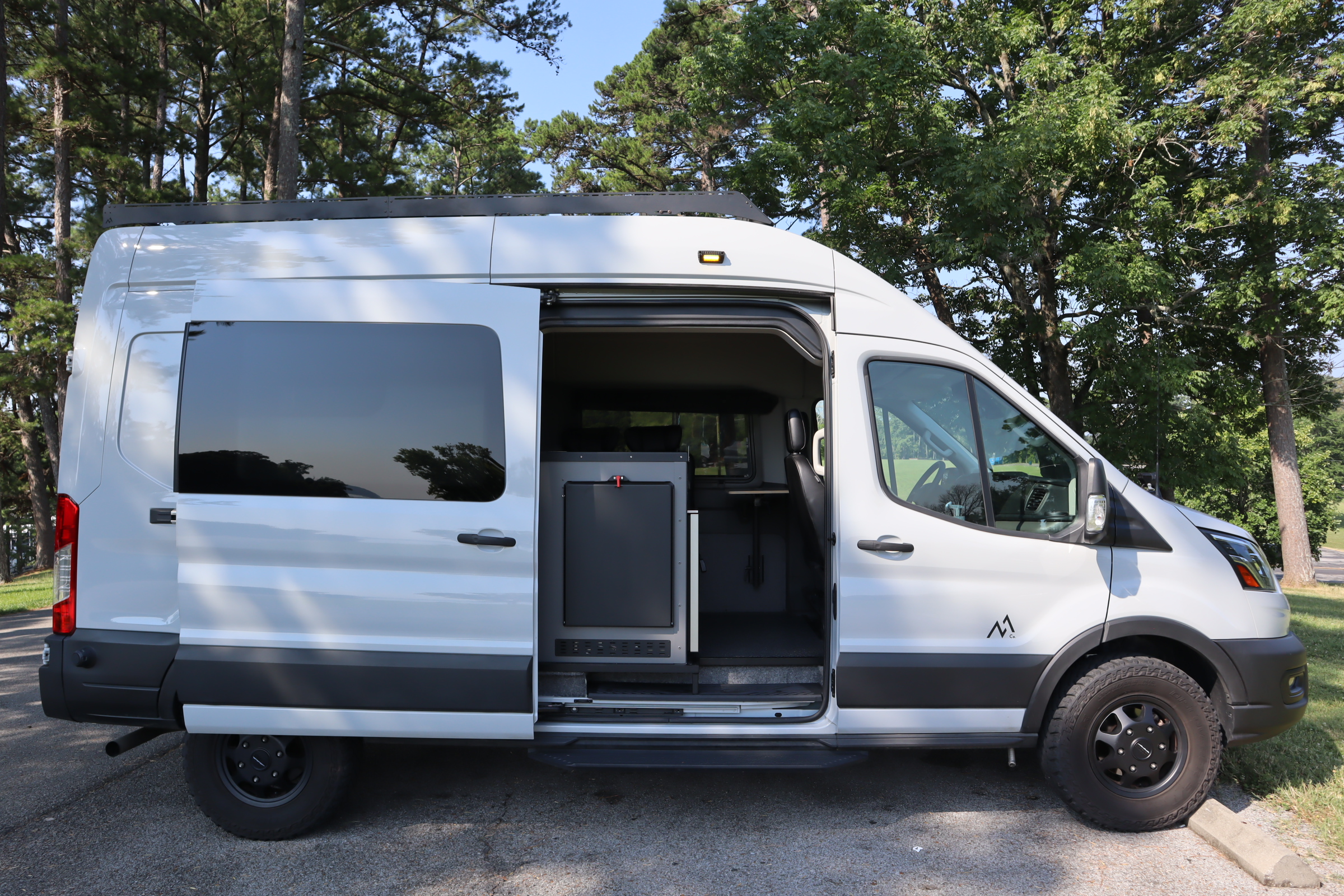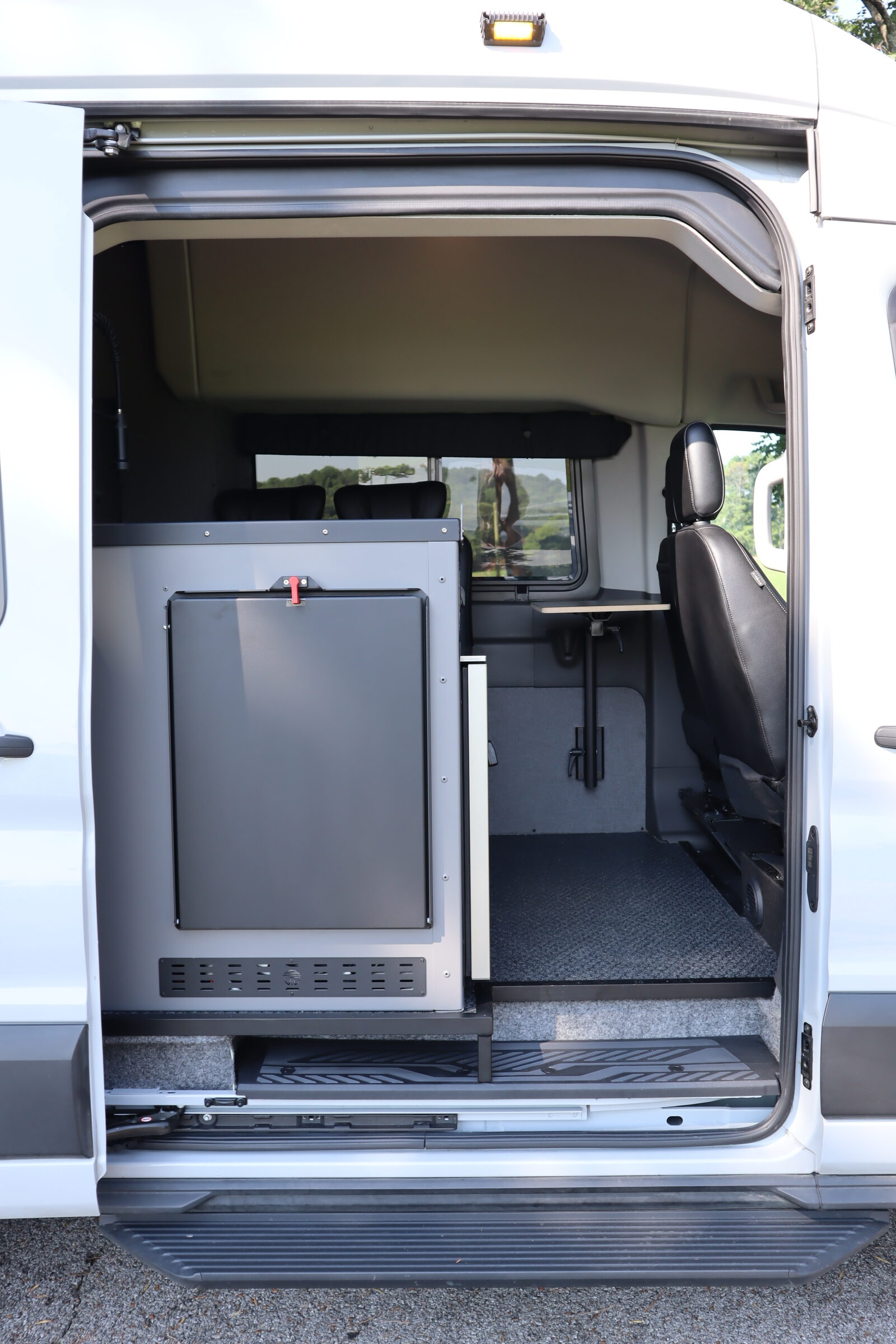 marine grade materials featuring an Indel fridge, sink, added fold down table and Lost Hiway tall fender boxes with a removable platform bed system with a custom Roam Rest mattress. From magnetic window covers, Limitless Vans swivel seat base, and black anodized L-Track, to Van Compass stage 3 suspension, front hitch, and skid plate, and Method wheels and all terrain tires with matching spare - this build is thoughtfully designed with functional details inside and out.