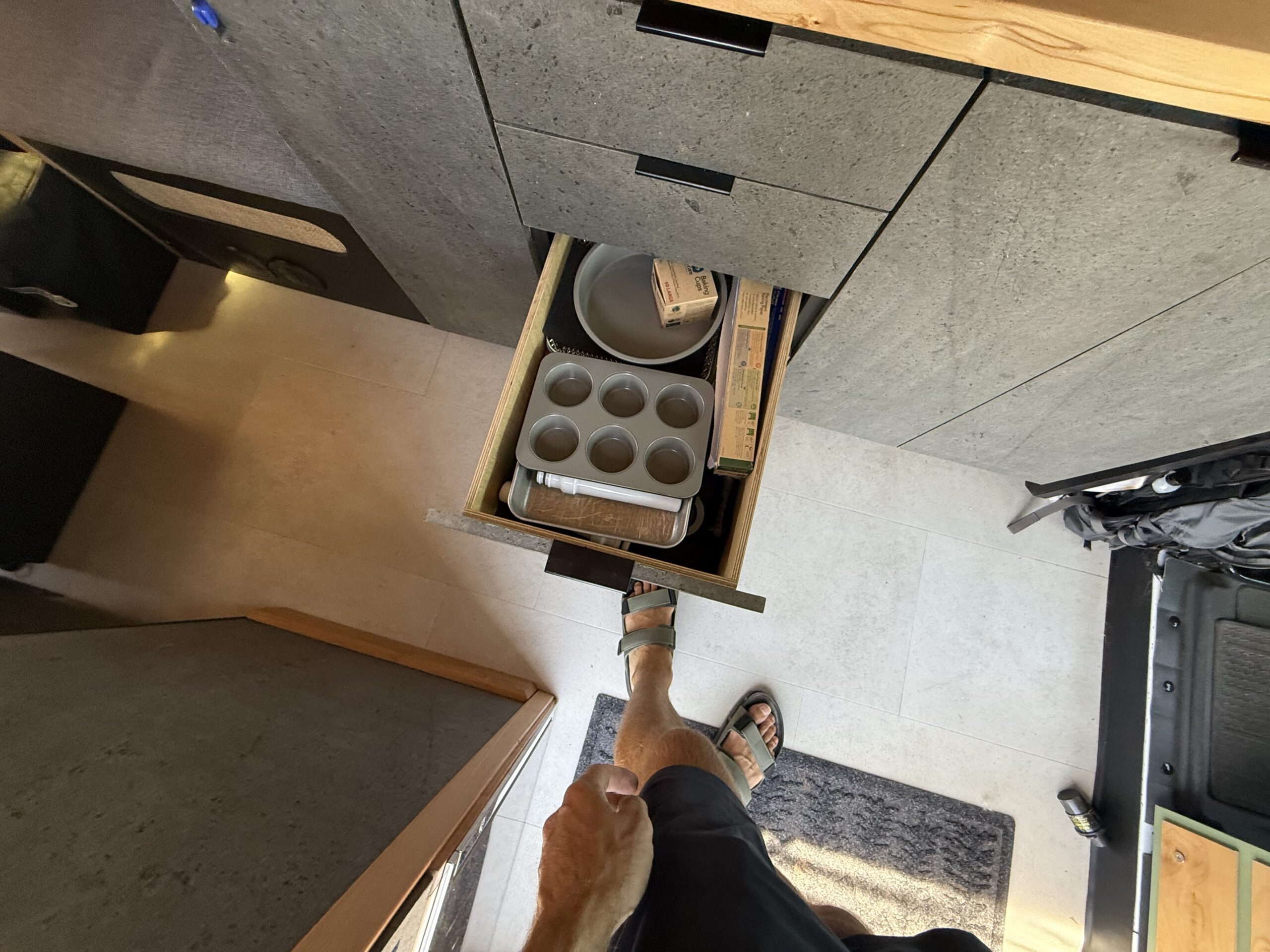 - LVT flooring + full slat bed w/ custom 2-piece mattress and bench cushions